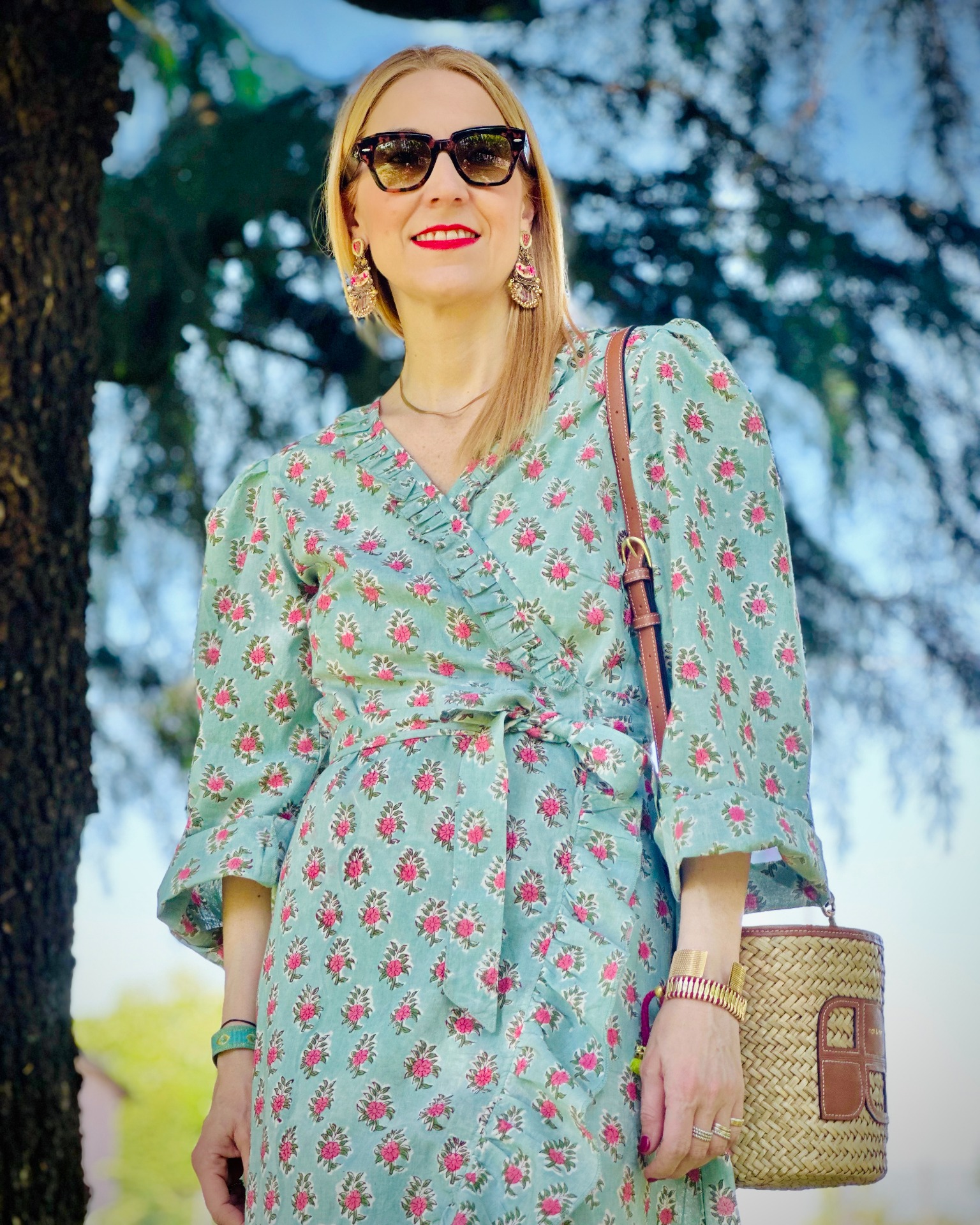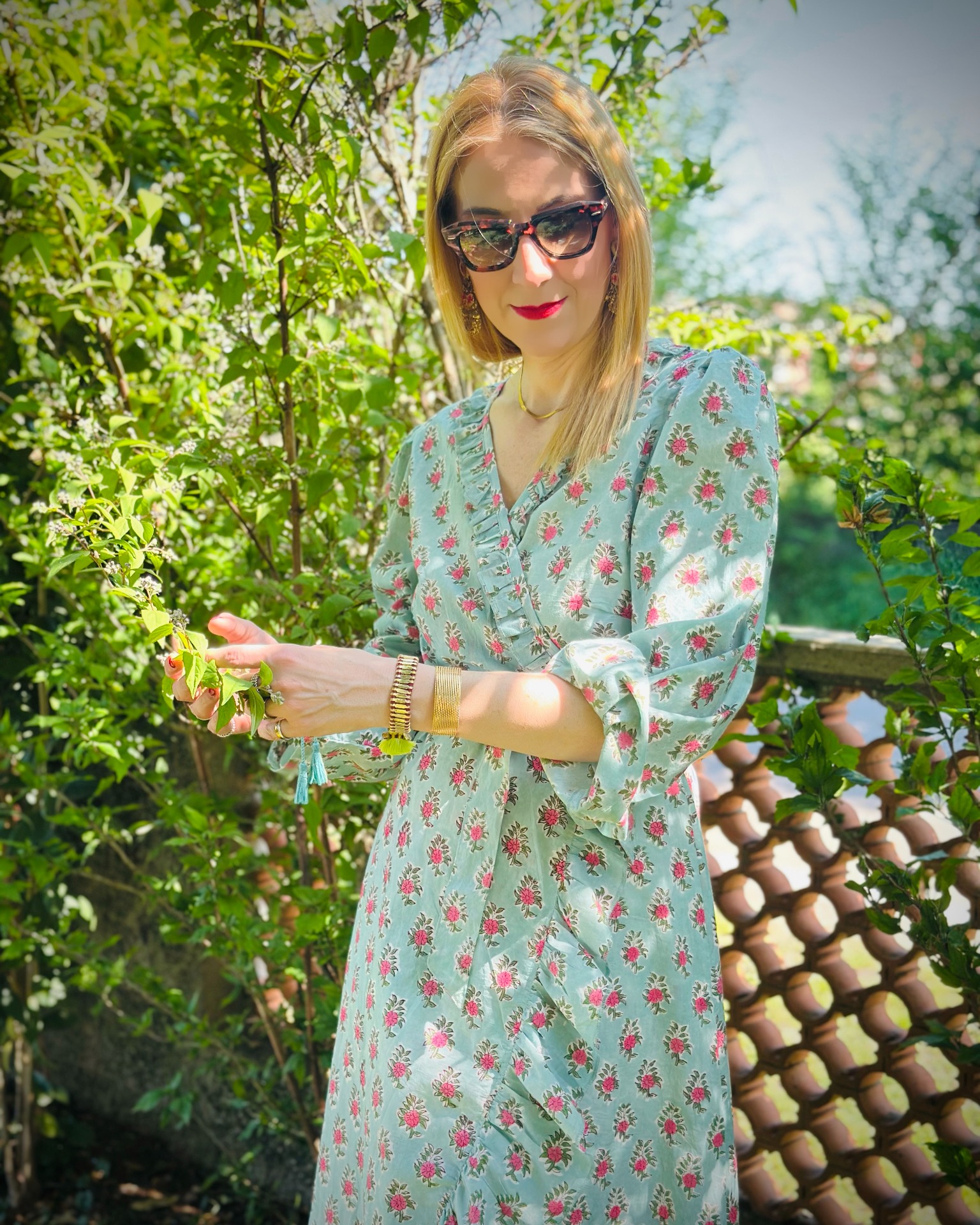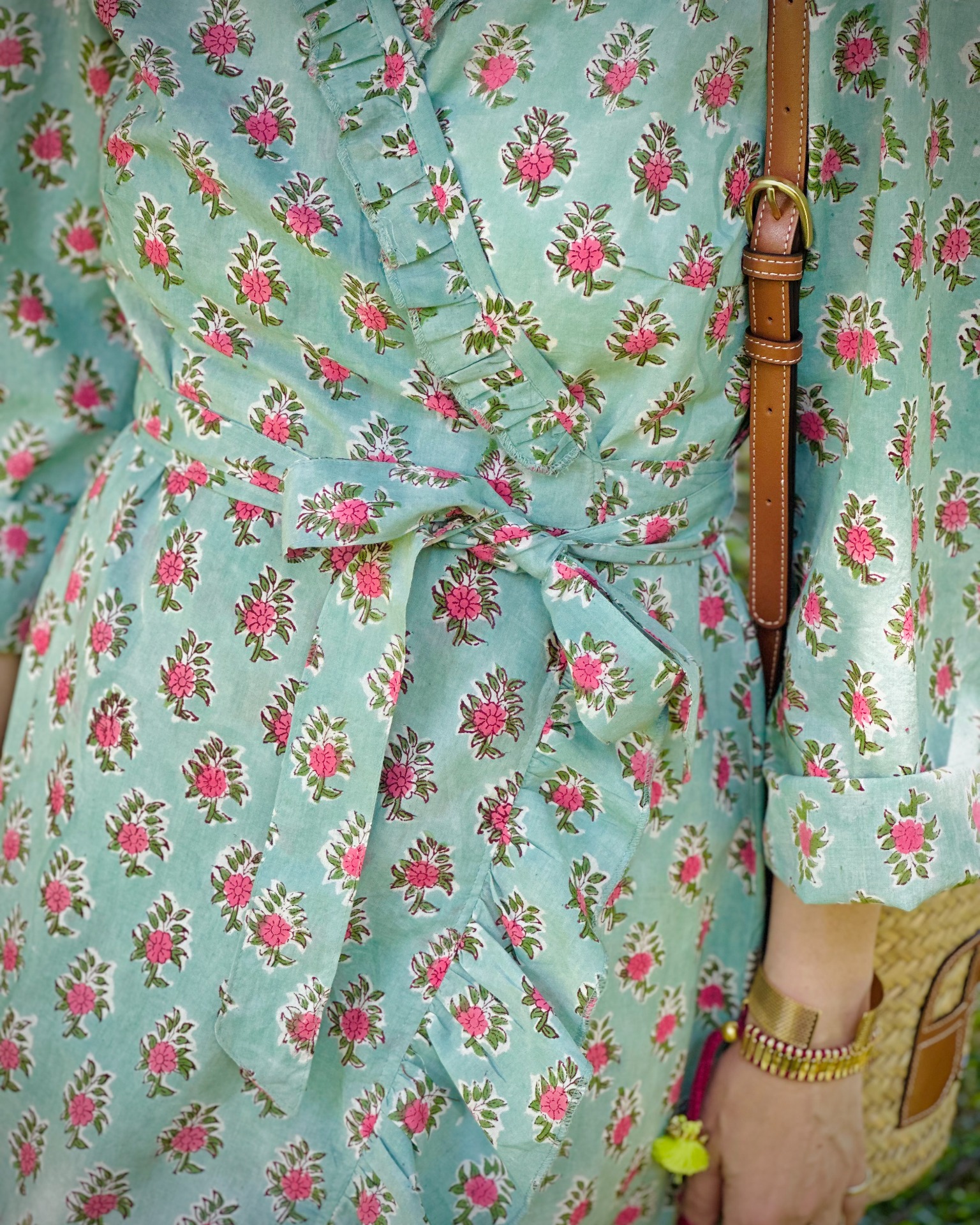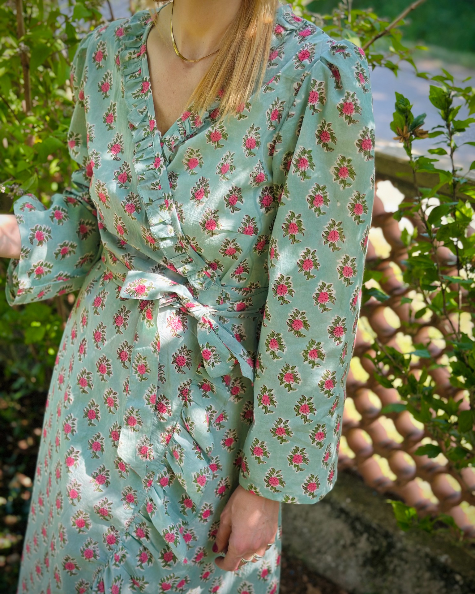 Abito in 100% cotone, stampato a mano, linea incrociata con volant che dona movimento e femminilità. Chiusura con laccio in vita, pensato per adattarsi a diverse fisicità.
