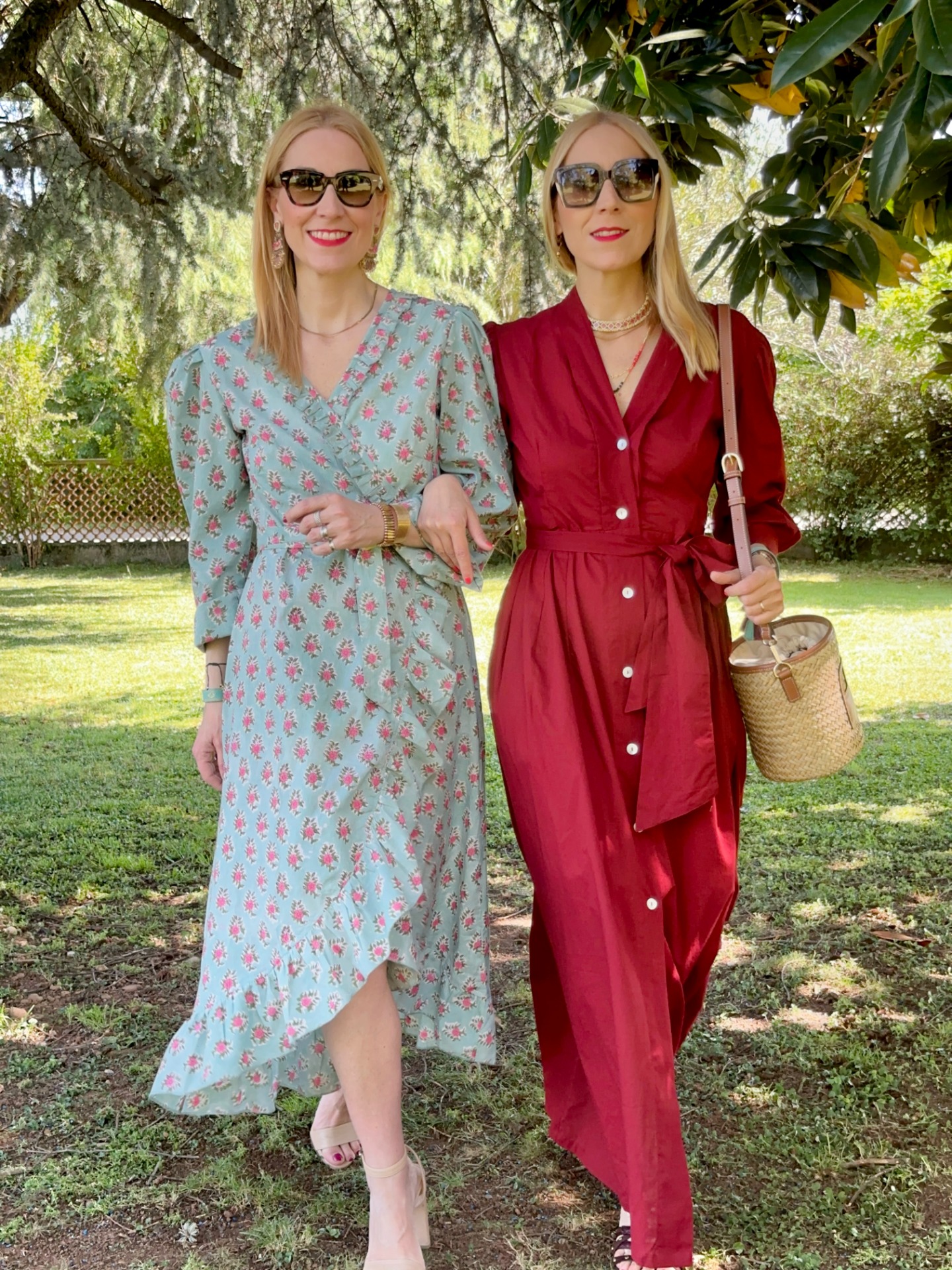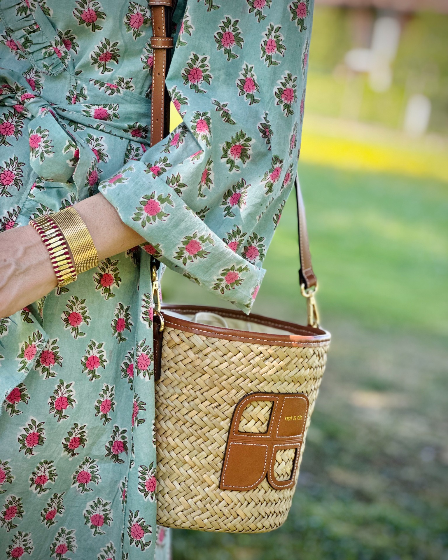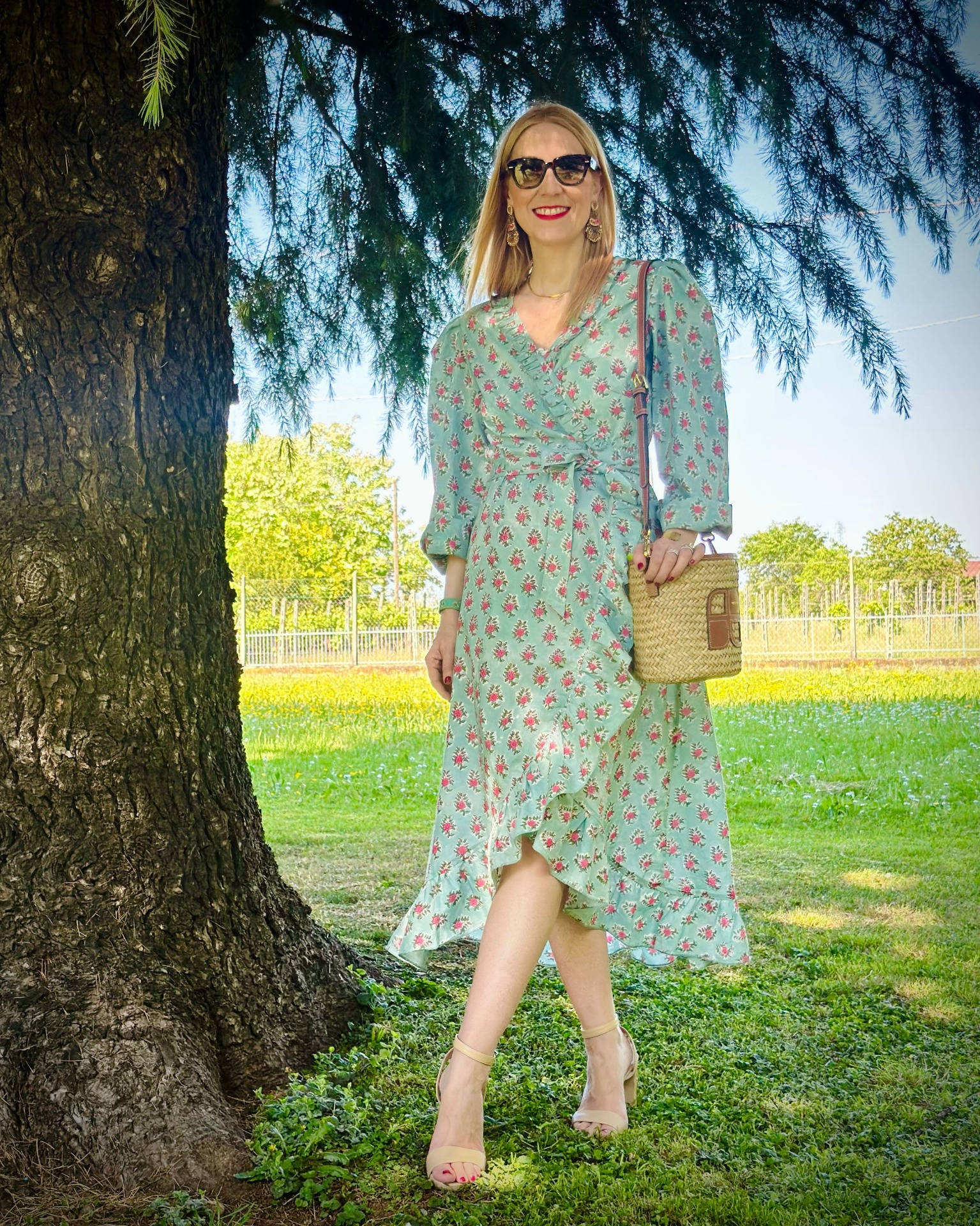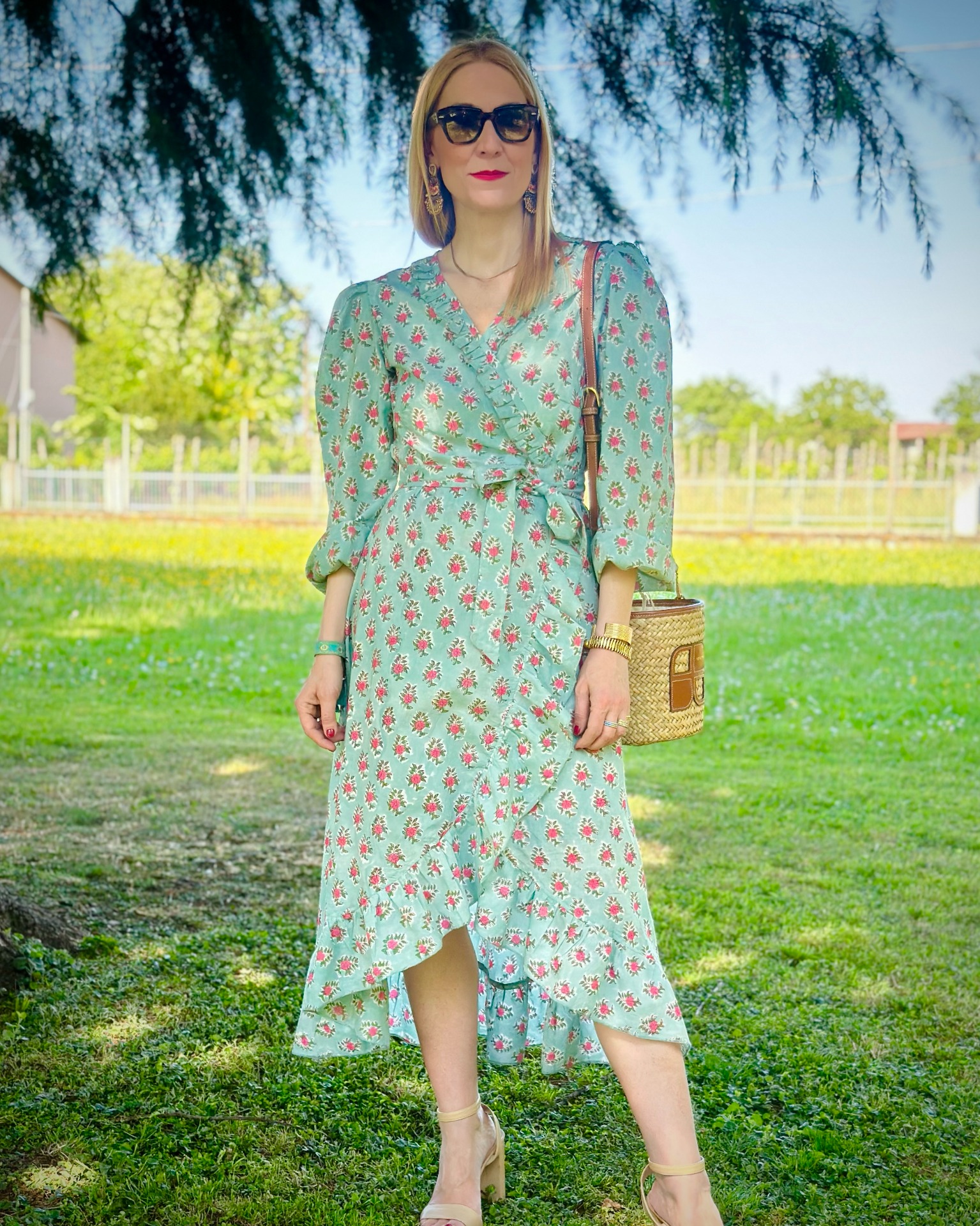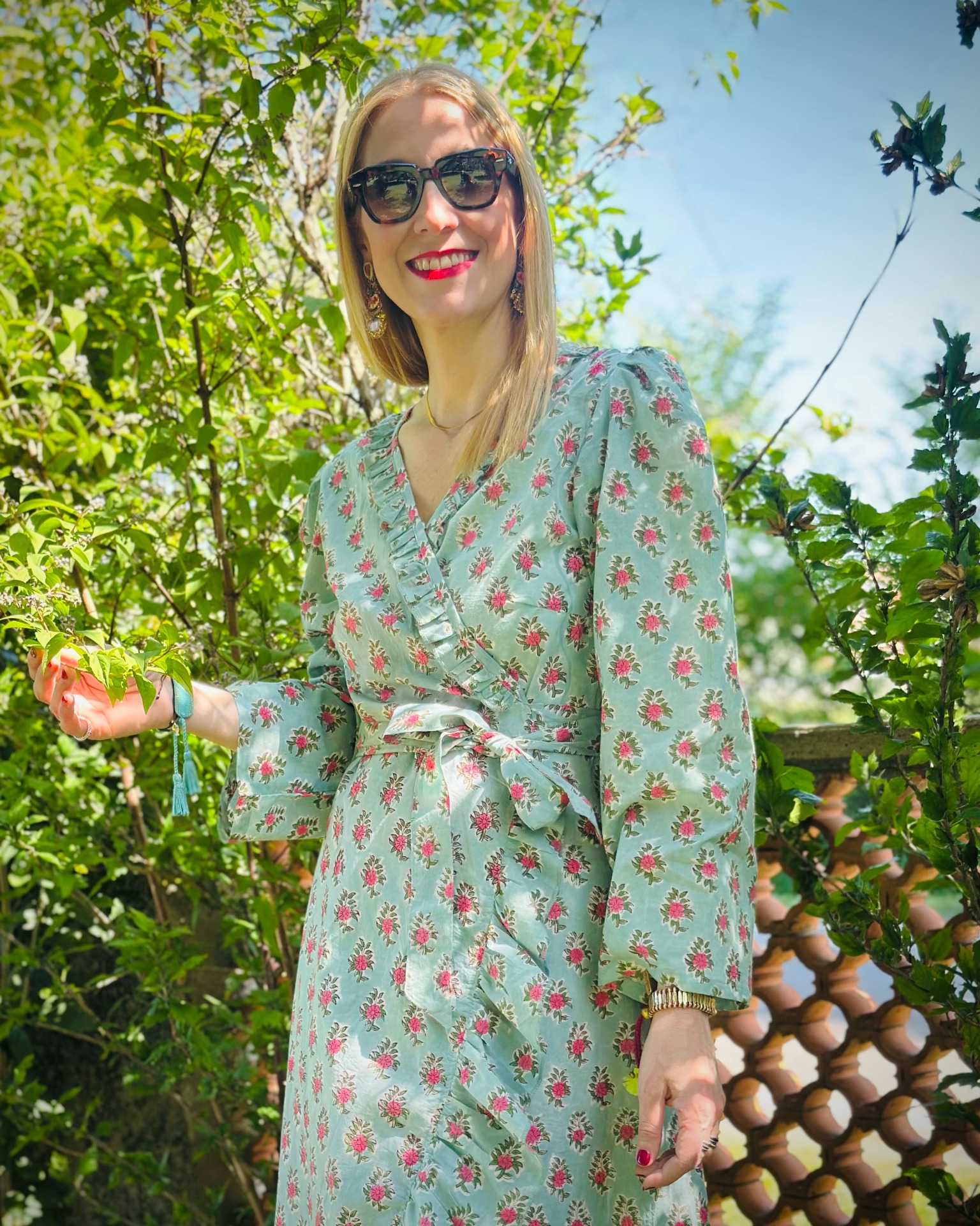 Abito in 100% cotone, stampato a mano, linea incrociata con volant che dona movimento e femminilità. Chiusura con laccio in vita, pensato per adattarsi a diverse fisicità.