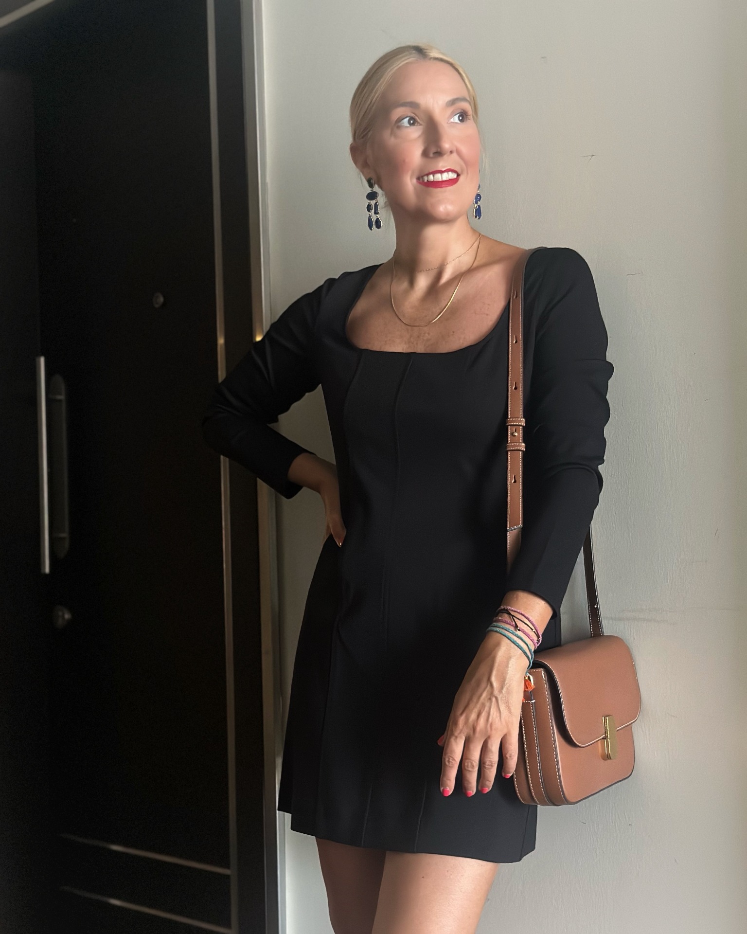 Abito corto nero con ampio scpllo. Materiale 68% viscosa, 27% nylon, 5% elastan.