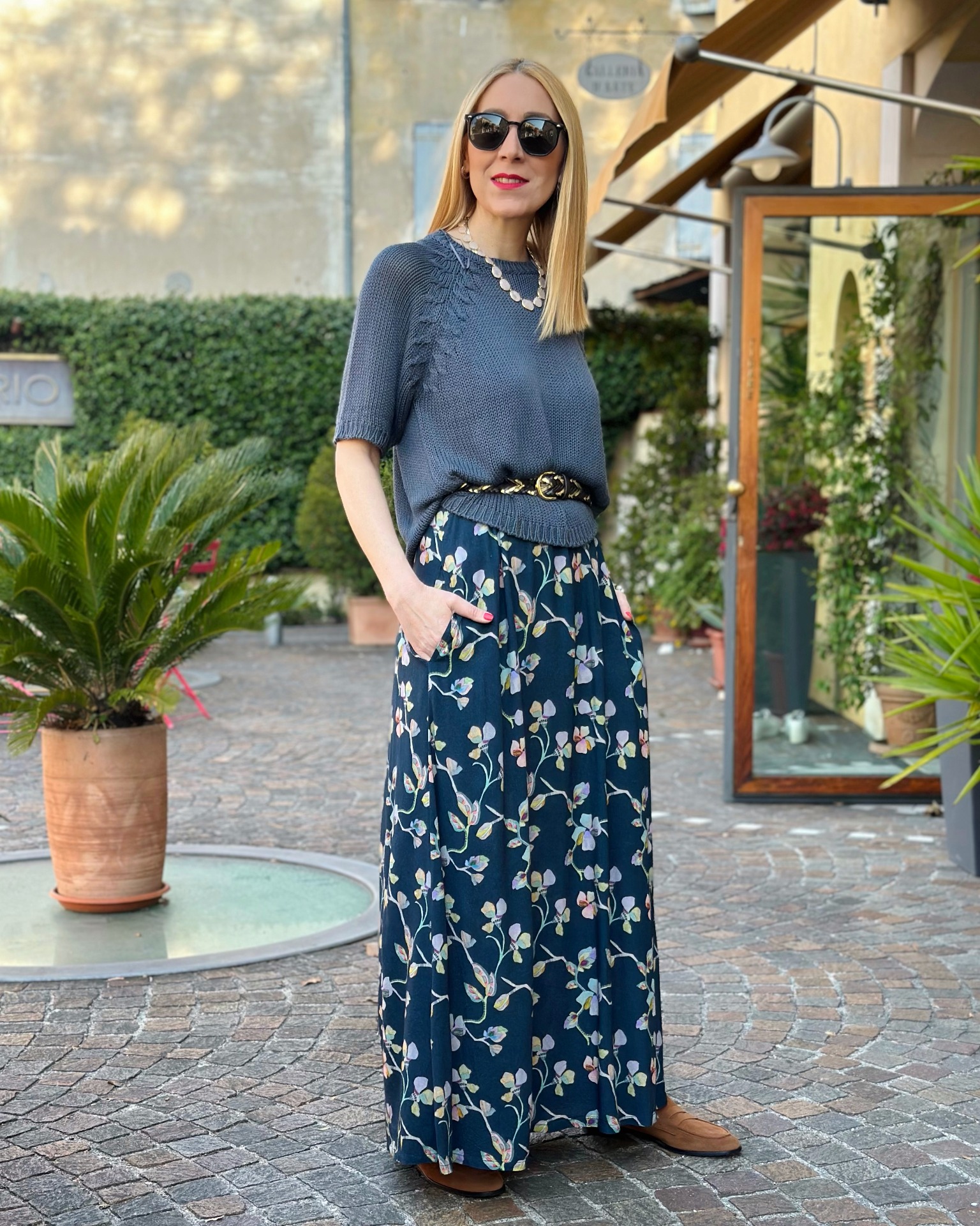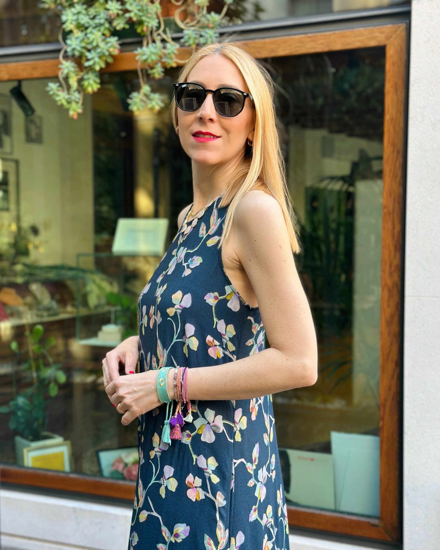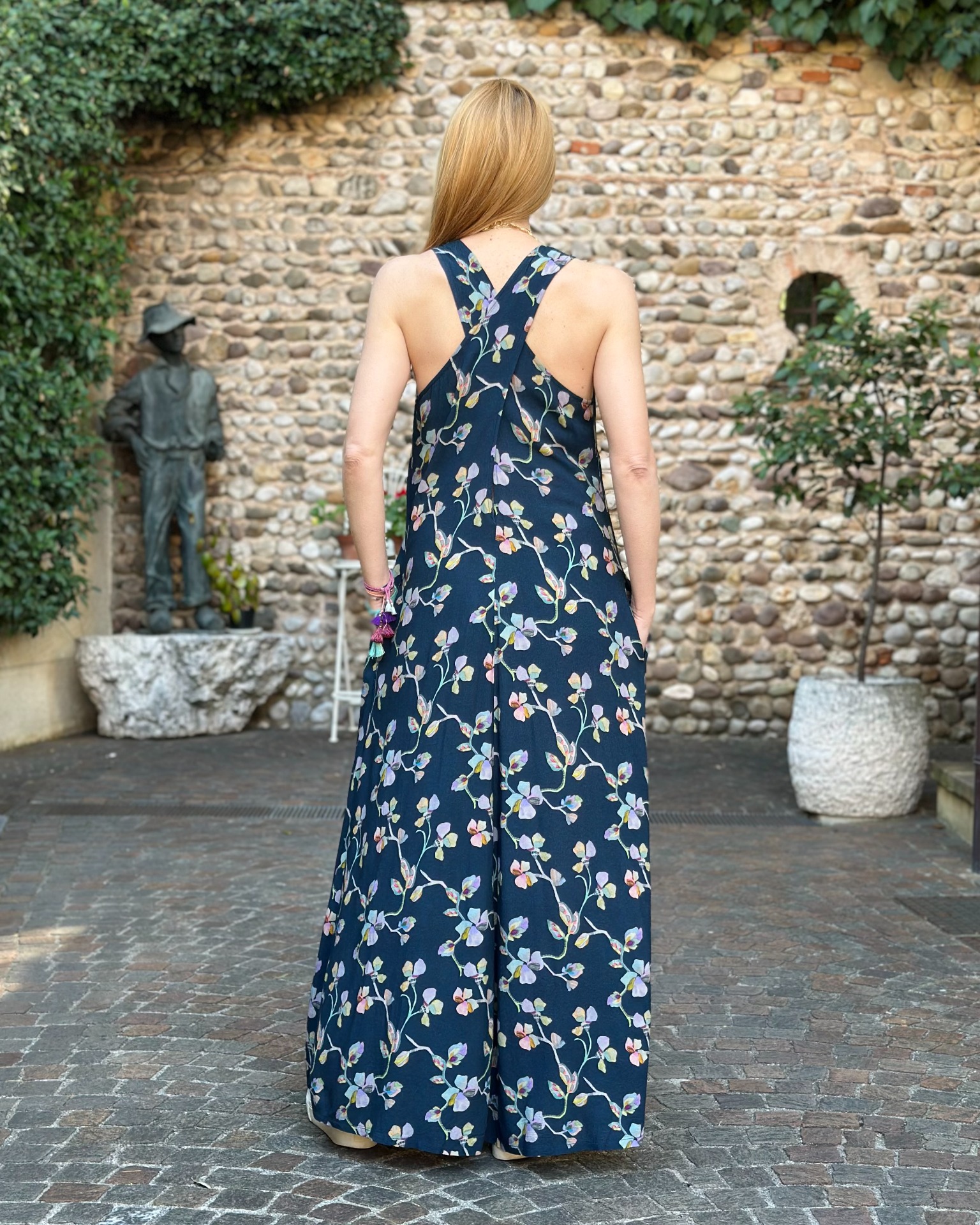 L' abito lungo in viscosa a stampa floreale presenta uno scollo incrociato sulla schiena. Aderente nella parte alta e ampio nella parte inferiore.
