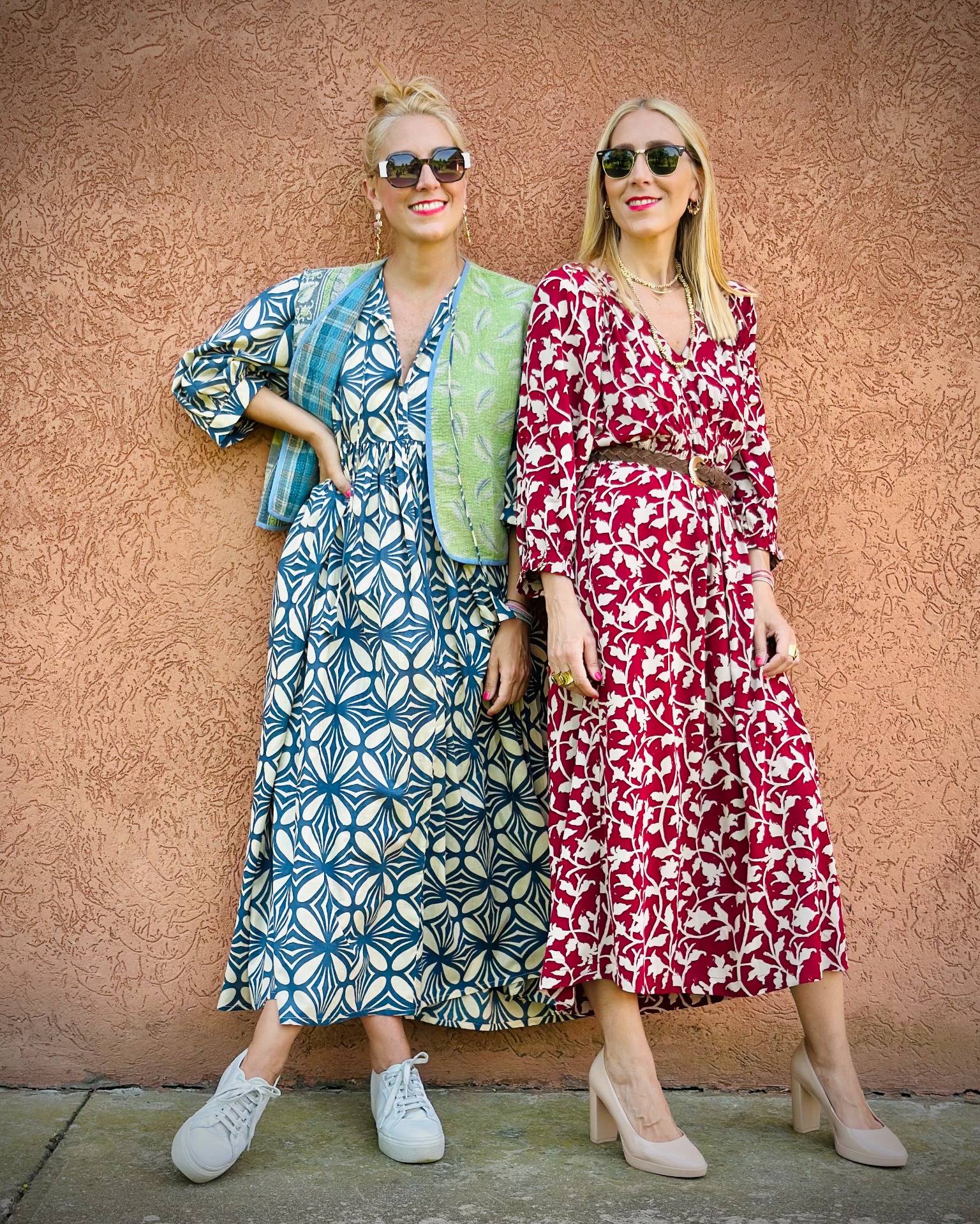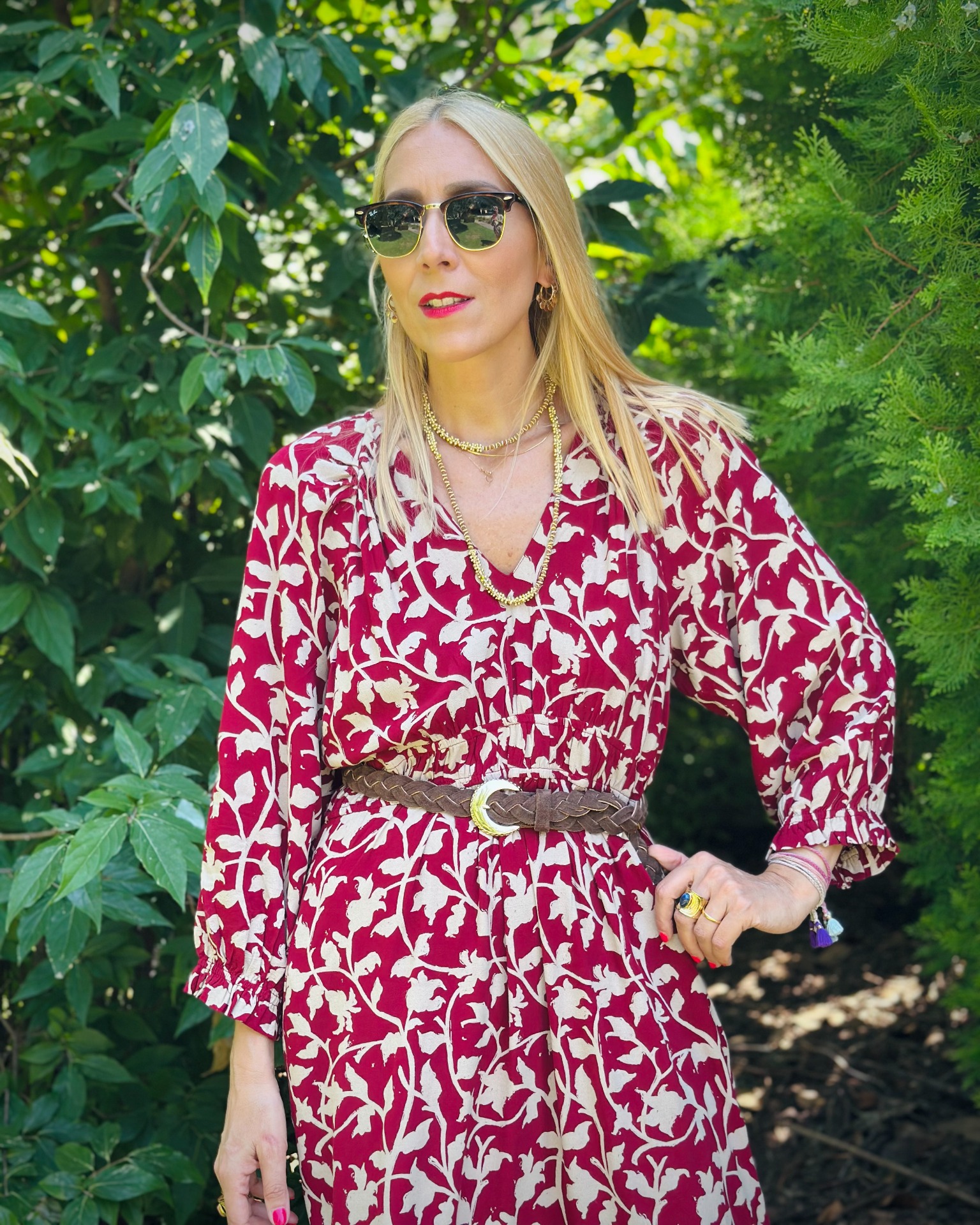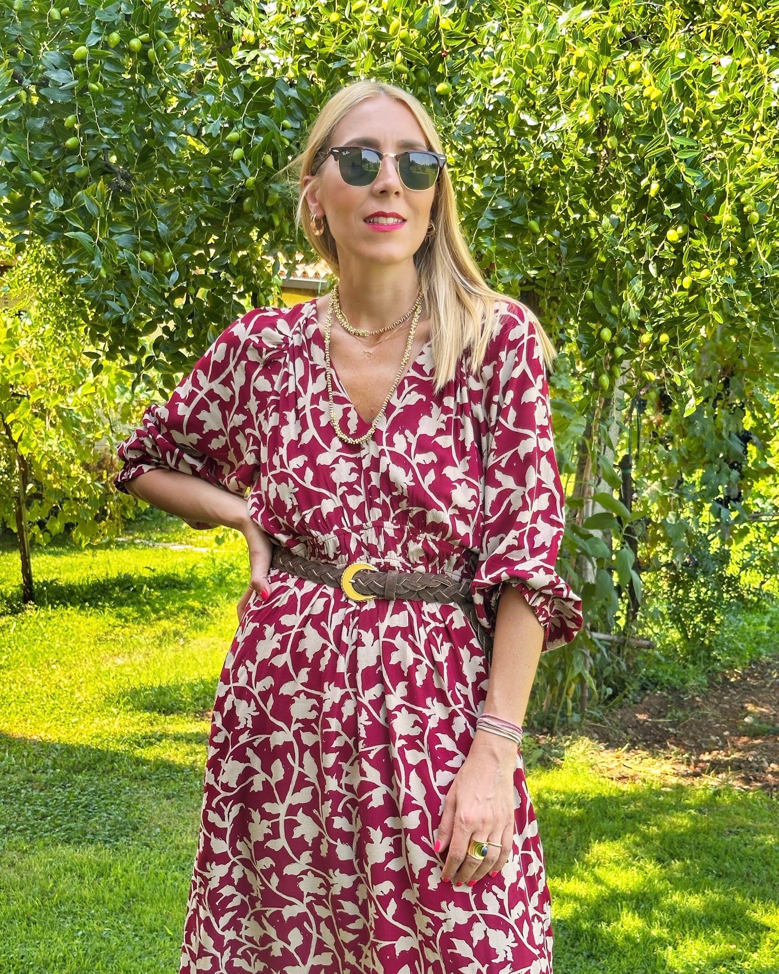 Abito scollo V, colore borgogna/ecrù, manica lunga, 100% viscosa.