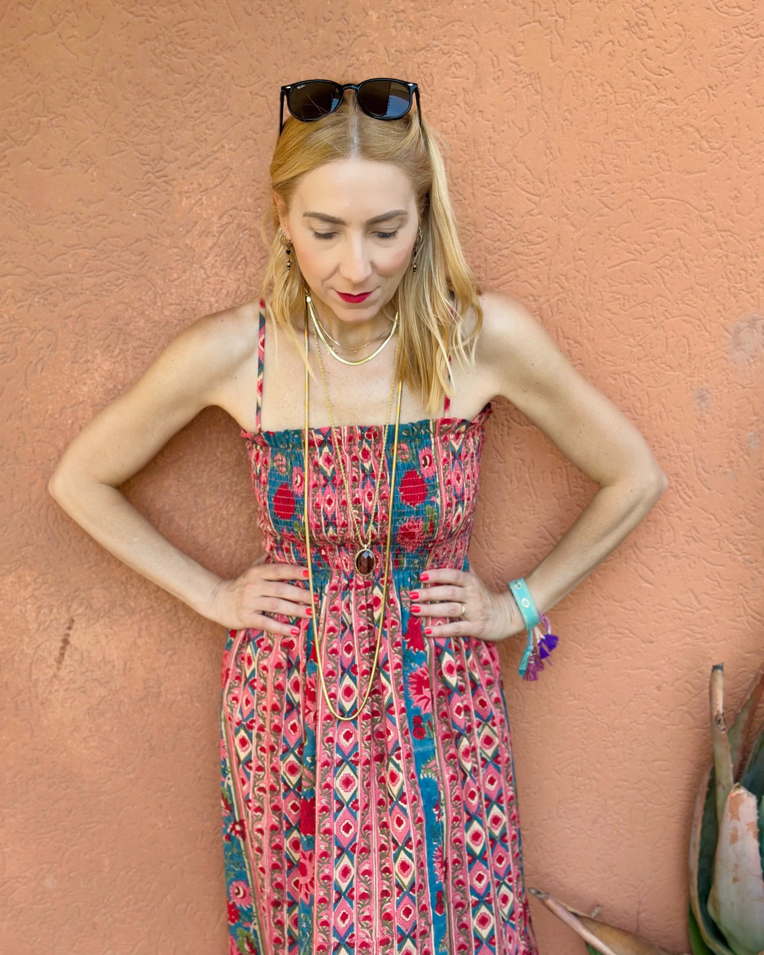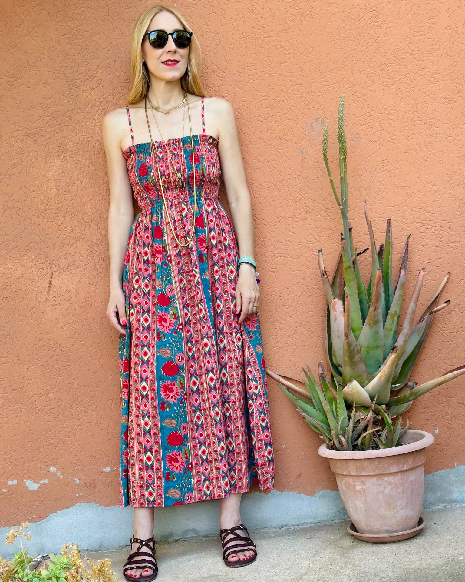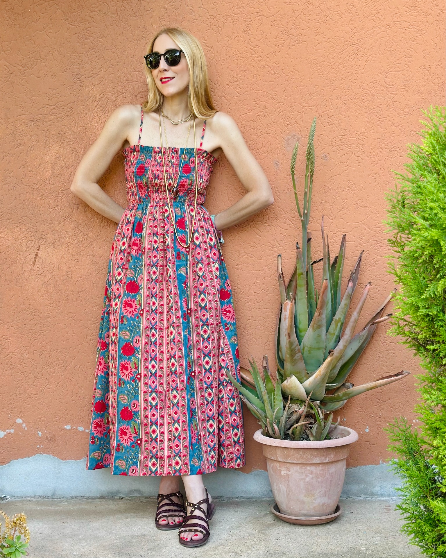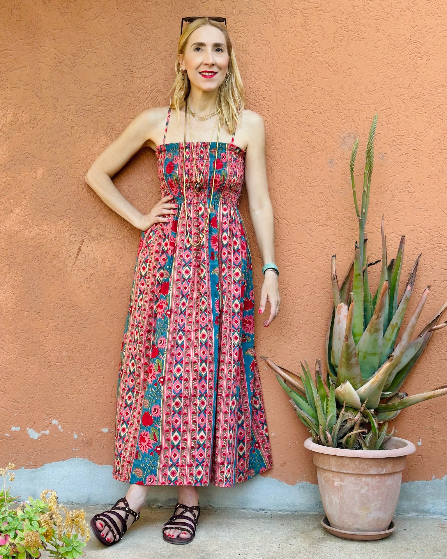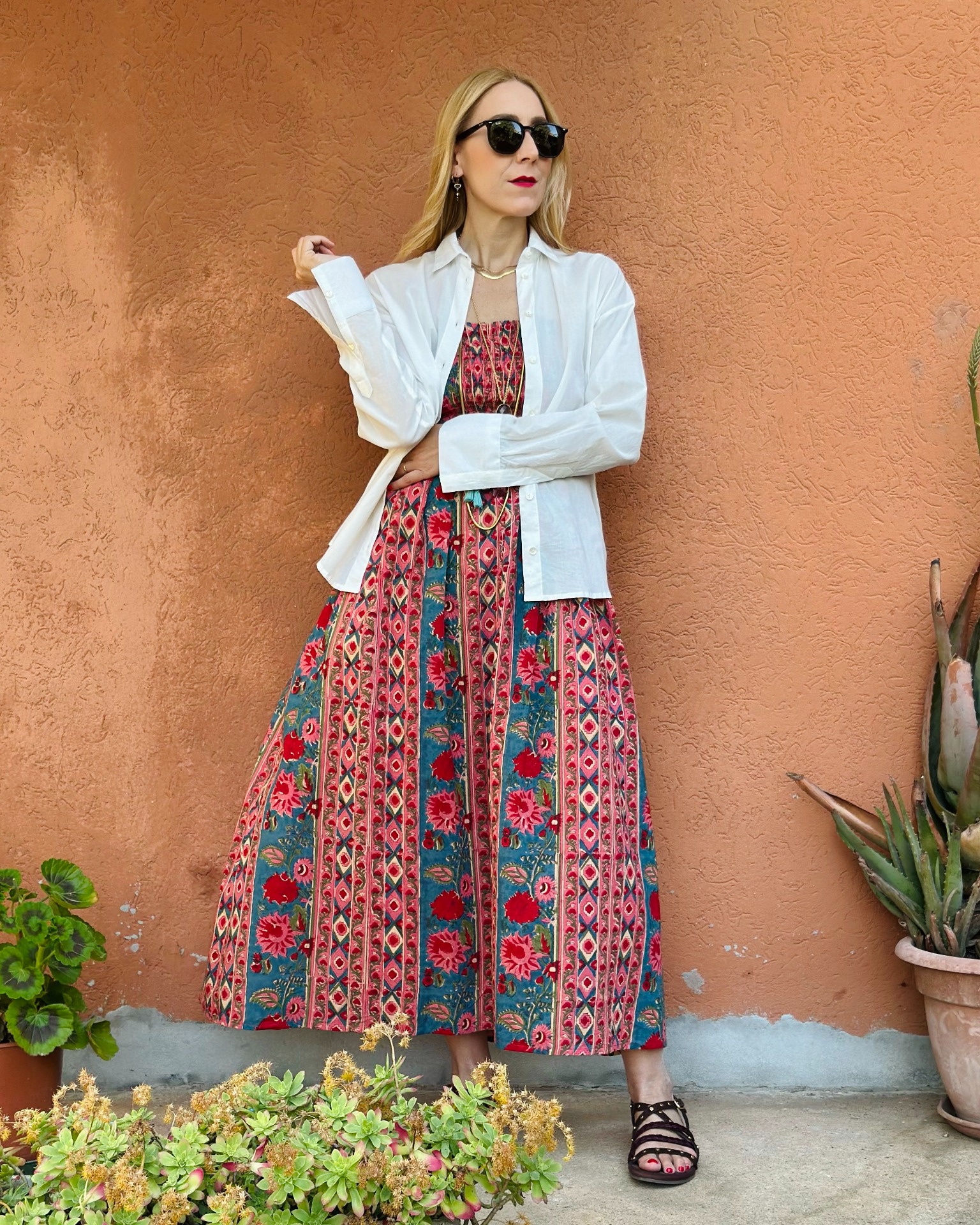 Abito in 100% cotone stampato a mano, base pavone arricchita da motivi floreali-geometrici rosso e corallo. Il corpetto completamente elasticizzato si adatta con naturalezza, le spalline sono regolabili.