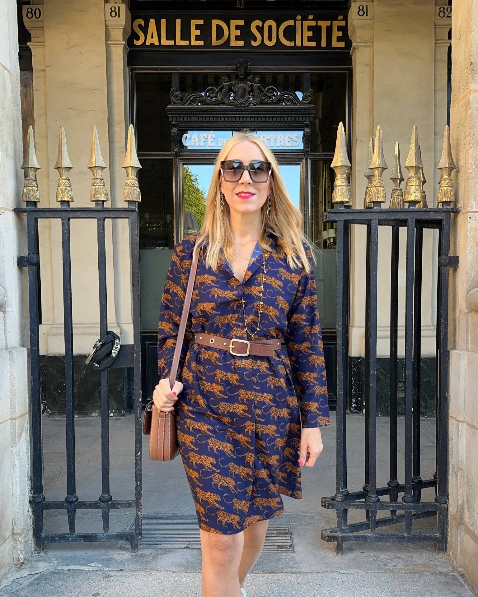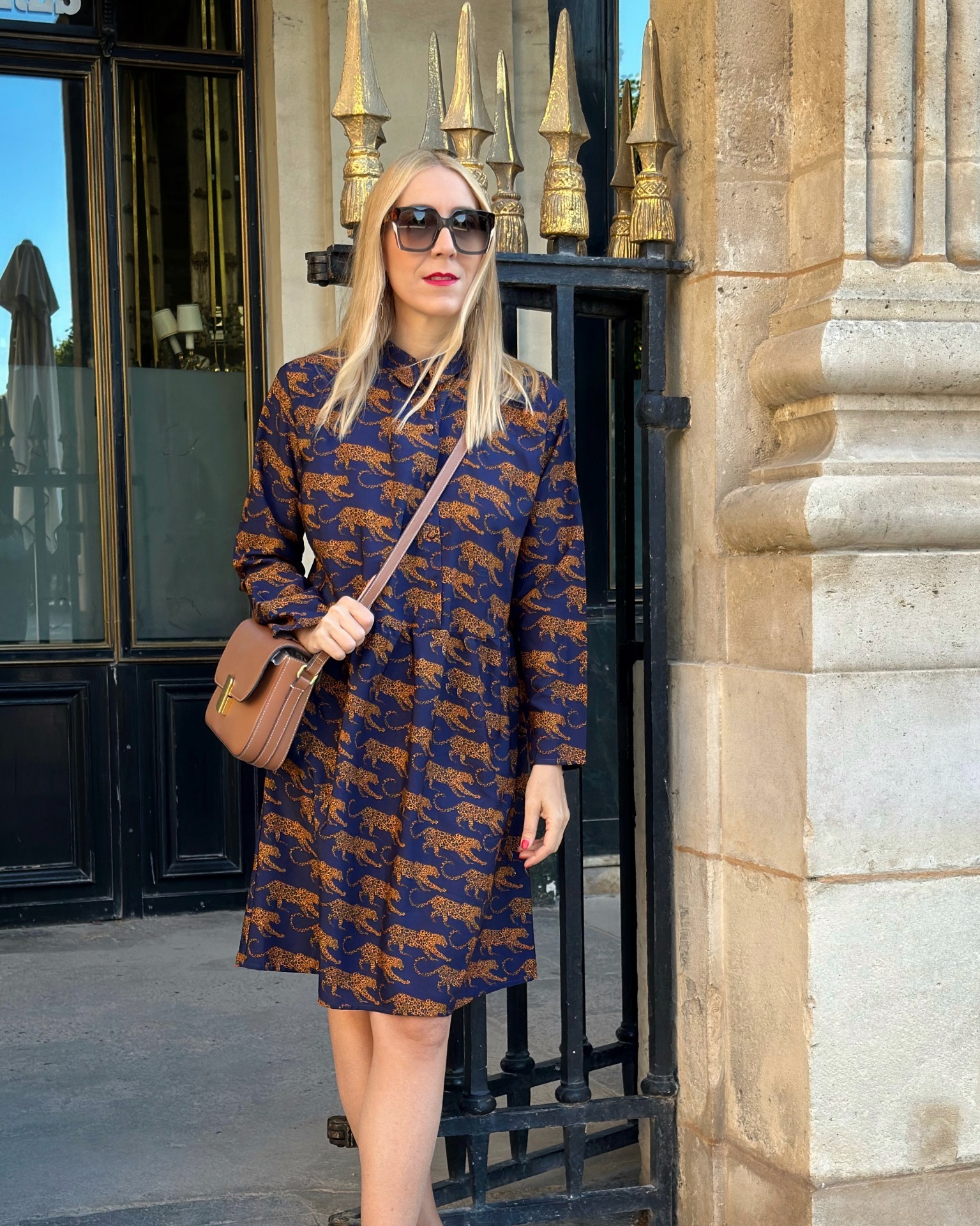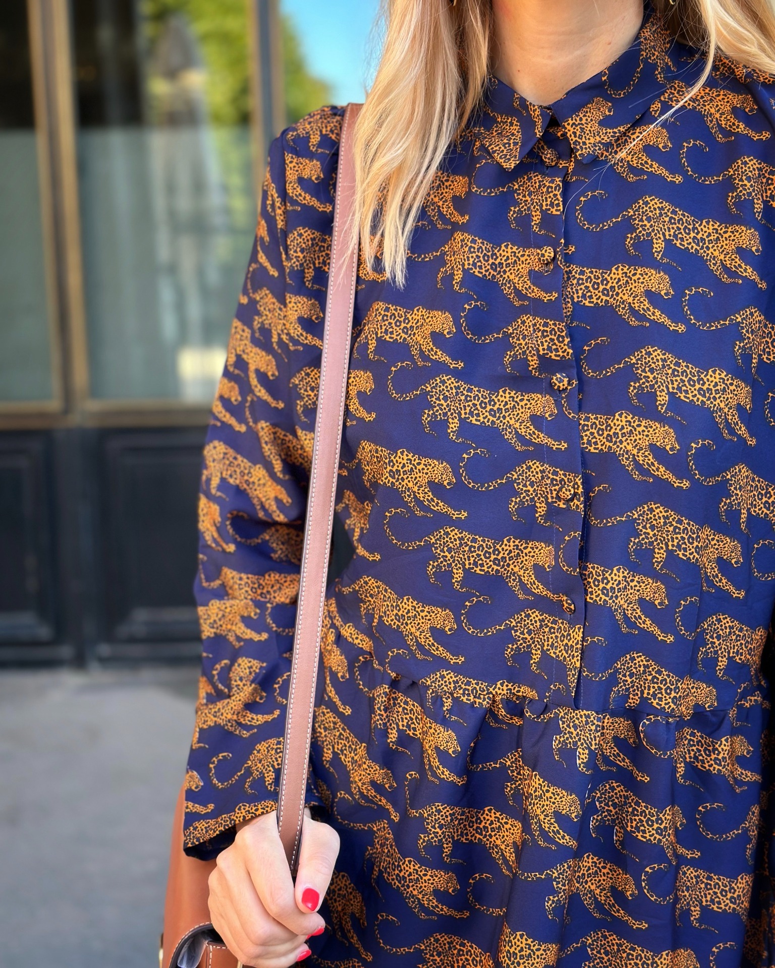 Abito con colletto e bottoni rivestiti. Fondo blu, ghepardi giallo/oro. Materiale 100% viscosa.