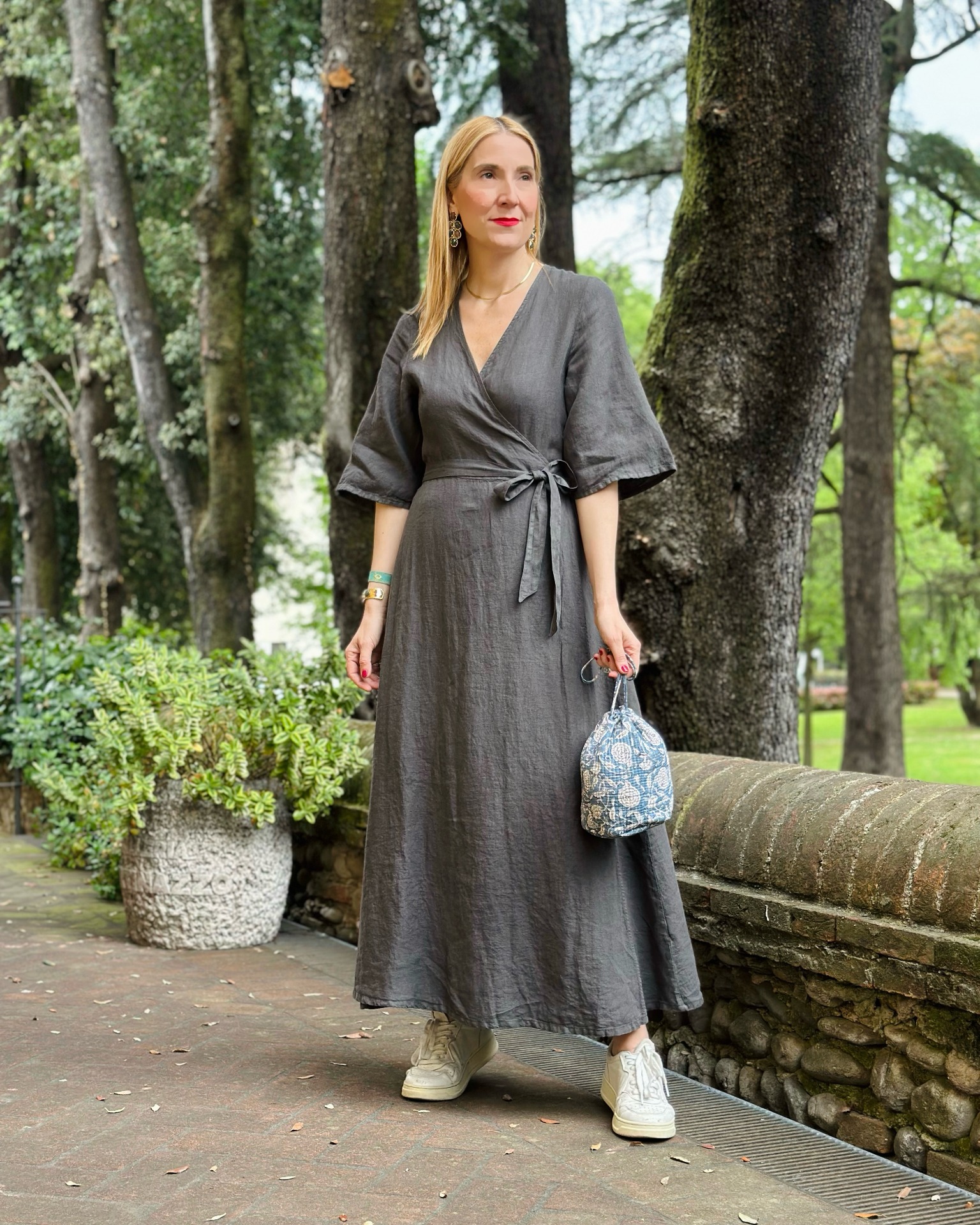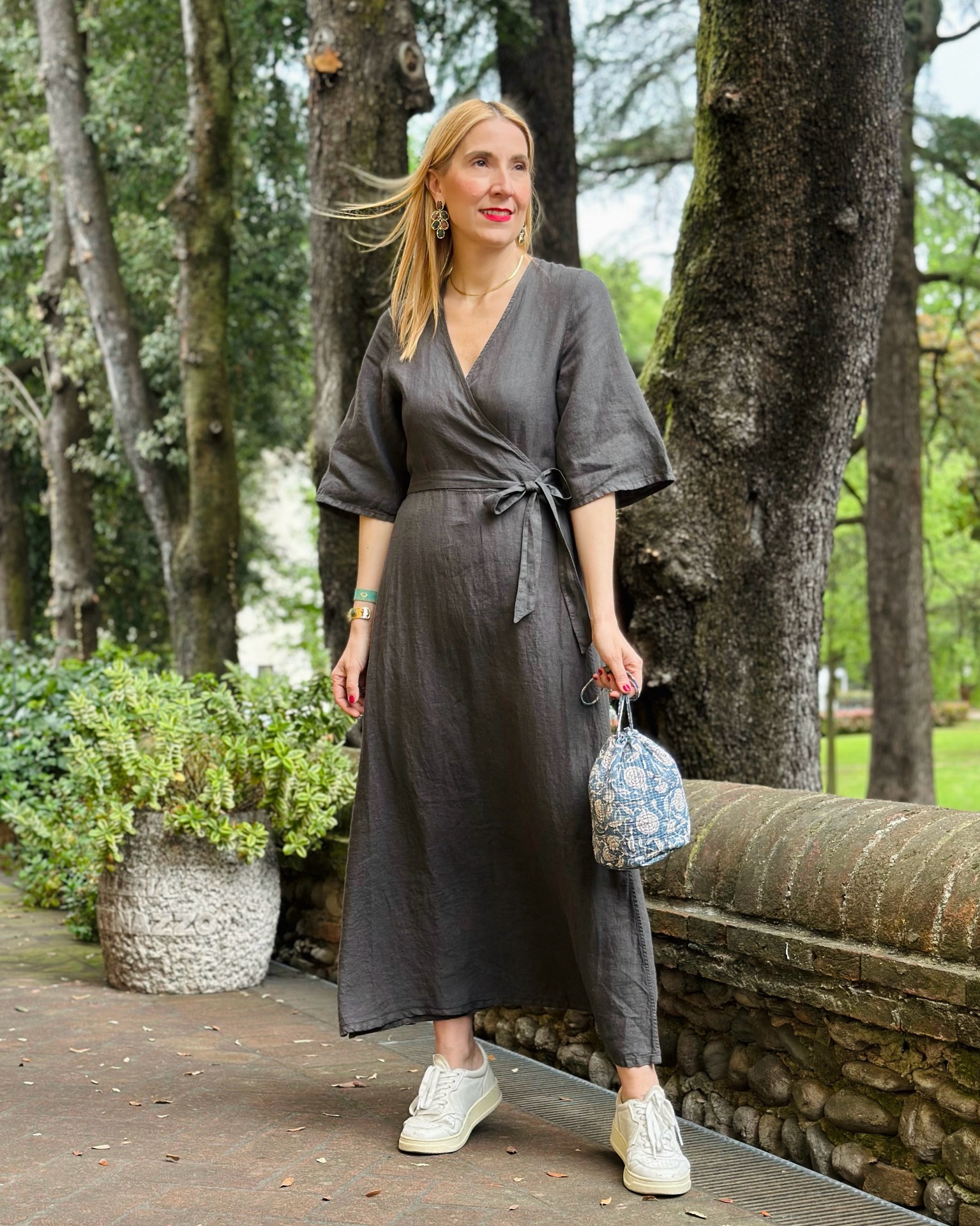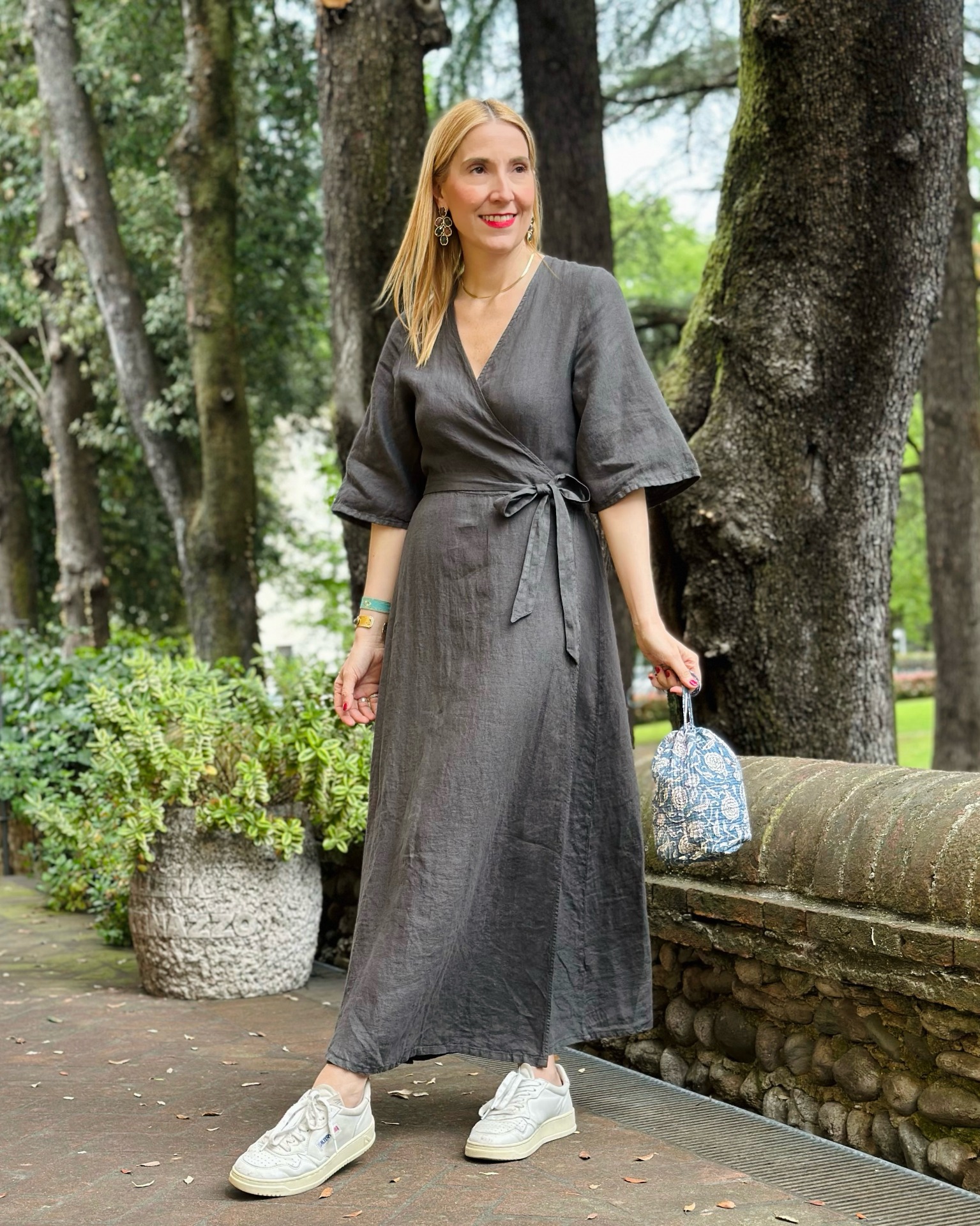 L' abito incrociato in lino 100% ha le maniche corte, scollo a V e gonna svasata.