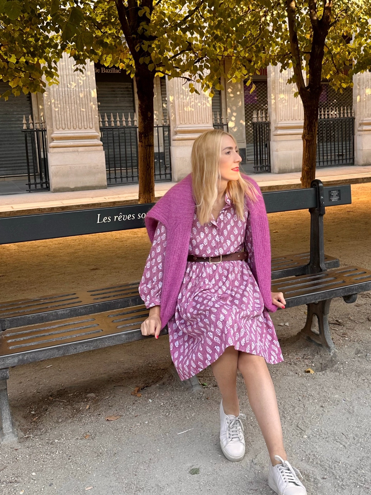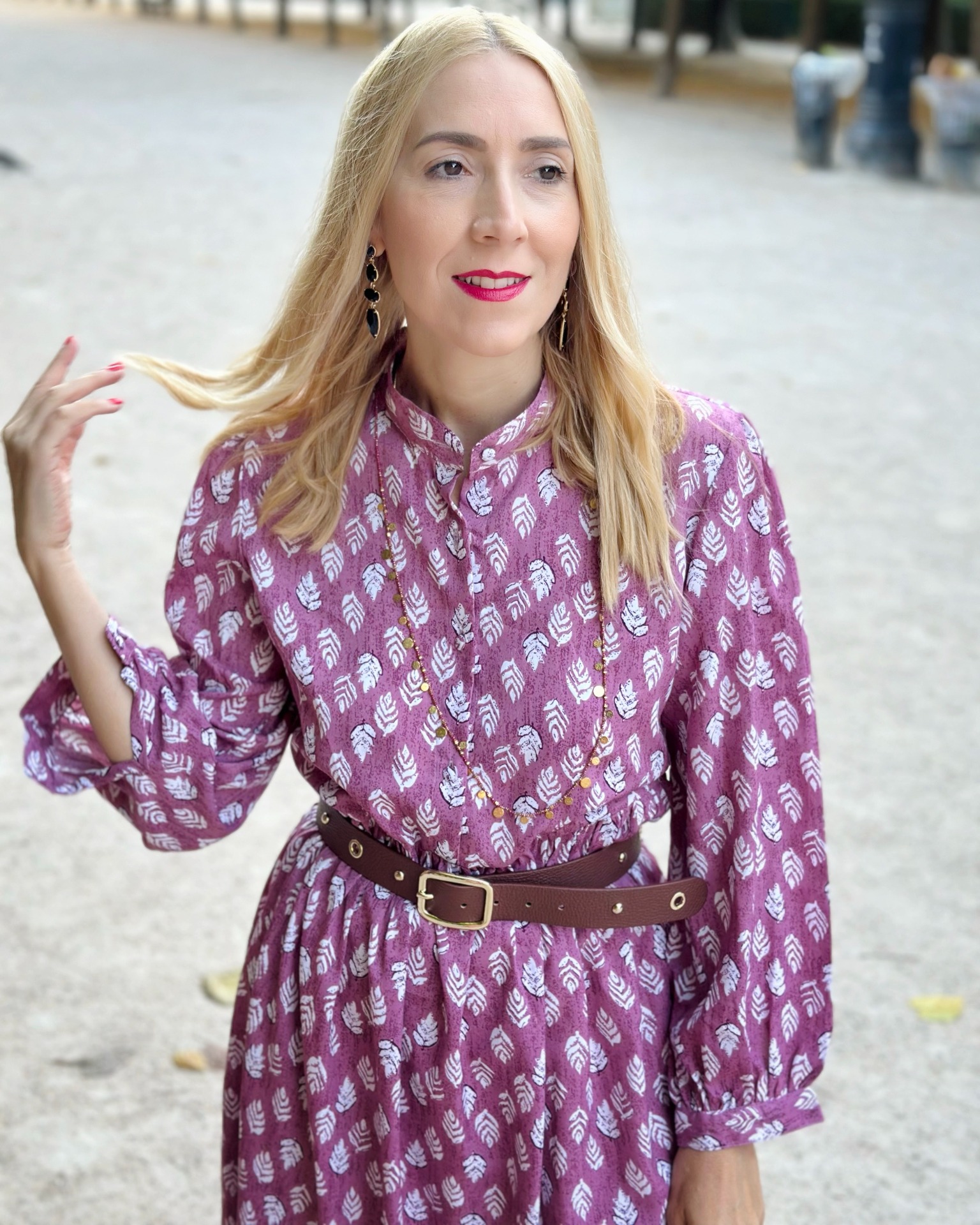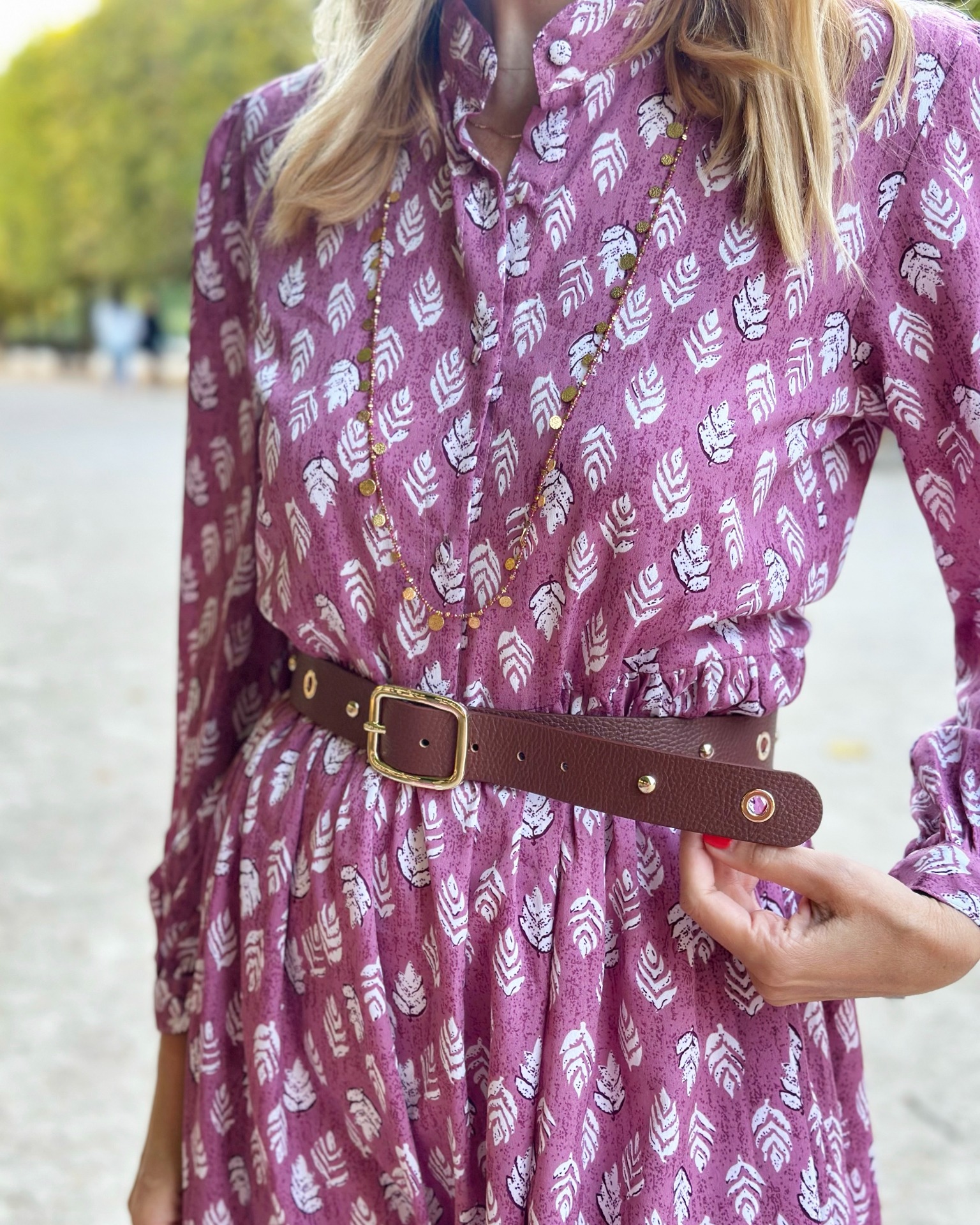 Abito color malva con motivo a foglie avorio, collo a coreana e bottoni rivestiti. 100% viscosa.