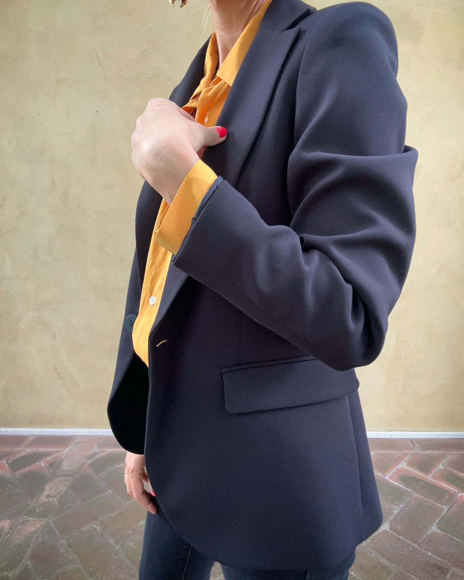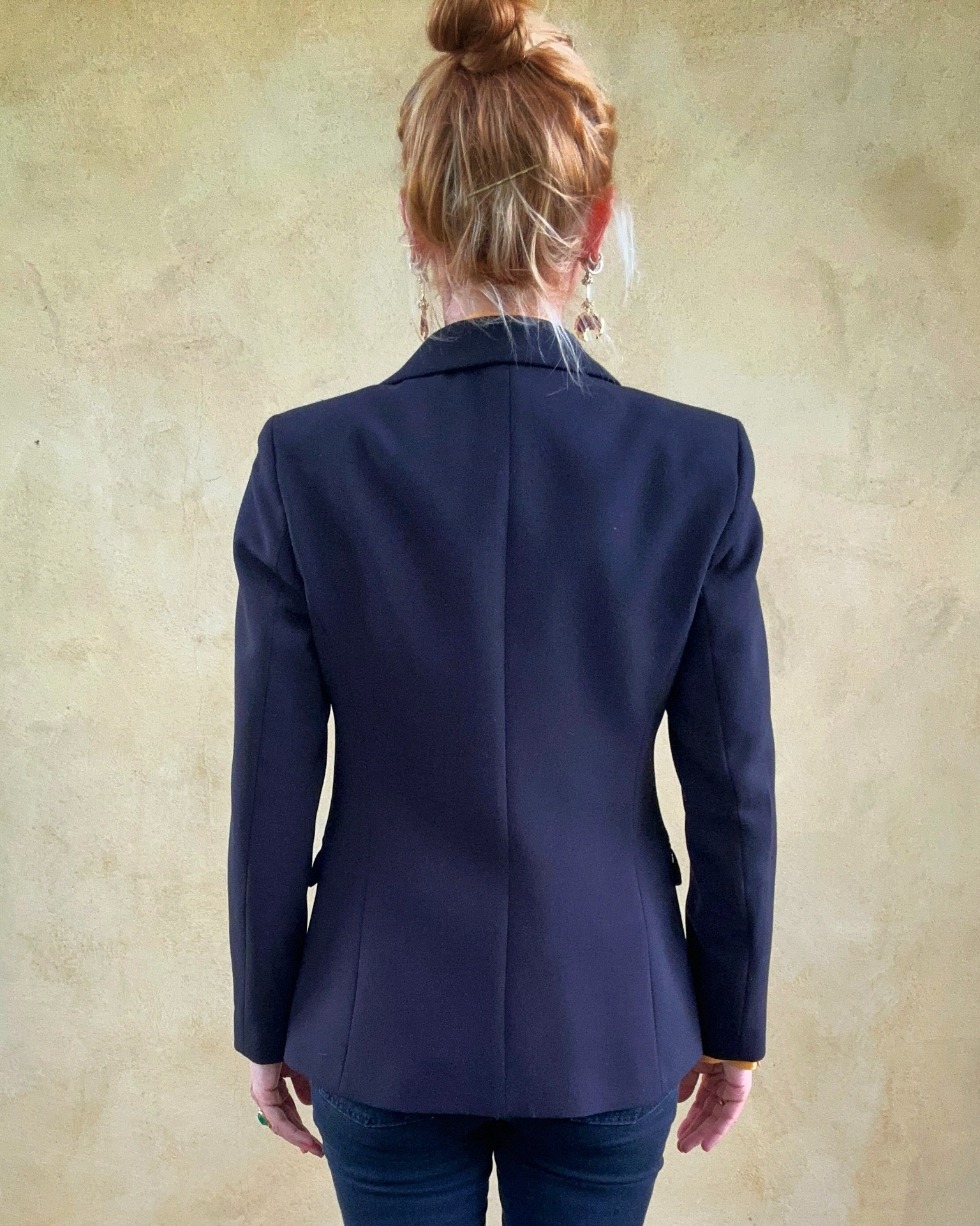Blazer nero foderato. Chiusura ad un bottone e revers in tinta. Composizione : 32% viscosa, 5% elastan, 63% poly.