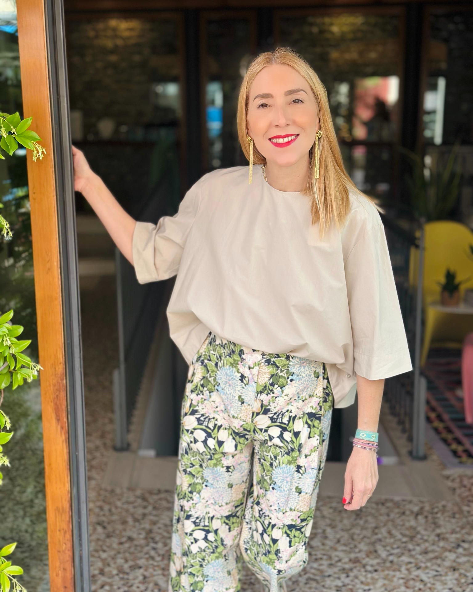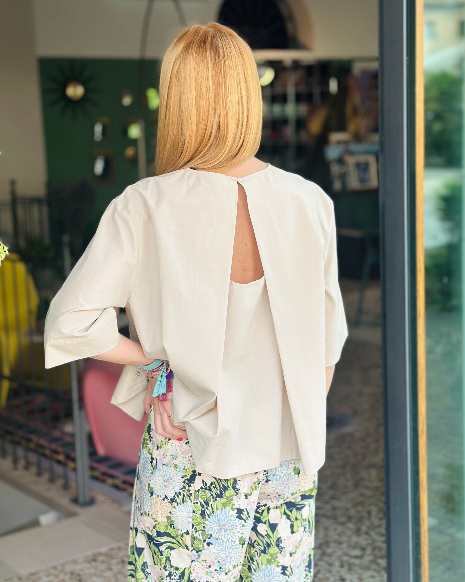 Blusa in 100% cotone, linea ampia, mezze maniche e apertura sul retro con chiusura a bottone.