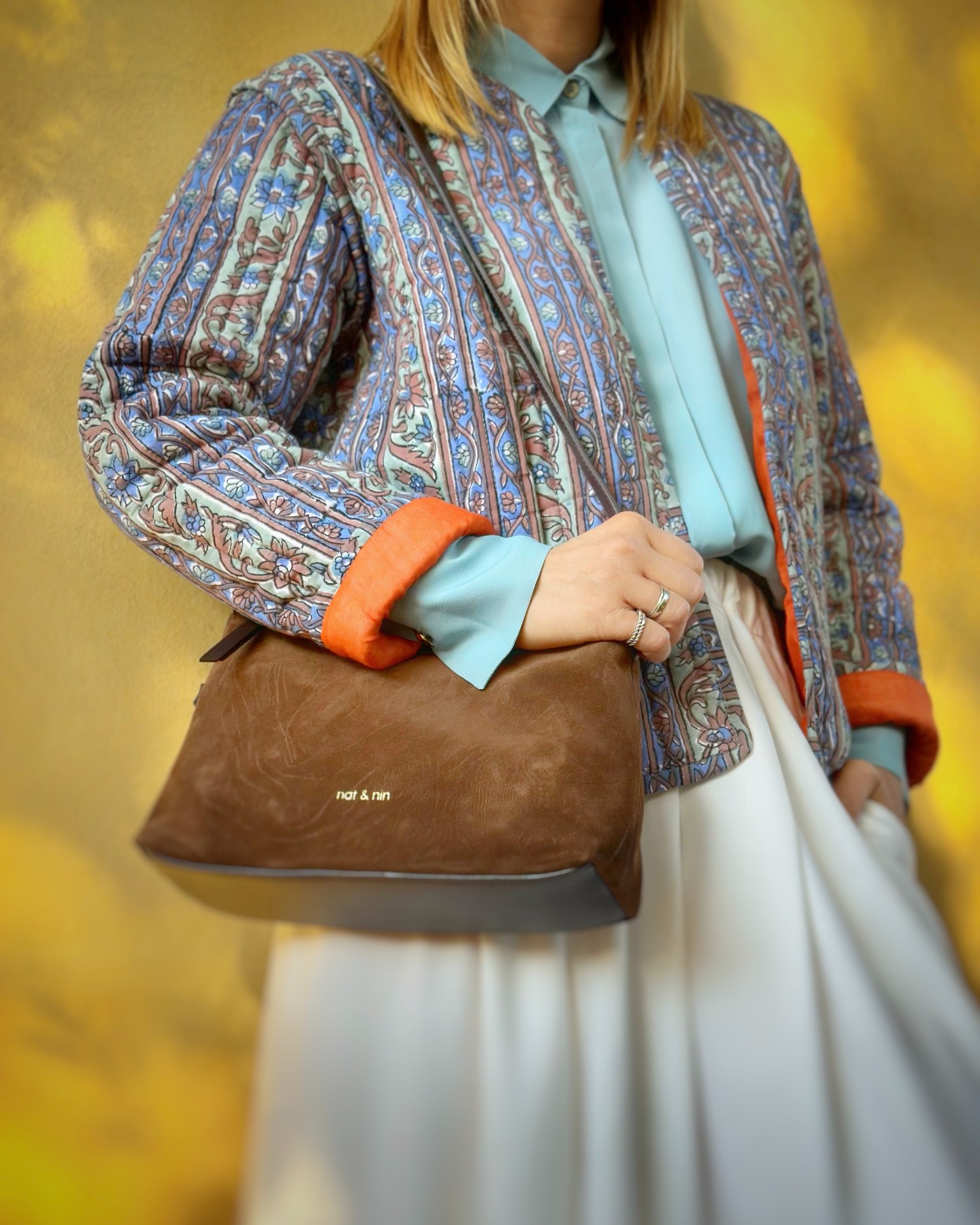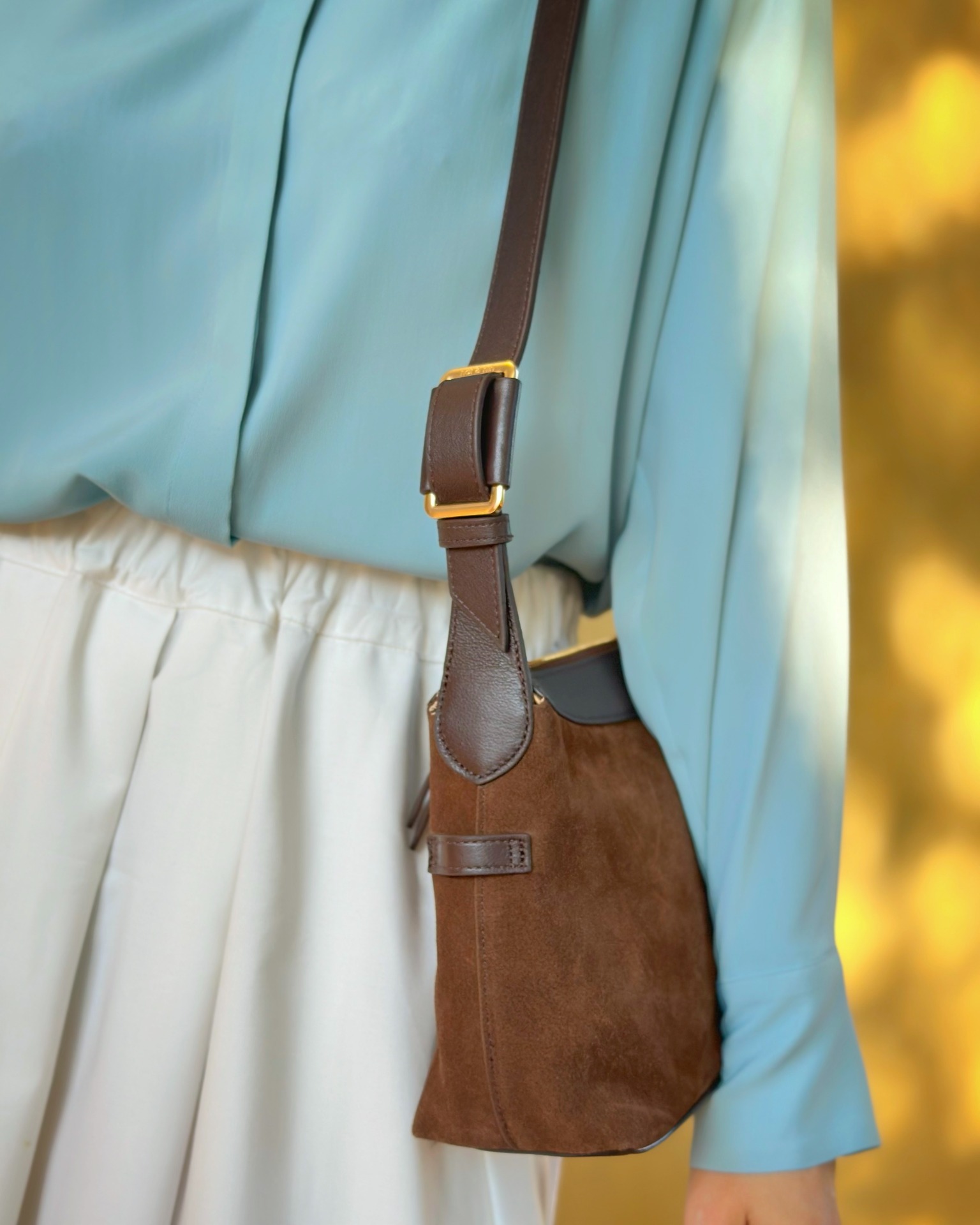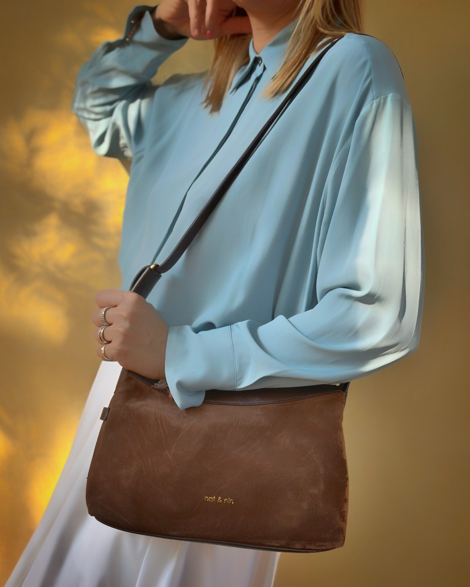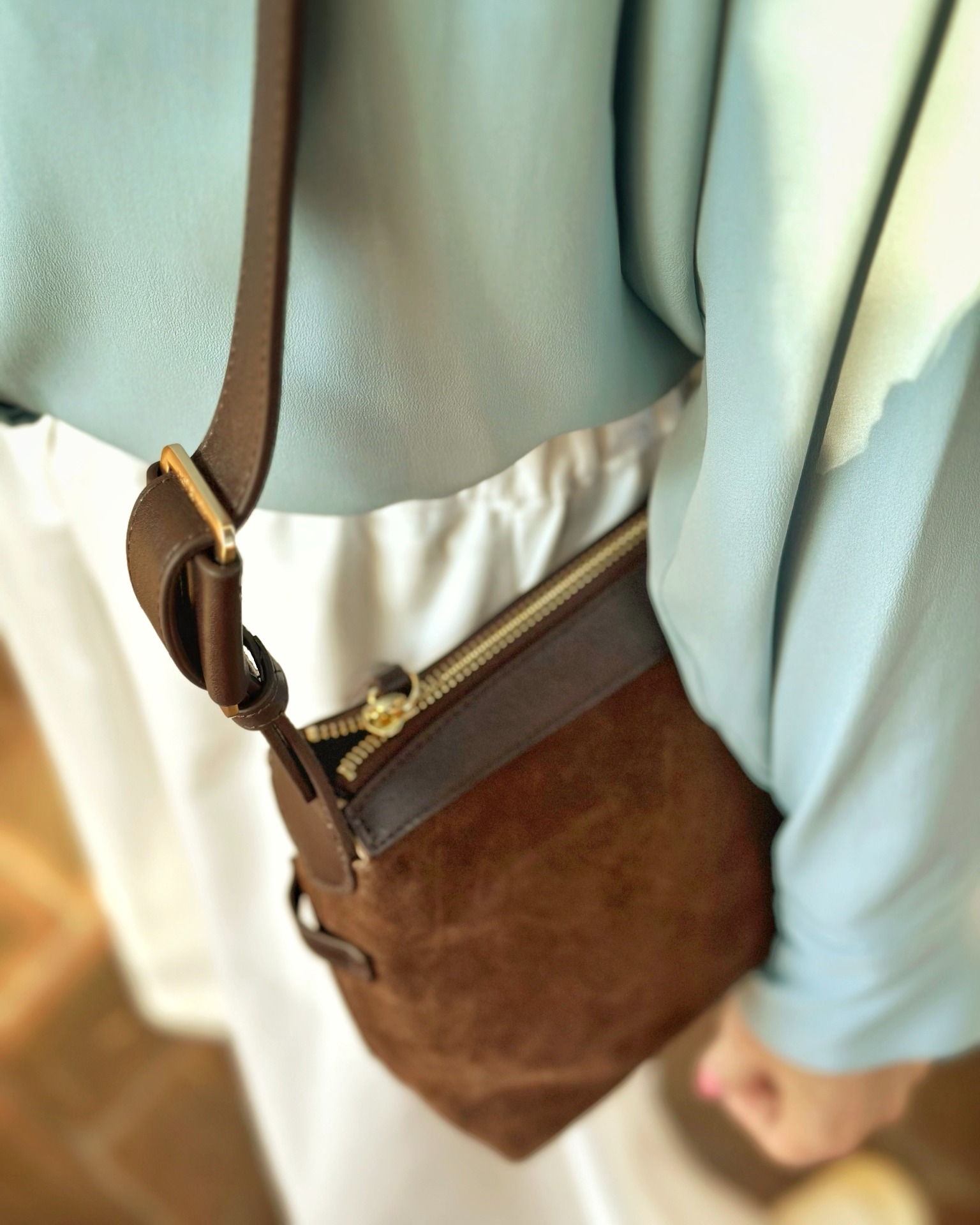 Borsa in pelle scamosciata brown, interno foderato, chiusura con zip dorata. Manico regolabile lunghezza max. 92 cm. Misure: H 16 x L 26,5 x P 8 cm.