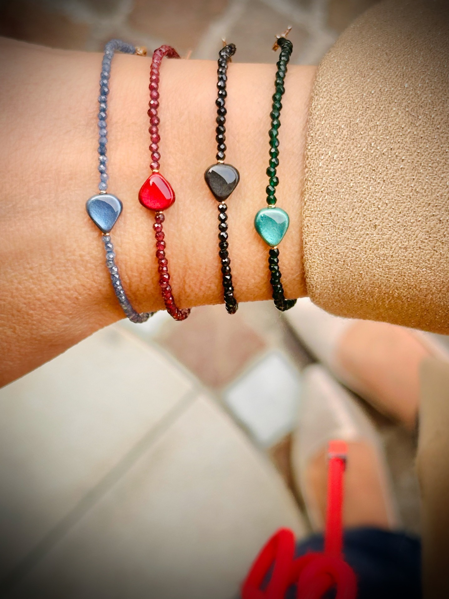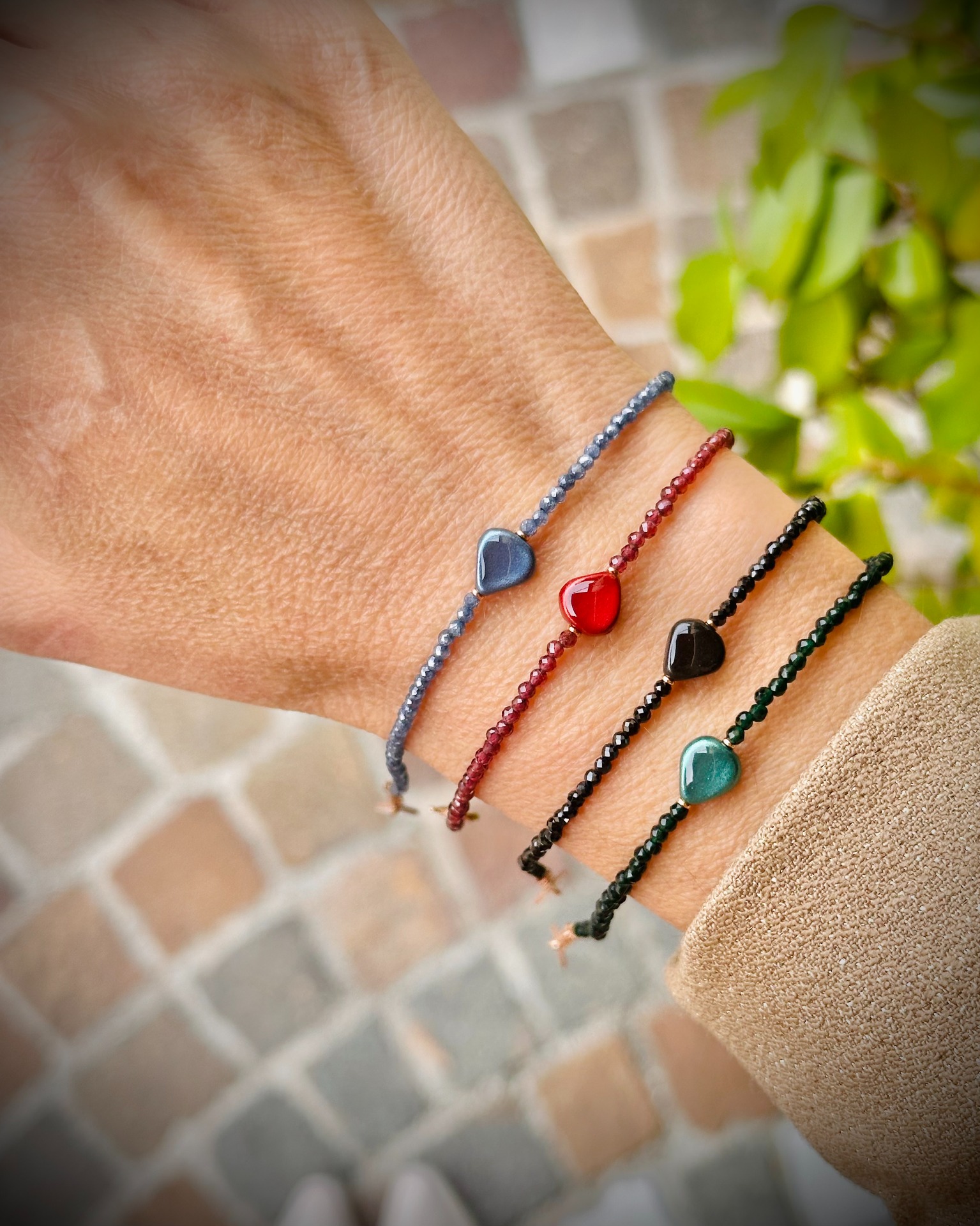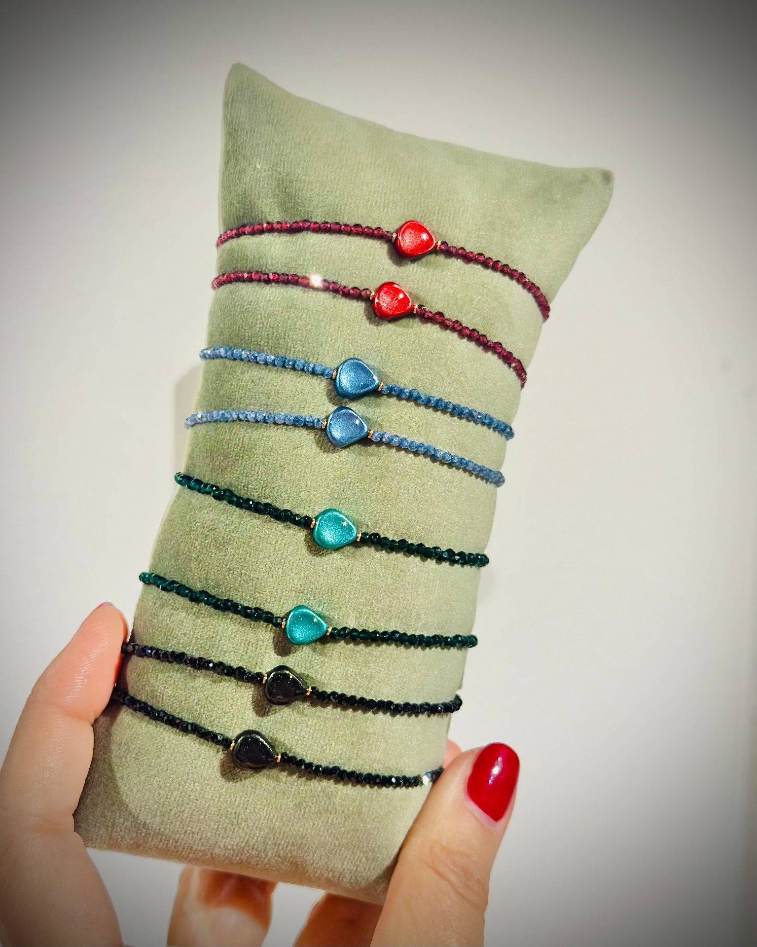 Bracciale in argento 925 placcato oro rosa e zirconi colorati. Al centro il semino d'amore in legno laccato e smaltato a mano. Lunghezza cm 16 regolabile con allungamento cm 1,5.