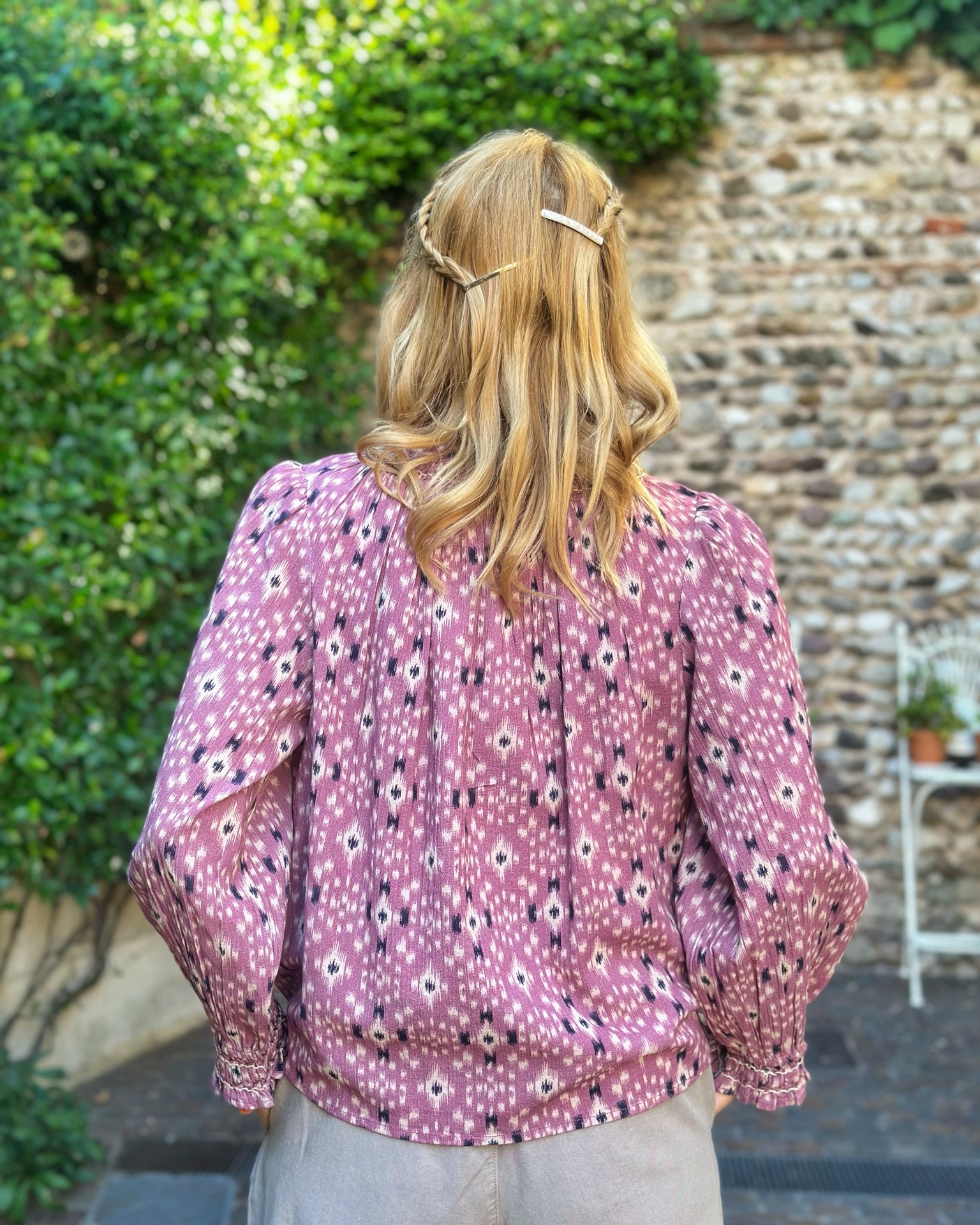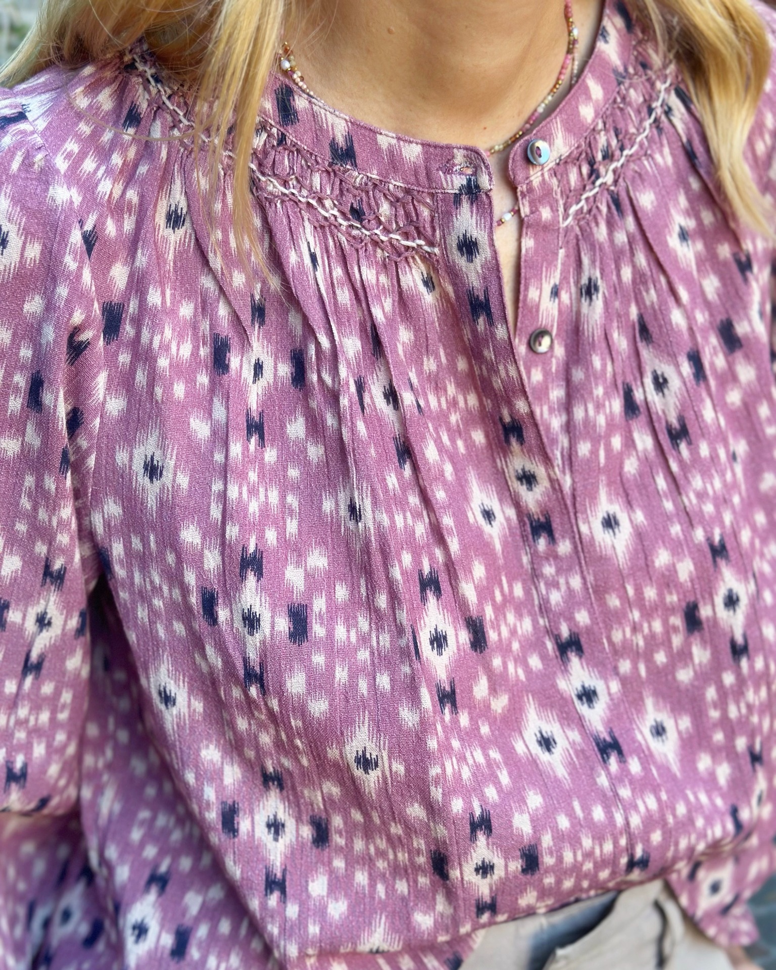Camicia girocollo 100% viscosa, manica lunga, polsino elasticizzato. Colore ametista.