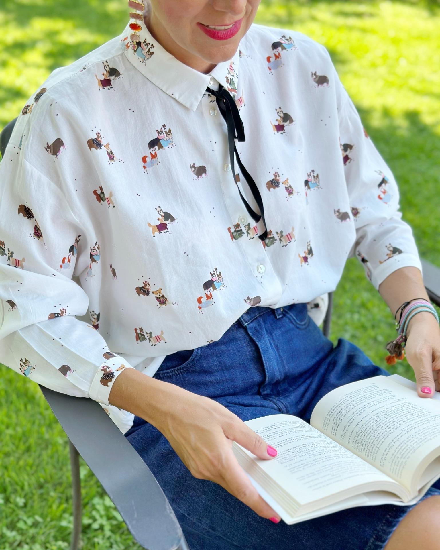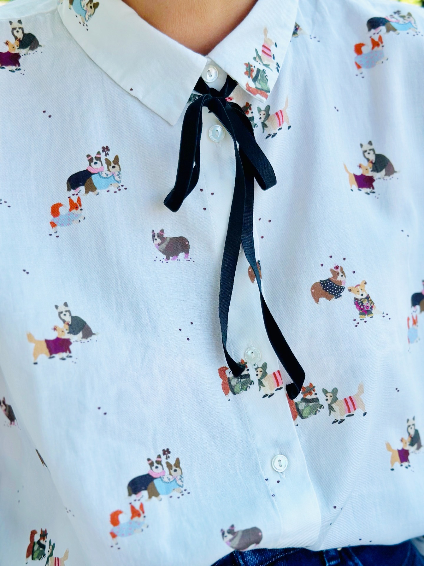 Camicia in viscosa con stampa corgi, sottile fiocco da annodare sul davanti.