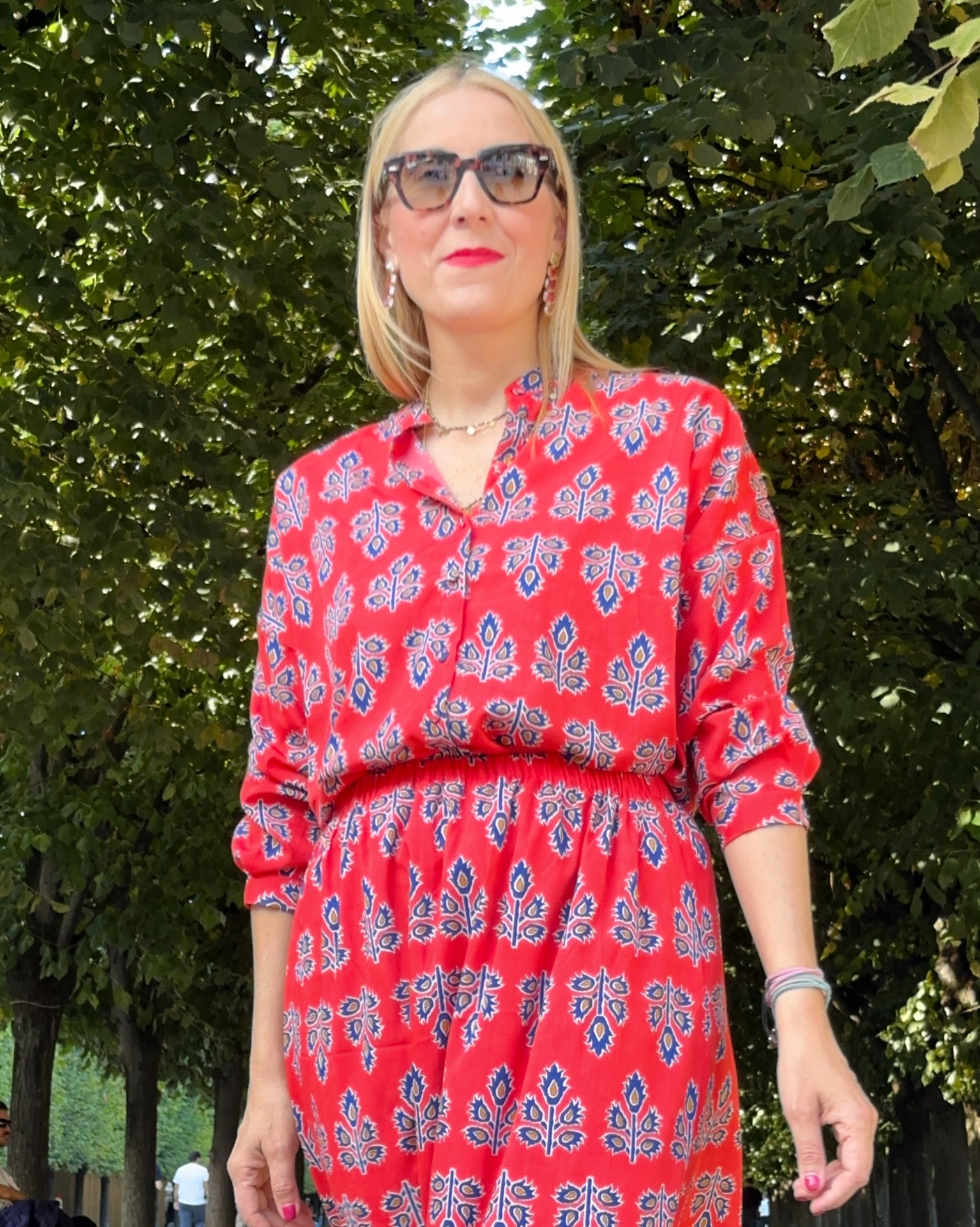 Camicia in viscosa 100%, collo coreana e bottoni rivestiti. Colore corallo/blu/senape