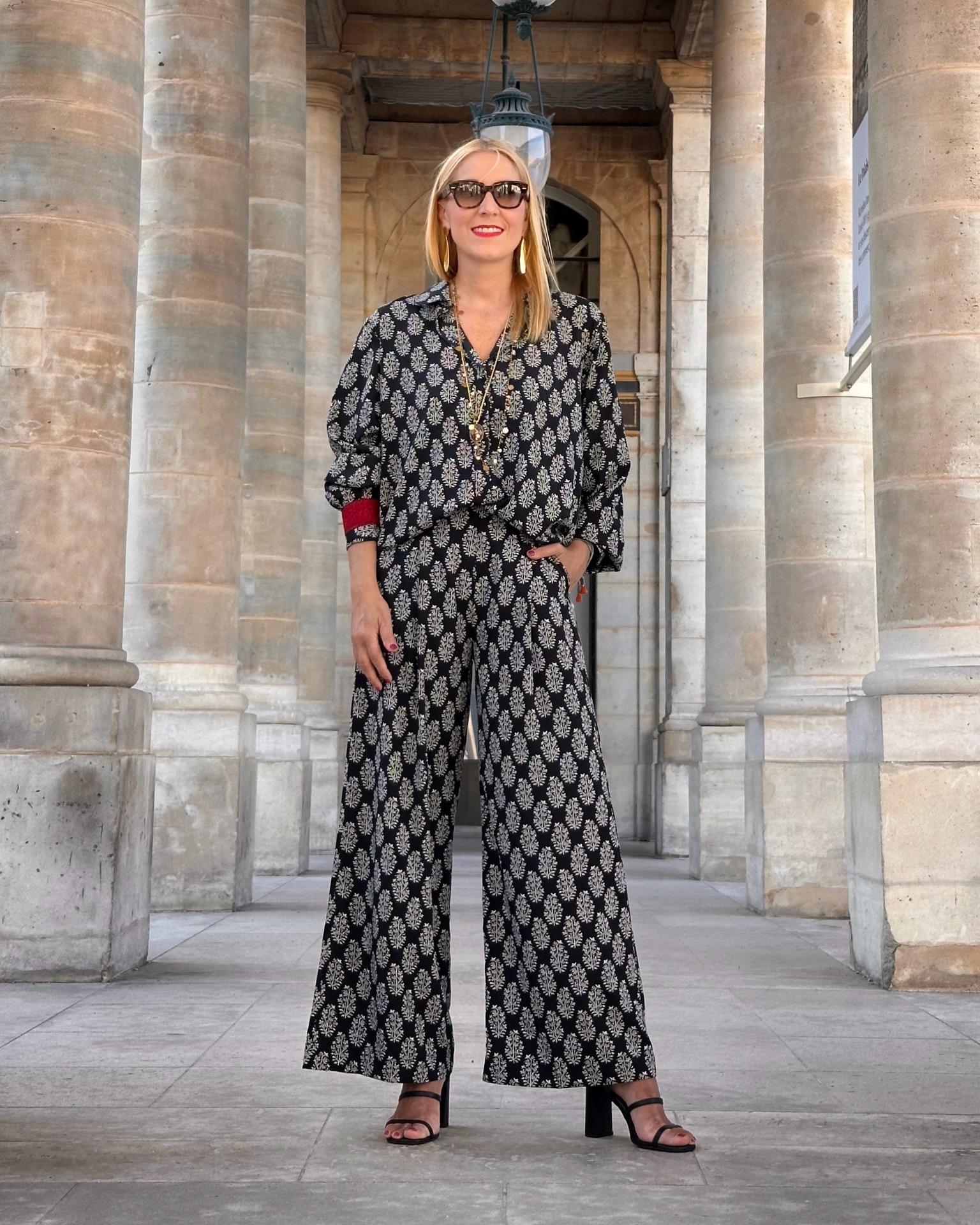 Pantalone fluido in viscosa 100%, elastico in vita sulla parte posteriore. Colore nero/bianco