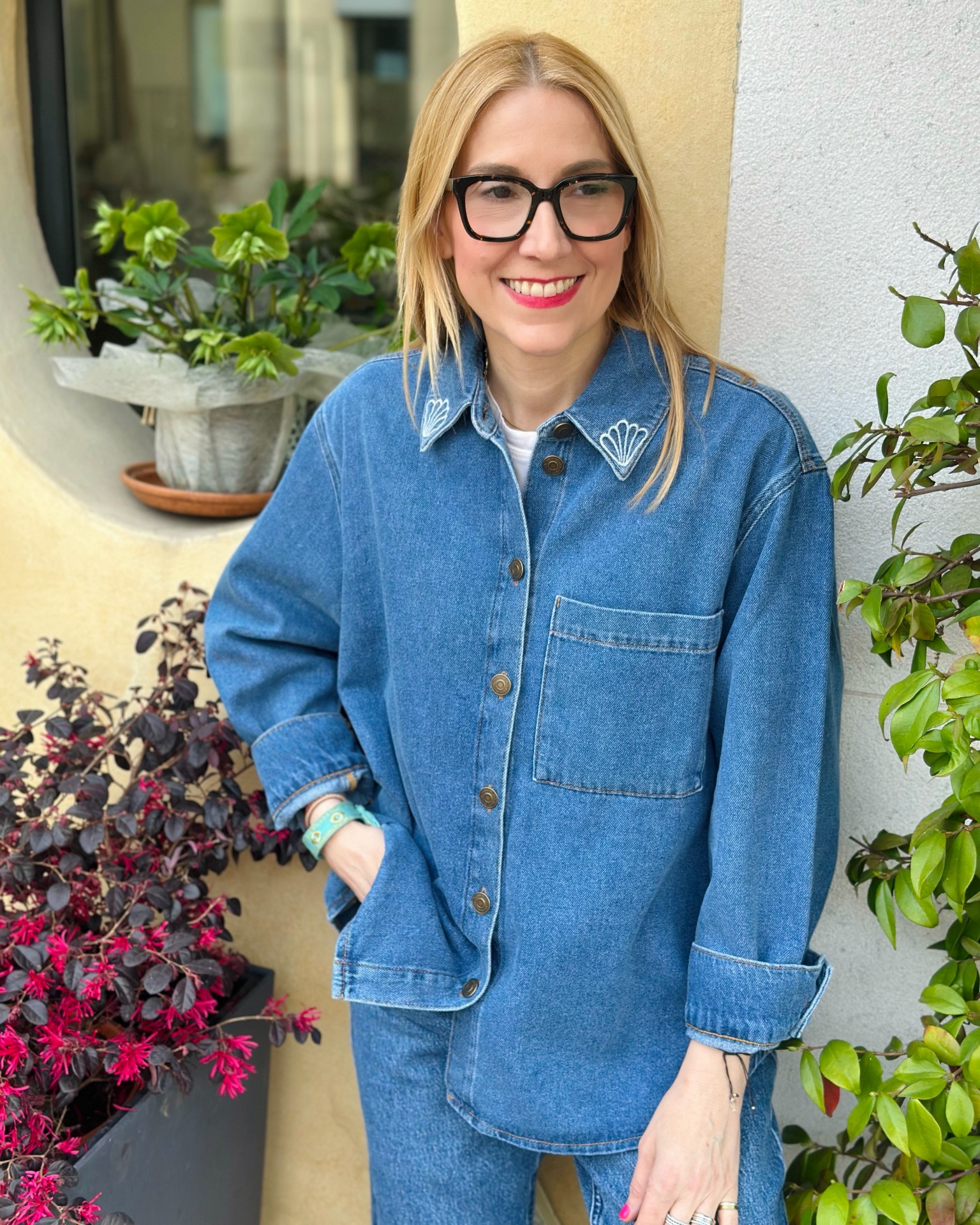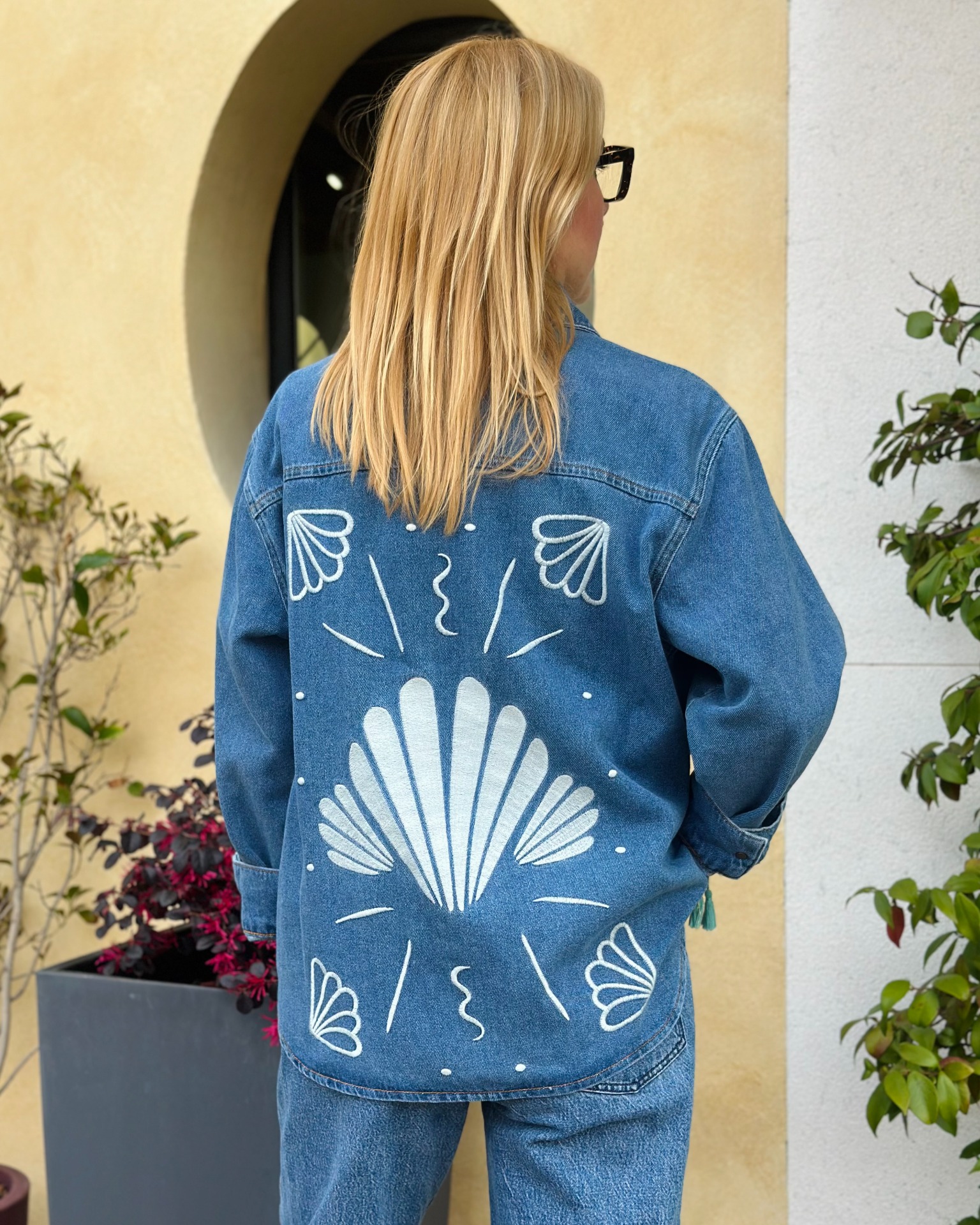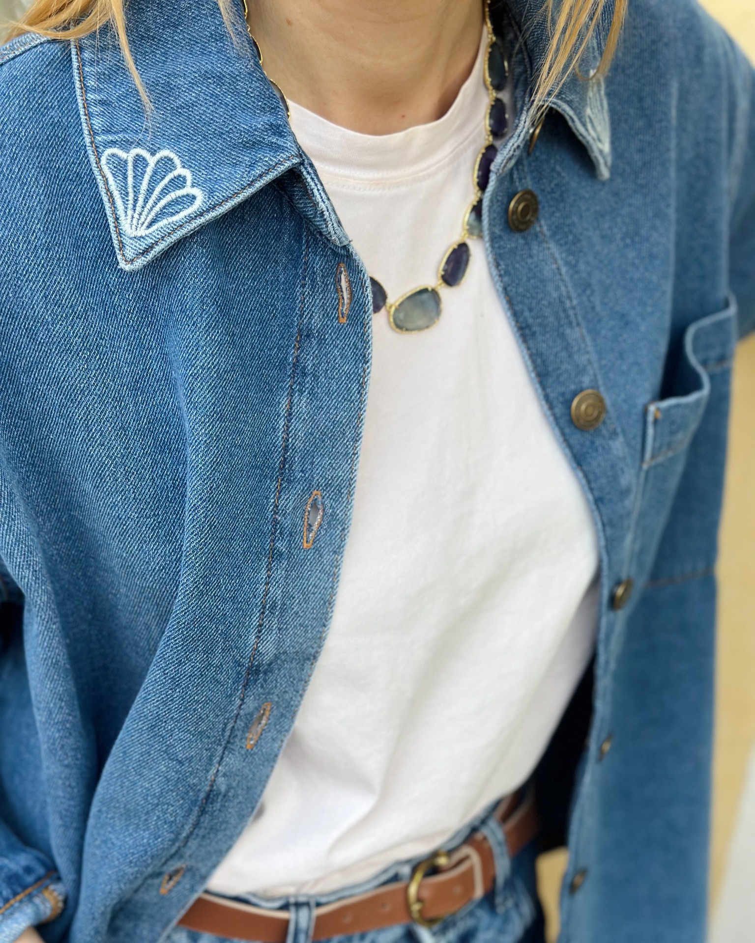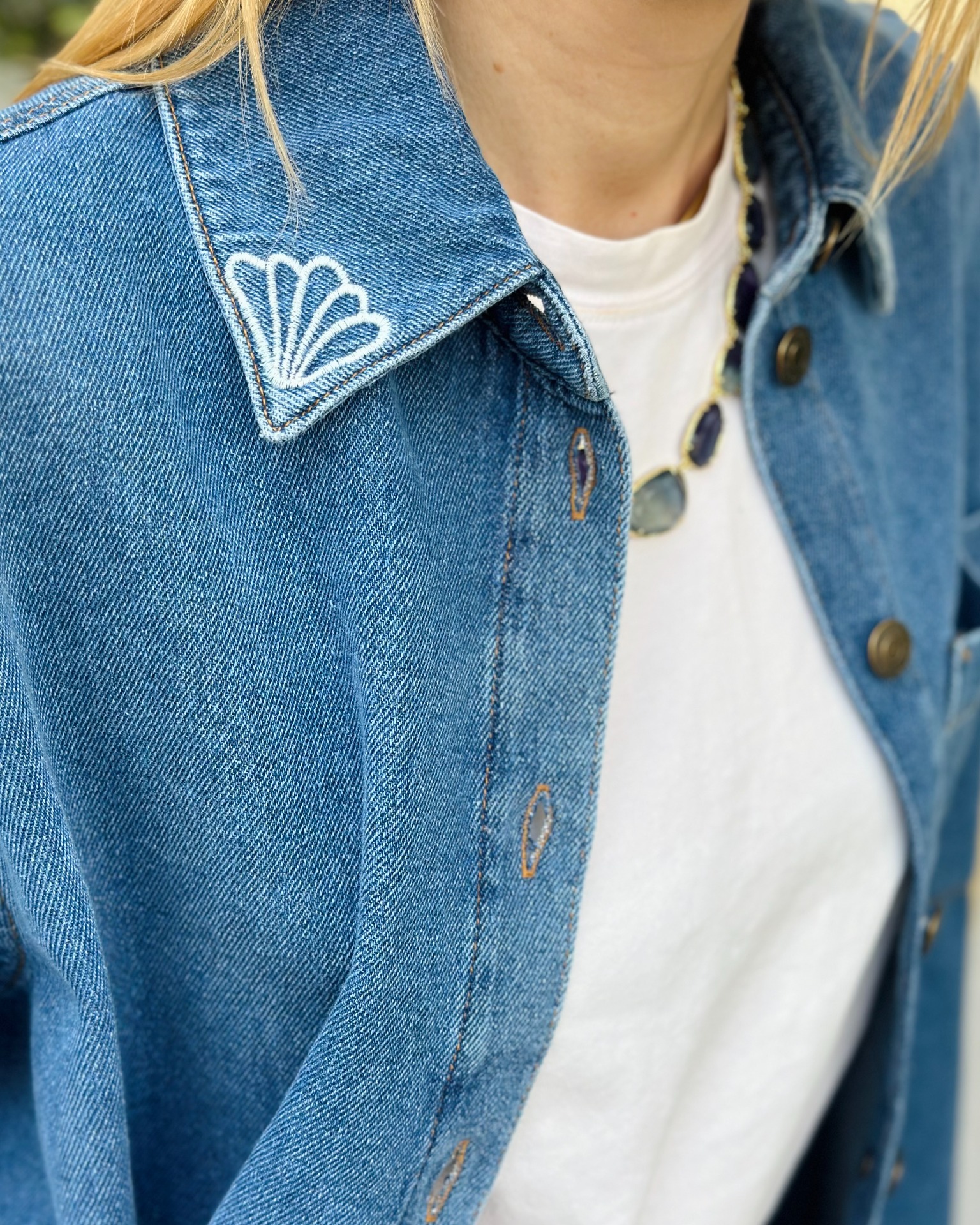 Questa camicia in denim si indossa anche come giacca. Arricchita da ricami a tema marino, ideale con i jeans abbinati o sopra ad un abito lungo.