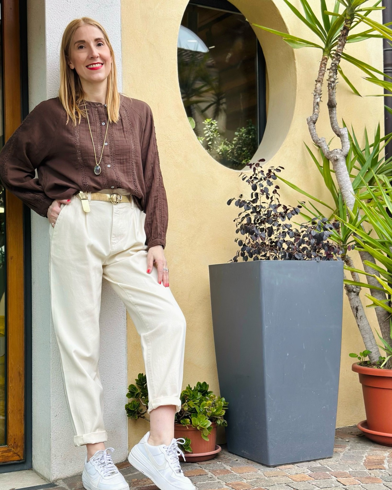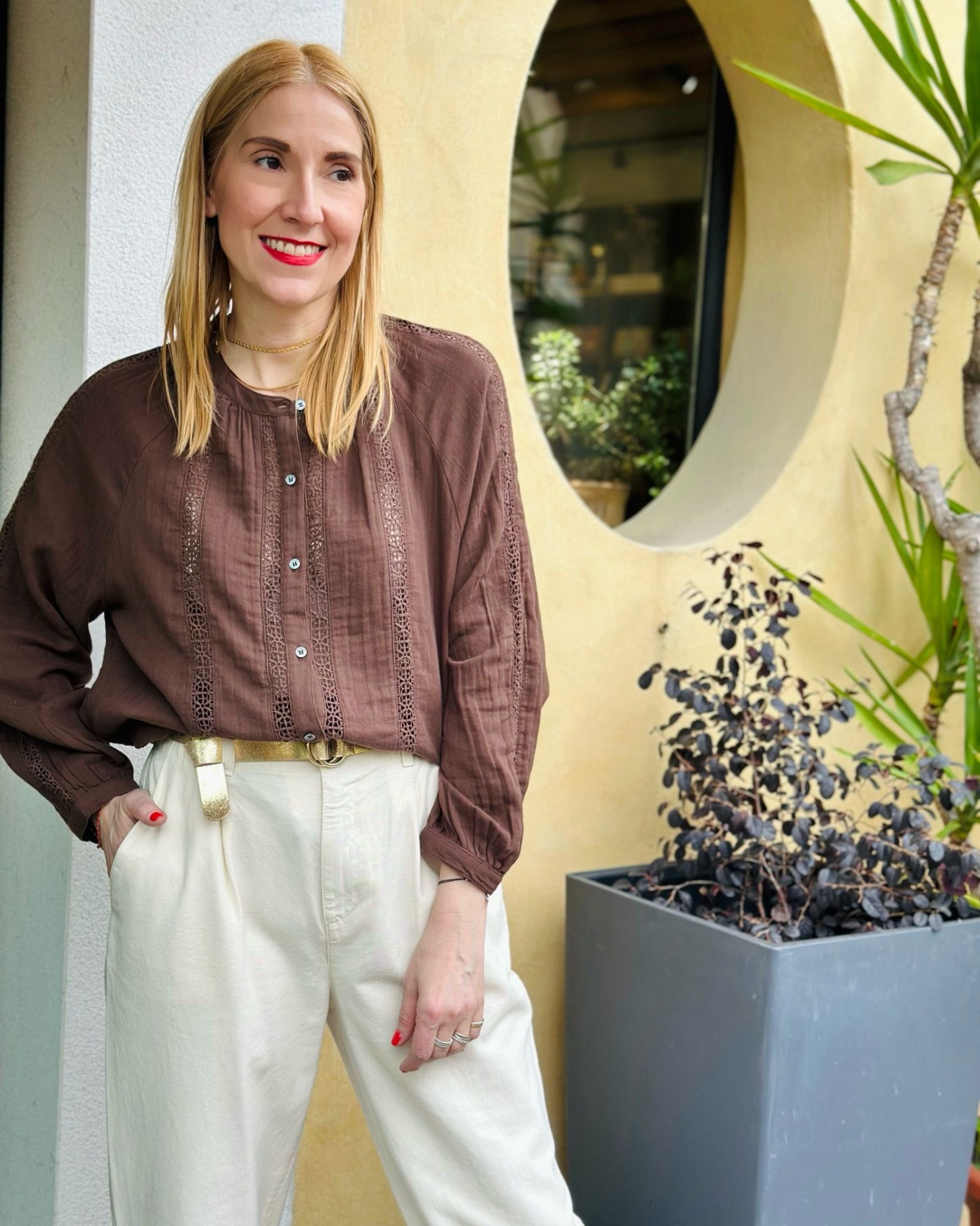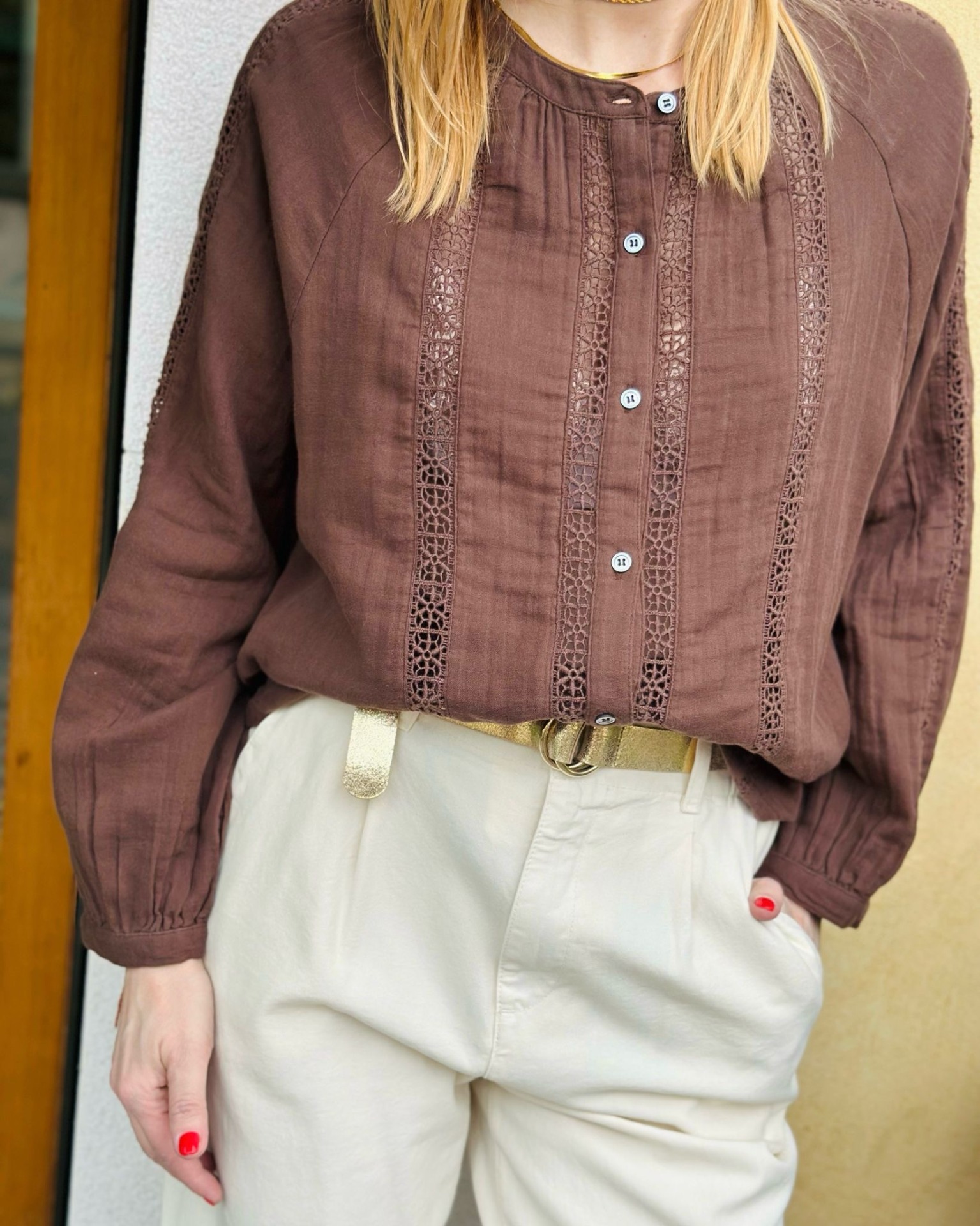 Camicia dal mood romantico, scollo tondo e manica raglan con inserti in pizzo.