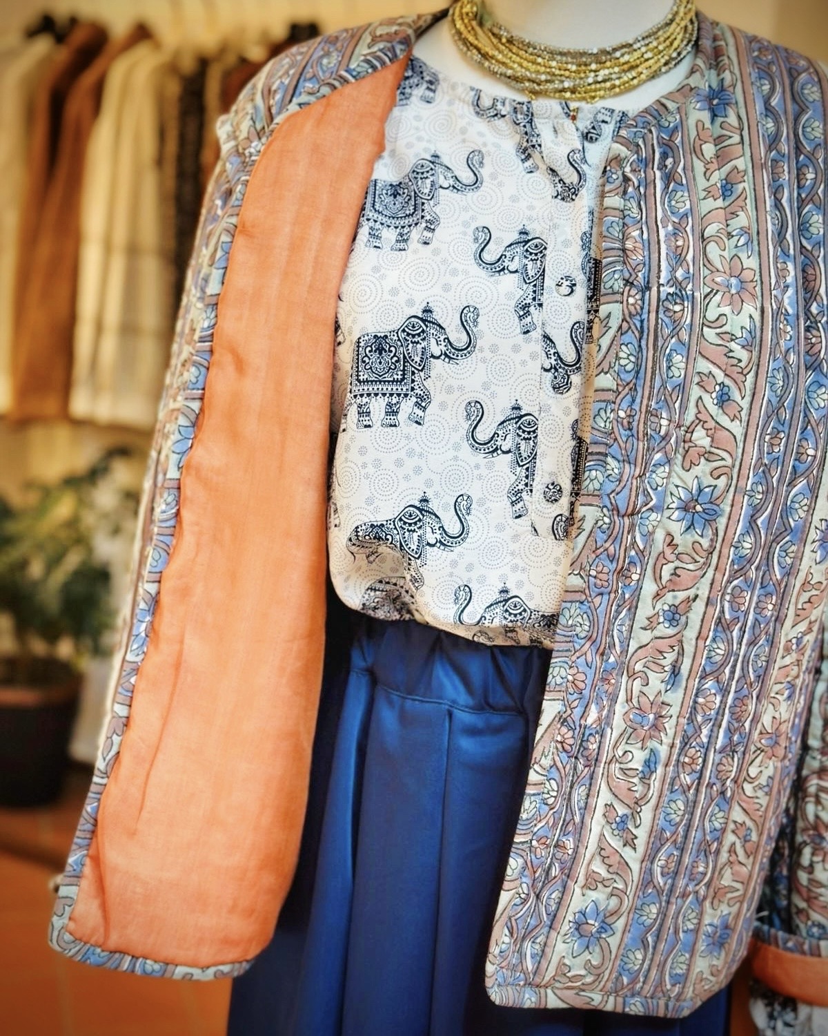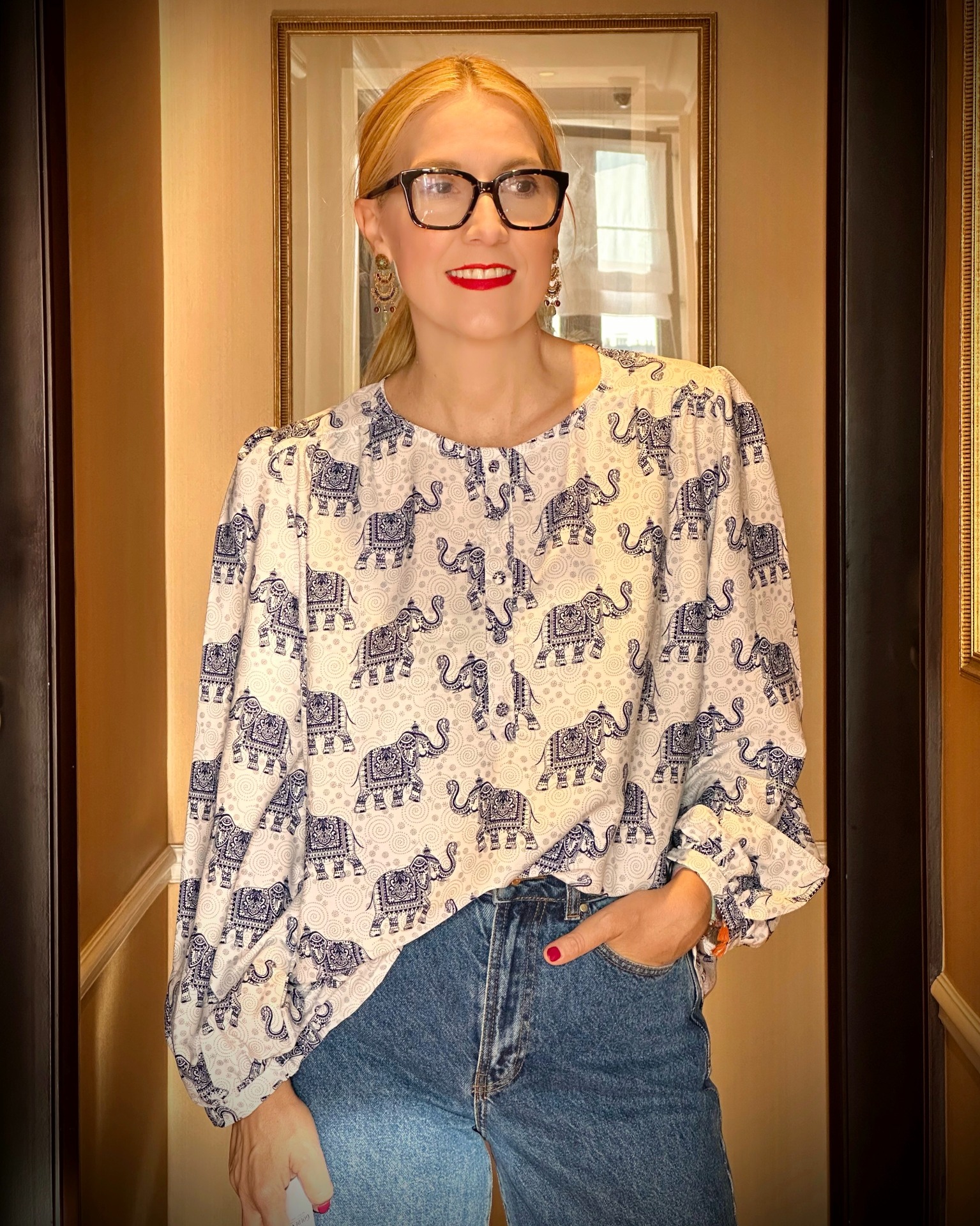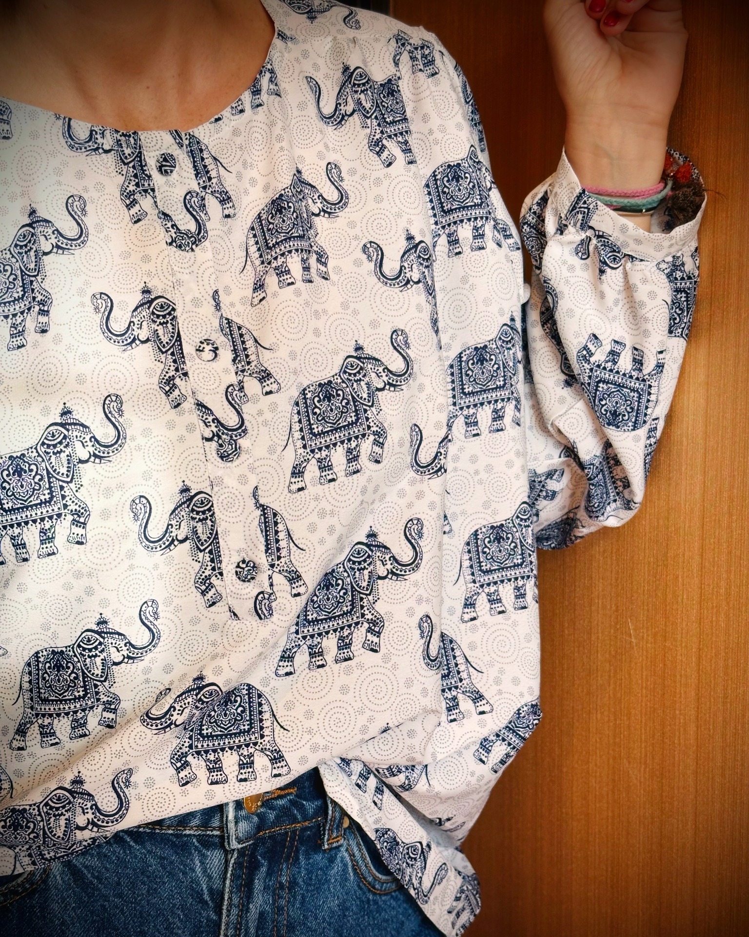 Camicia in viscosa bianca con disegno elefanti blu portafortuna. 100% viscosa.