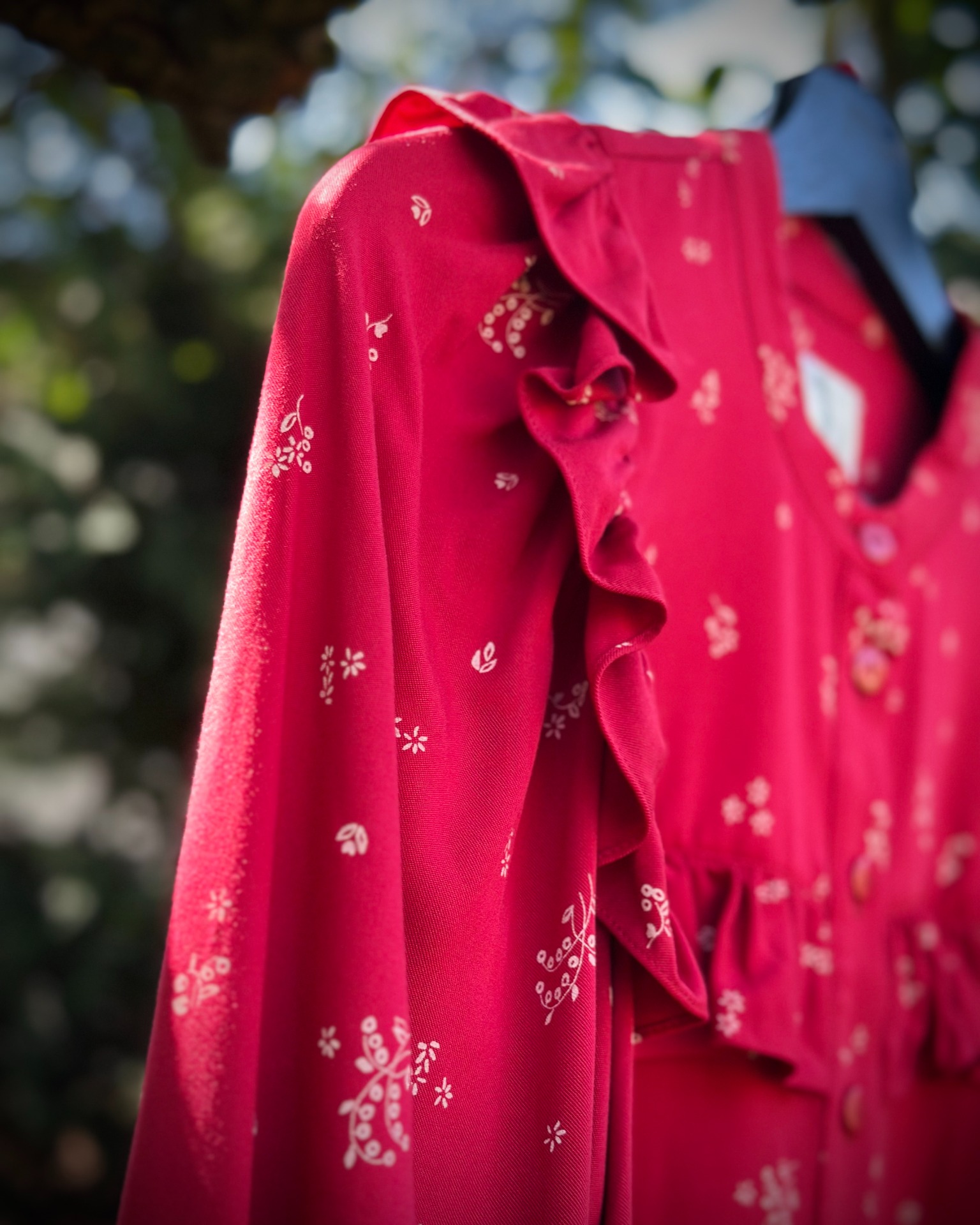 Camicia in viscosa 100%, colore ciliegia, abbottonatura davanti, manica lunga.