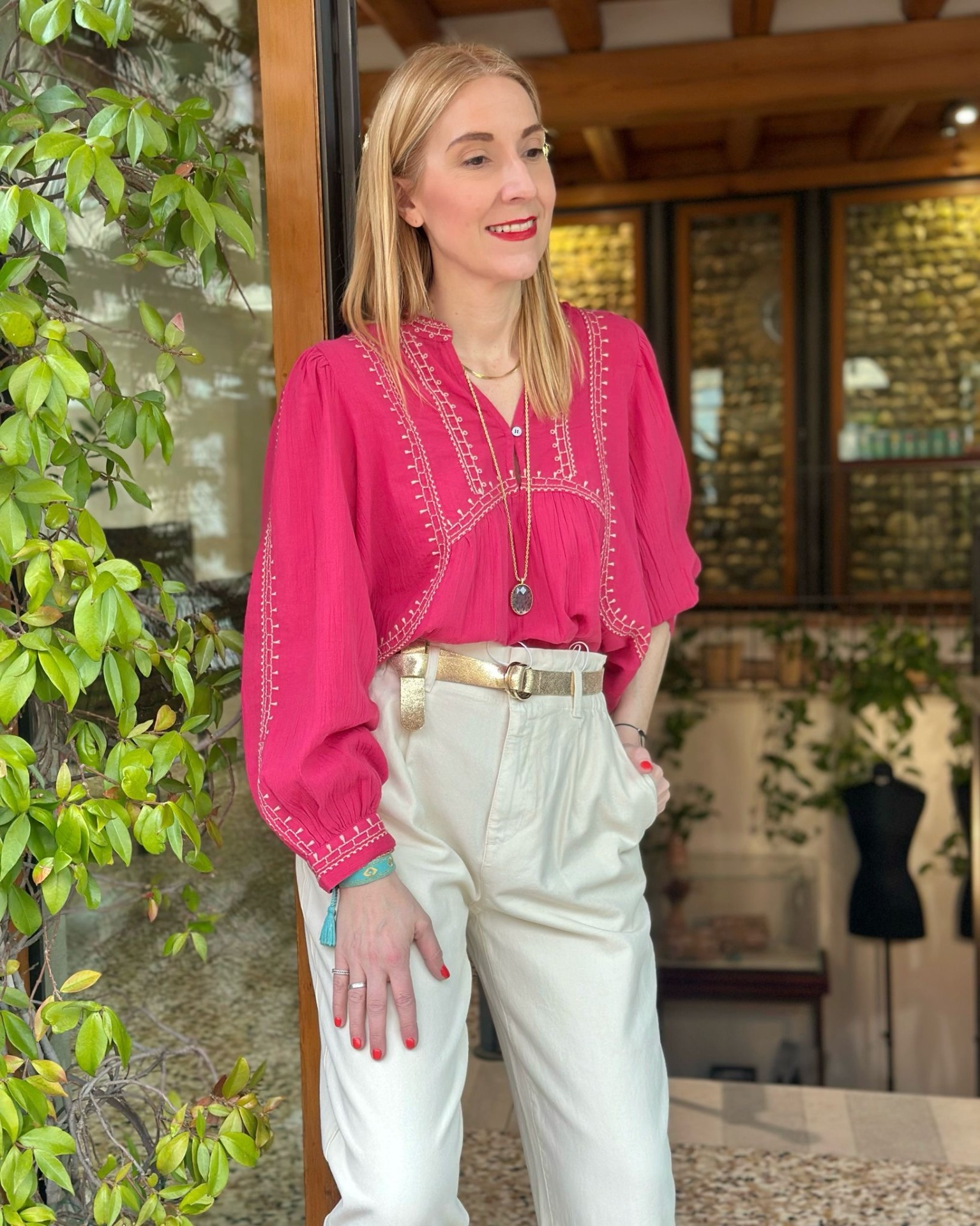 Blusa ricamata con motivi etnici, scollo a V con dettagli che donano volume.