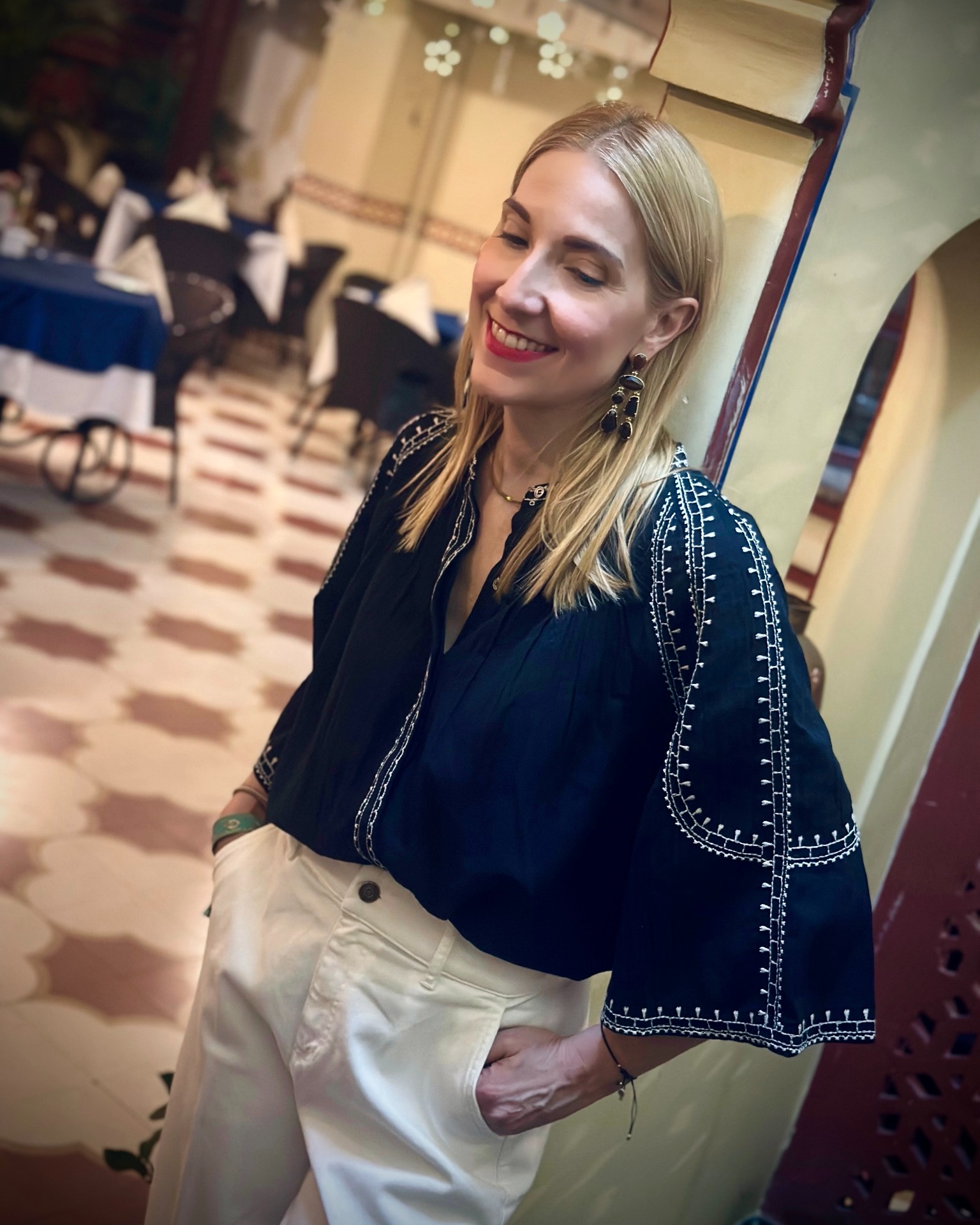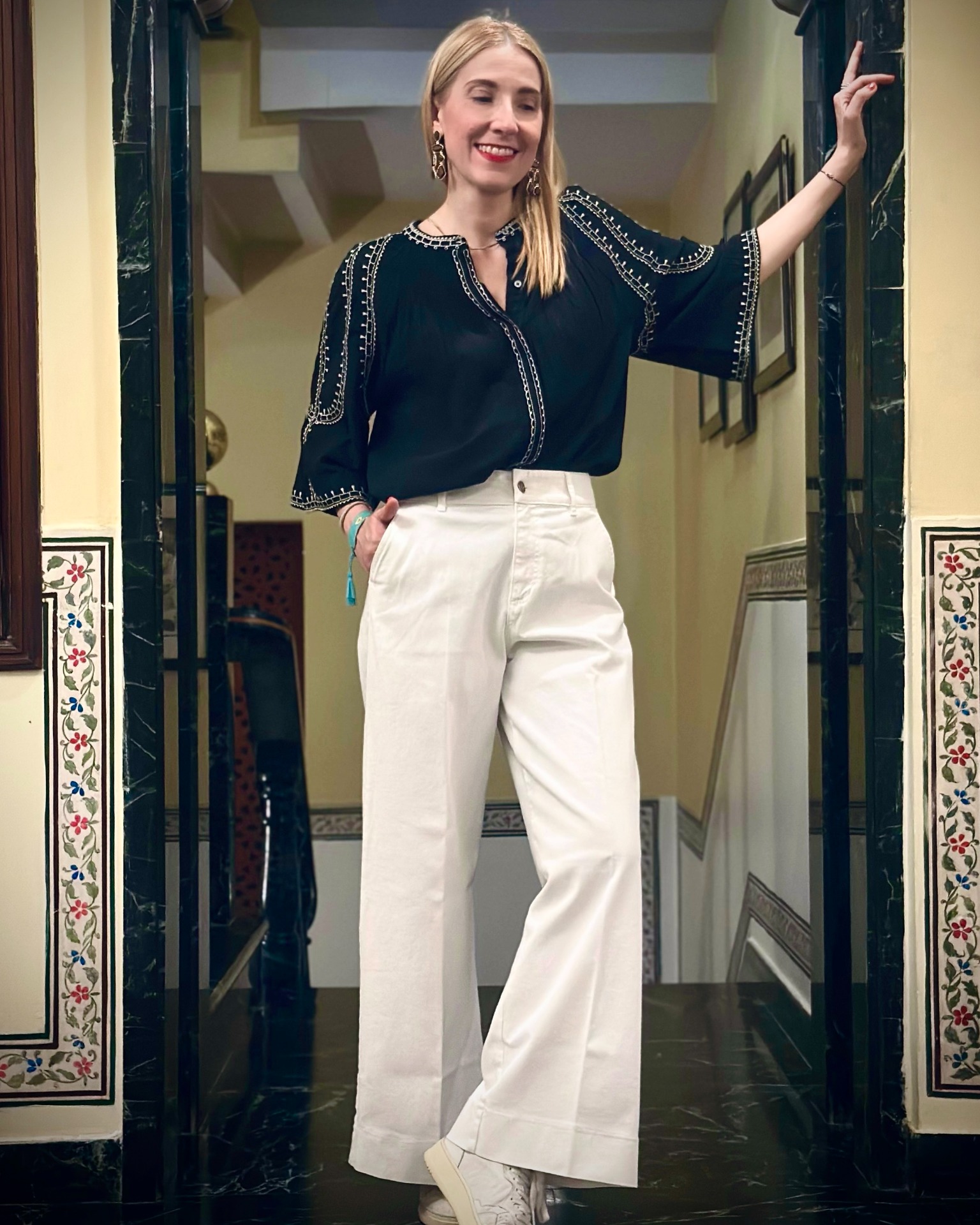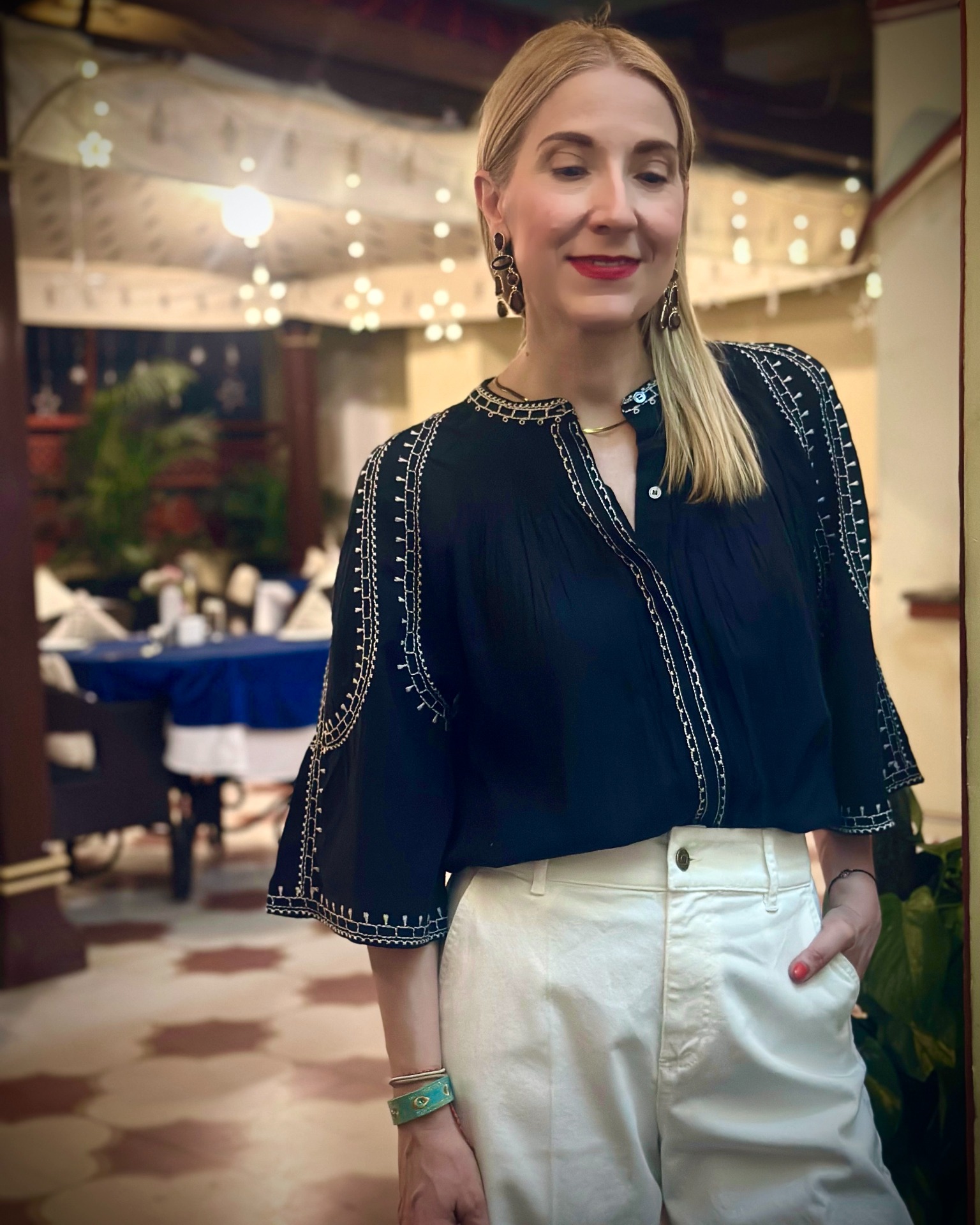 Camicia in tessuto garzato di cotone con ricami etnici a contrasto, chiusura anteriore nascosta con bottoni.