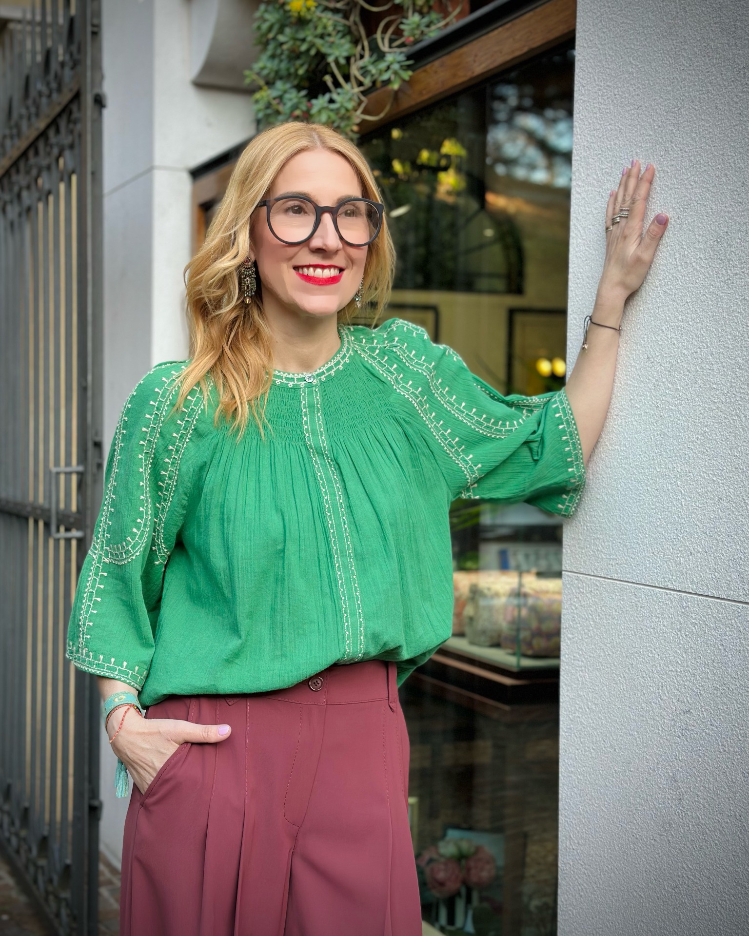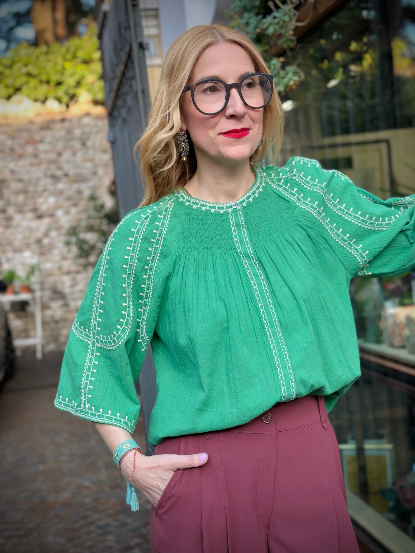 Camicia in tessuto garzato di cotone con ricami etnici a contrasto, chiusura anteriore nascosta con bottoni.