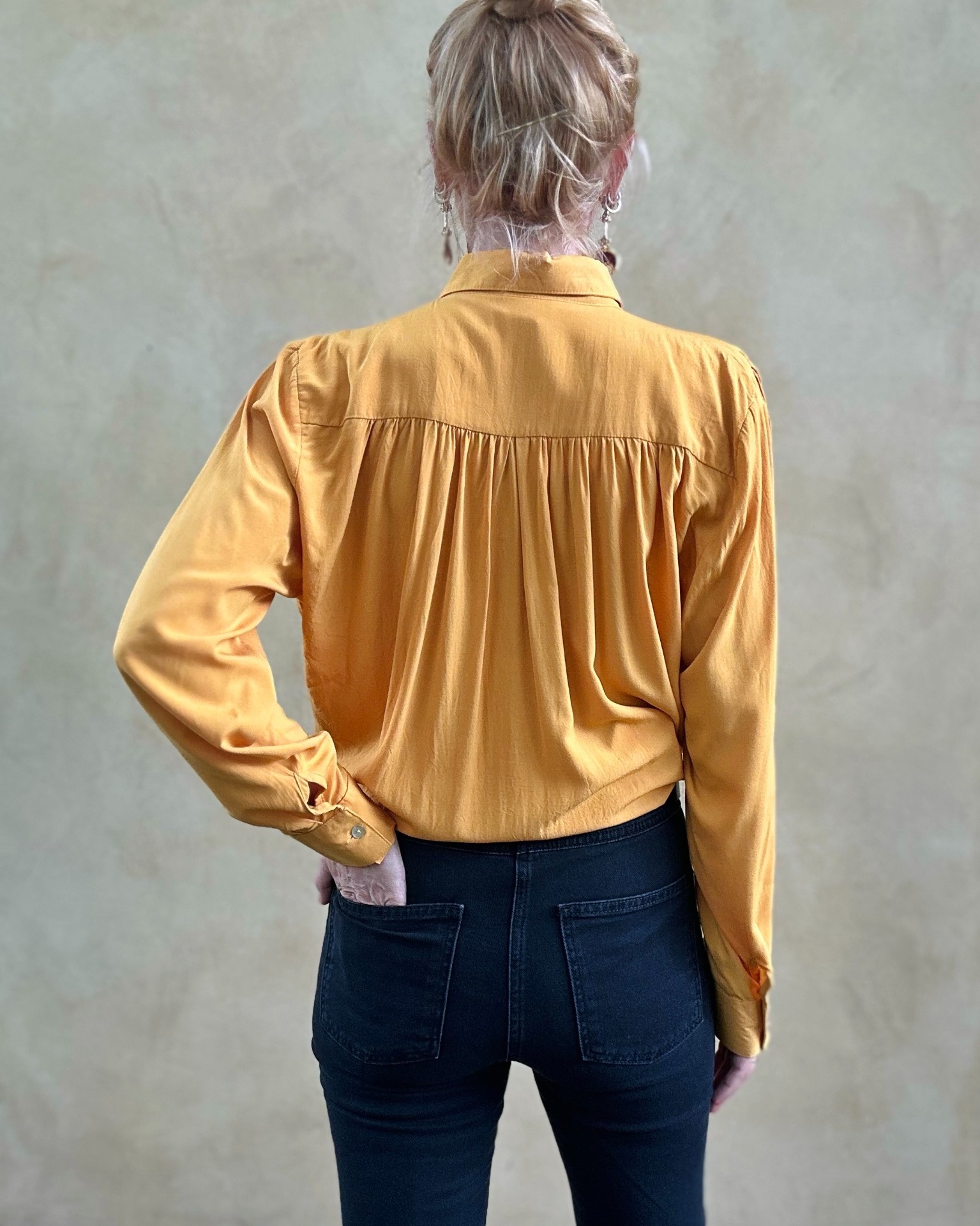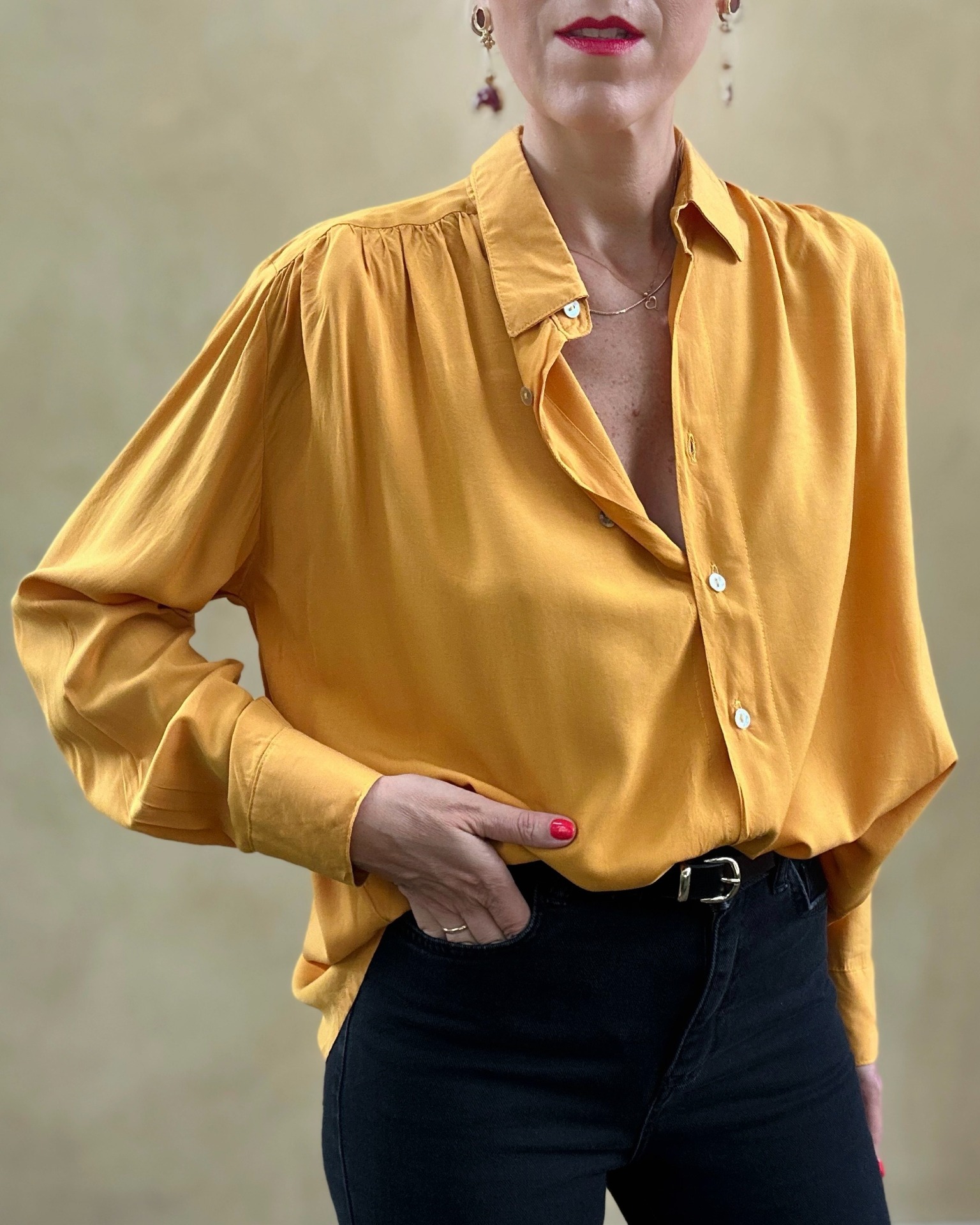 Camicia senape con colletto e bottoni a vista, viscosa 100%.