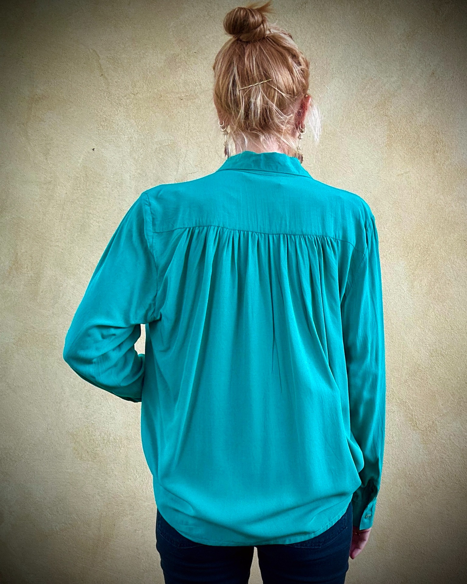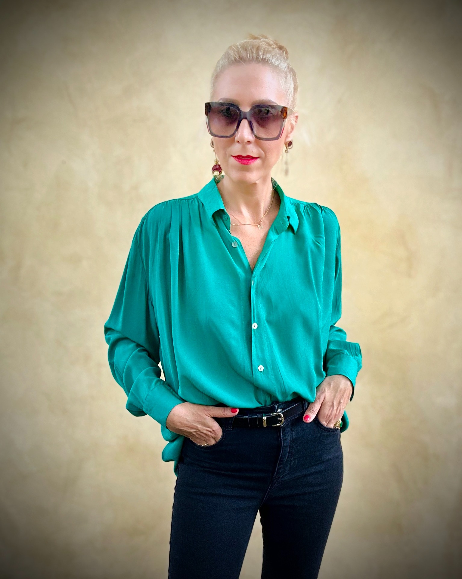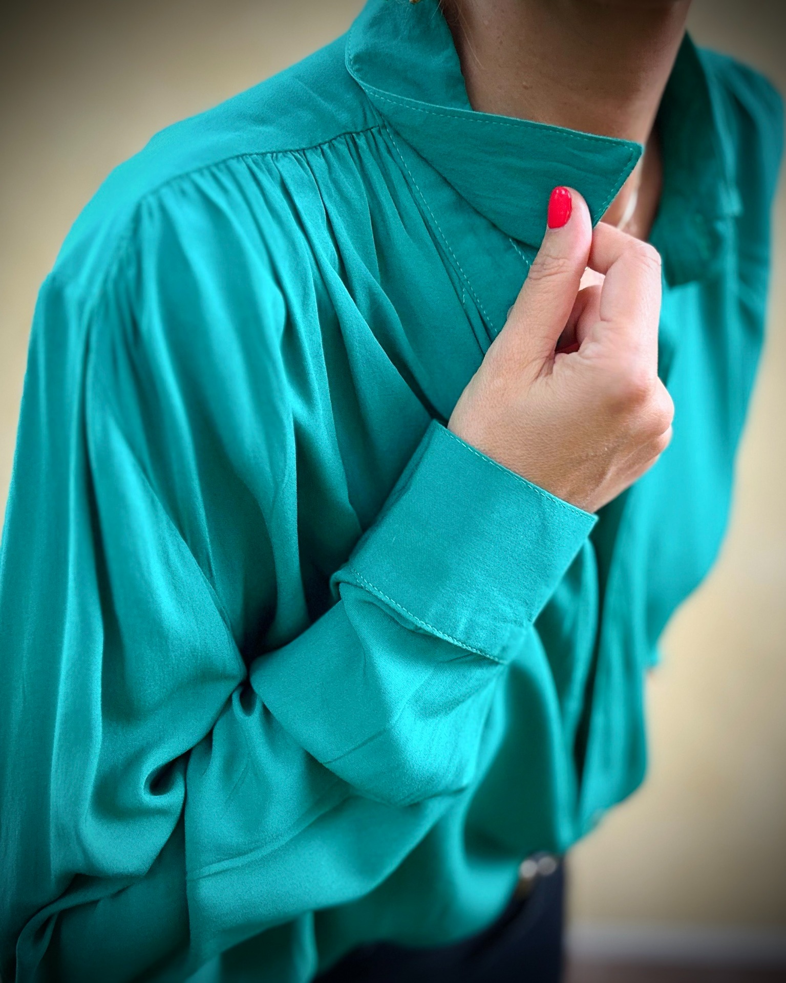Camicia verde smeraldo con colletto e bottoni in madreperla. 100% viscosa.