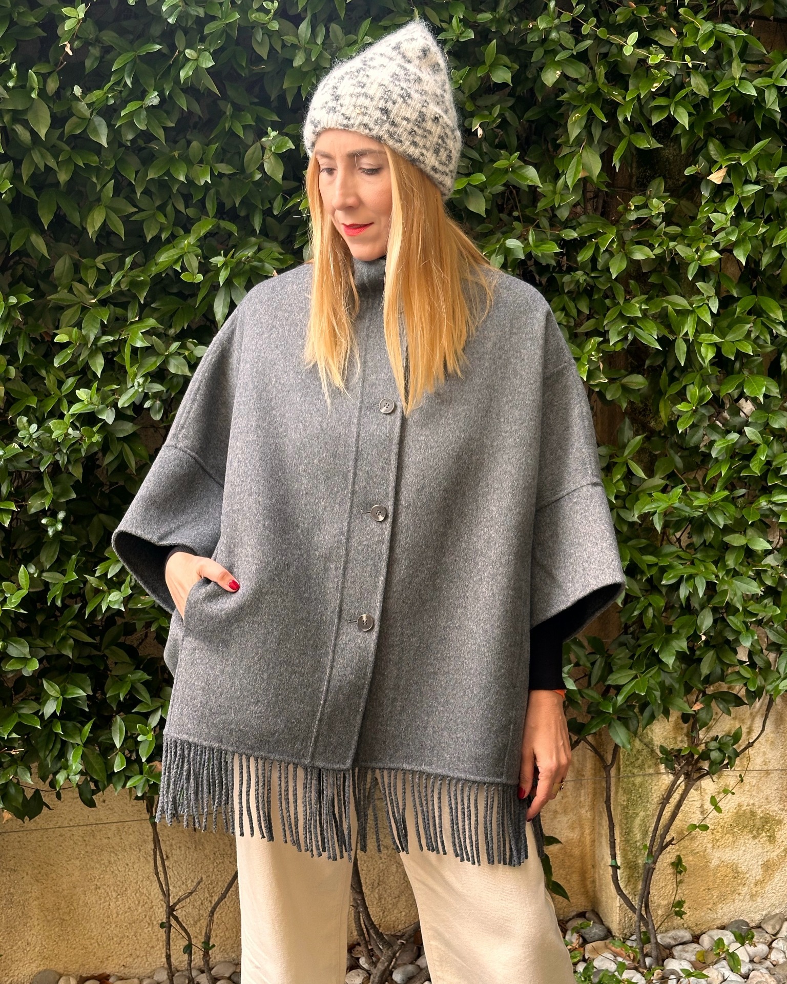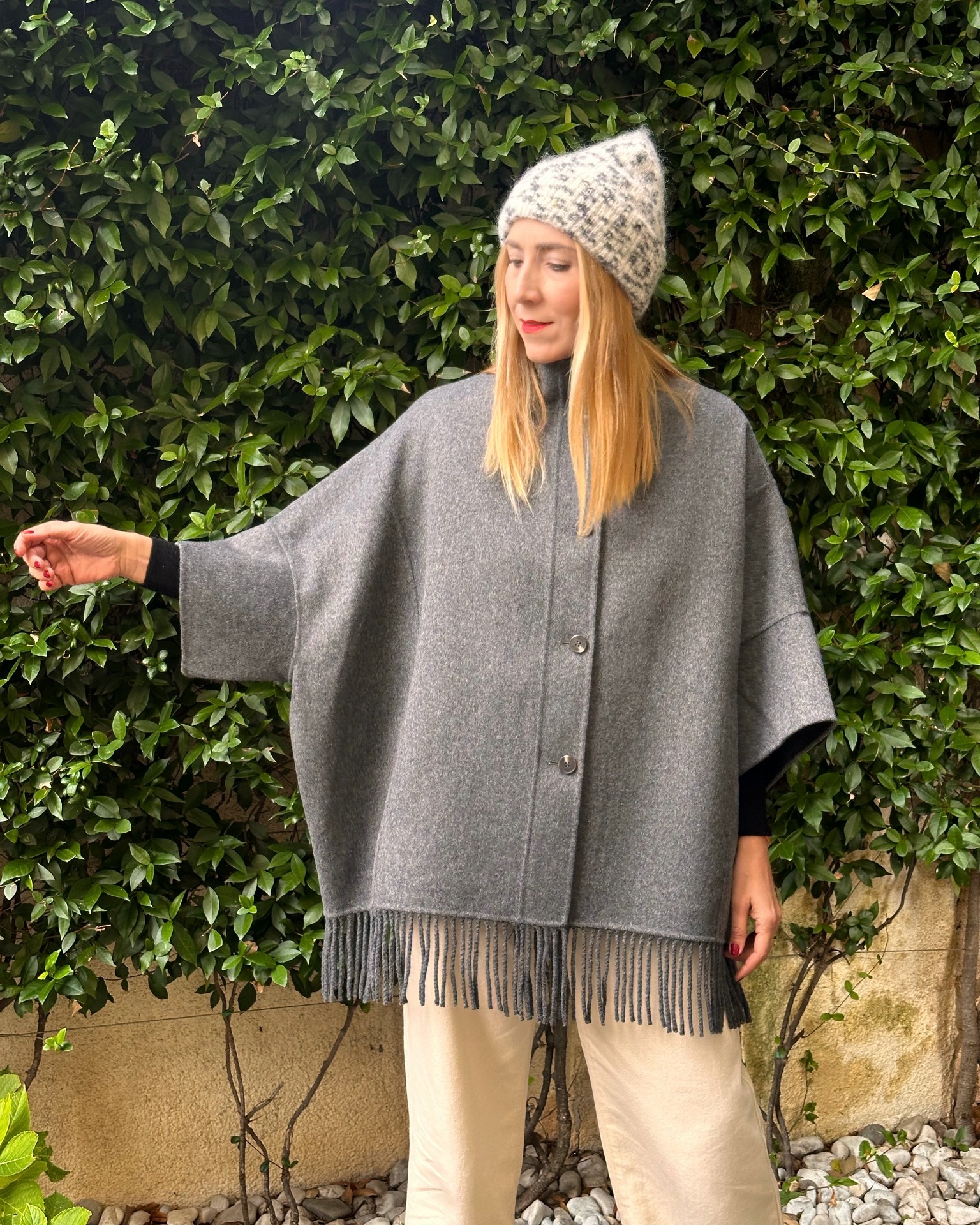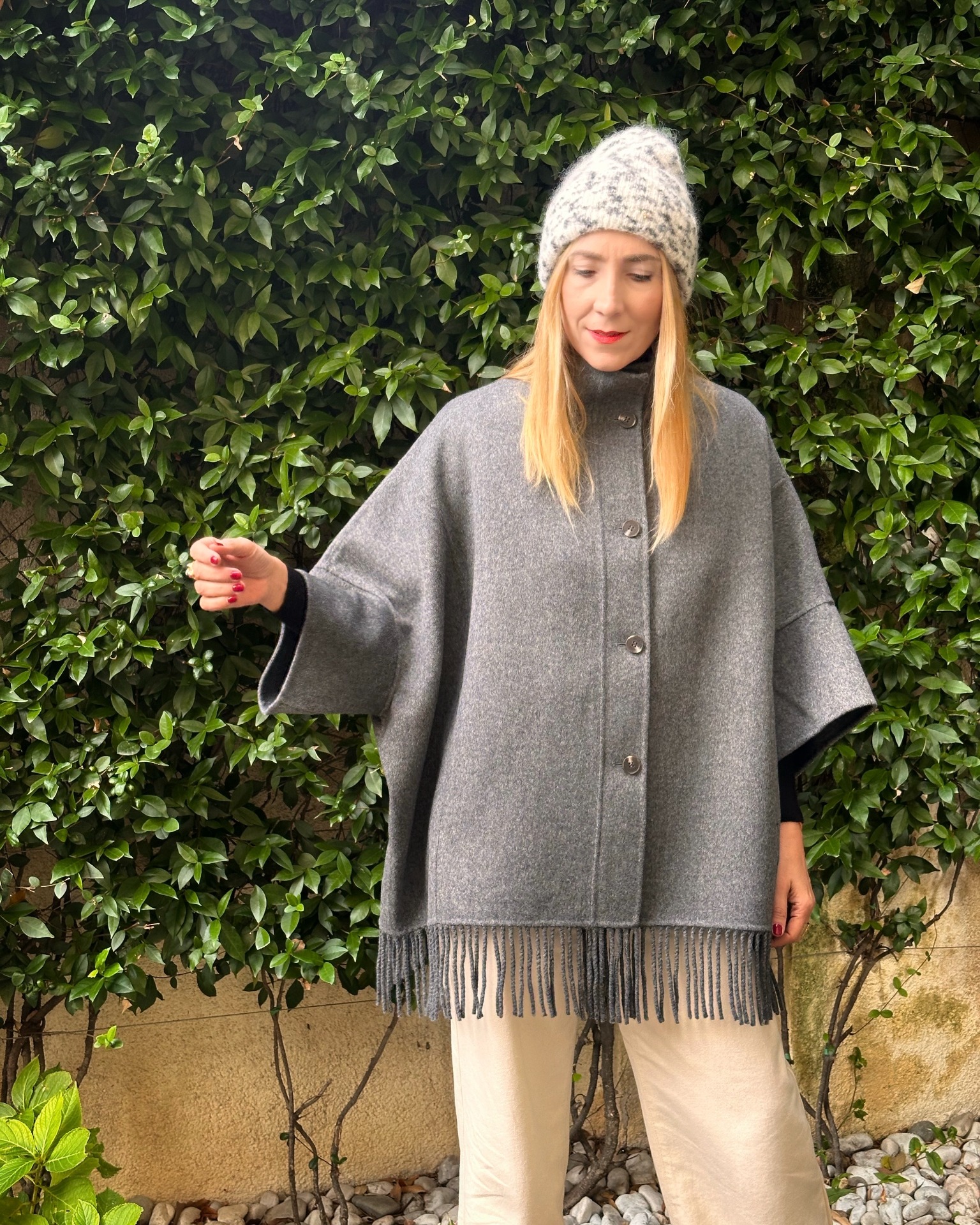 Raffinata cappa con frange, tasche laterali e chiusura con bottoni, colore grigio medio.