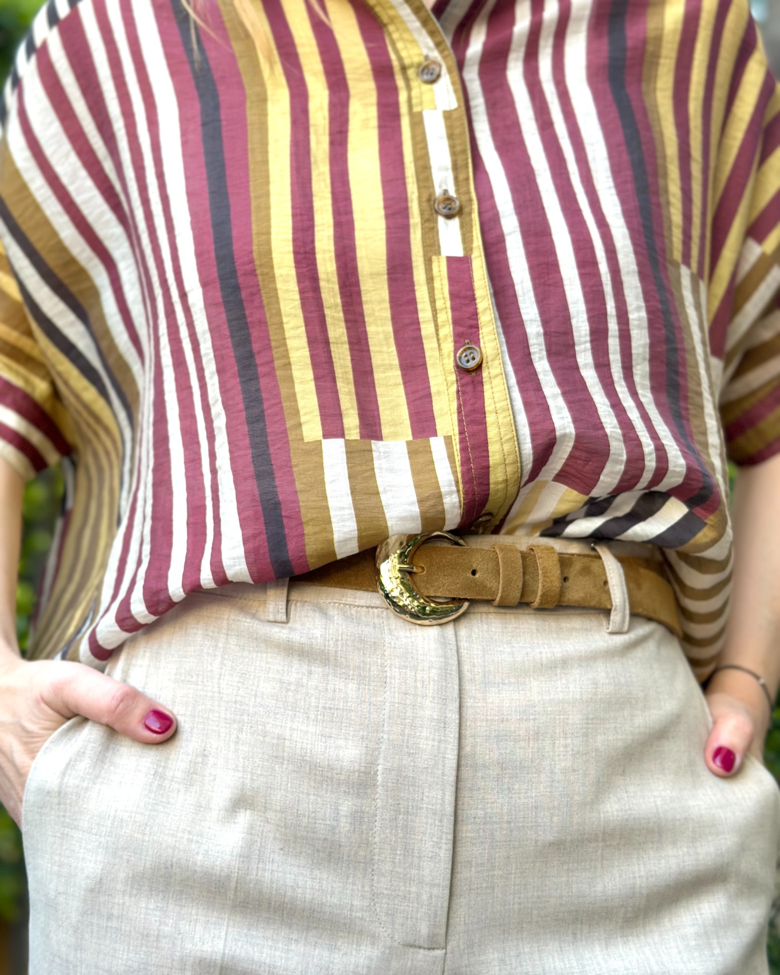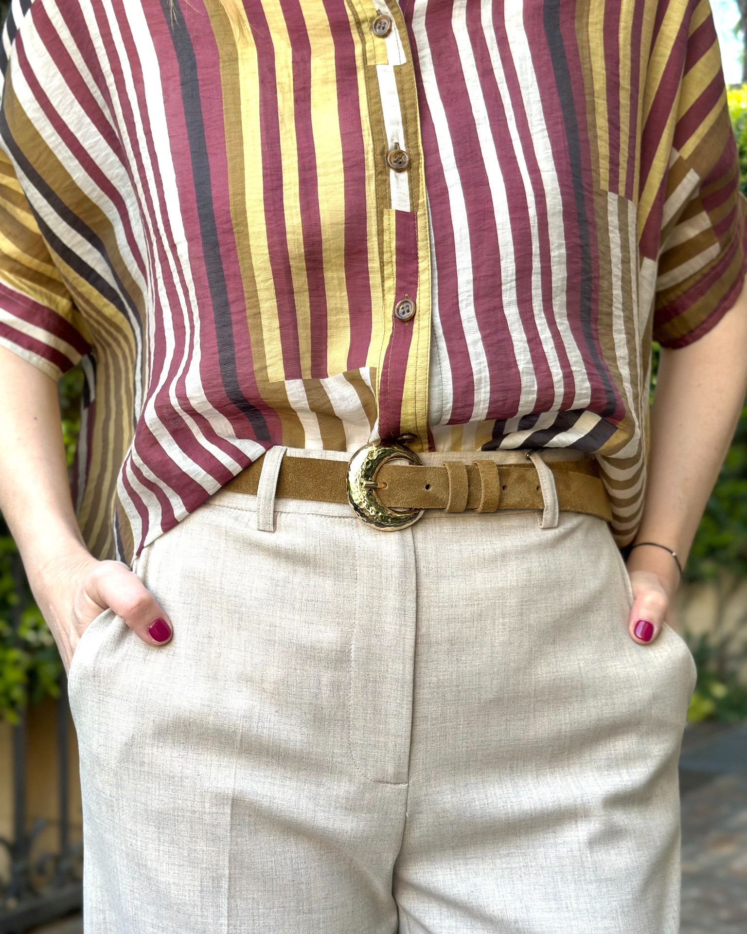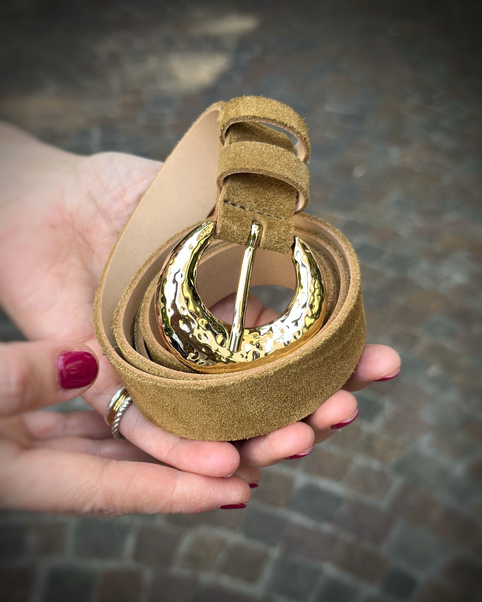 Cintura in pelle scamosciata, fibbia effetto martellato in metallo dorato.
