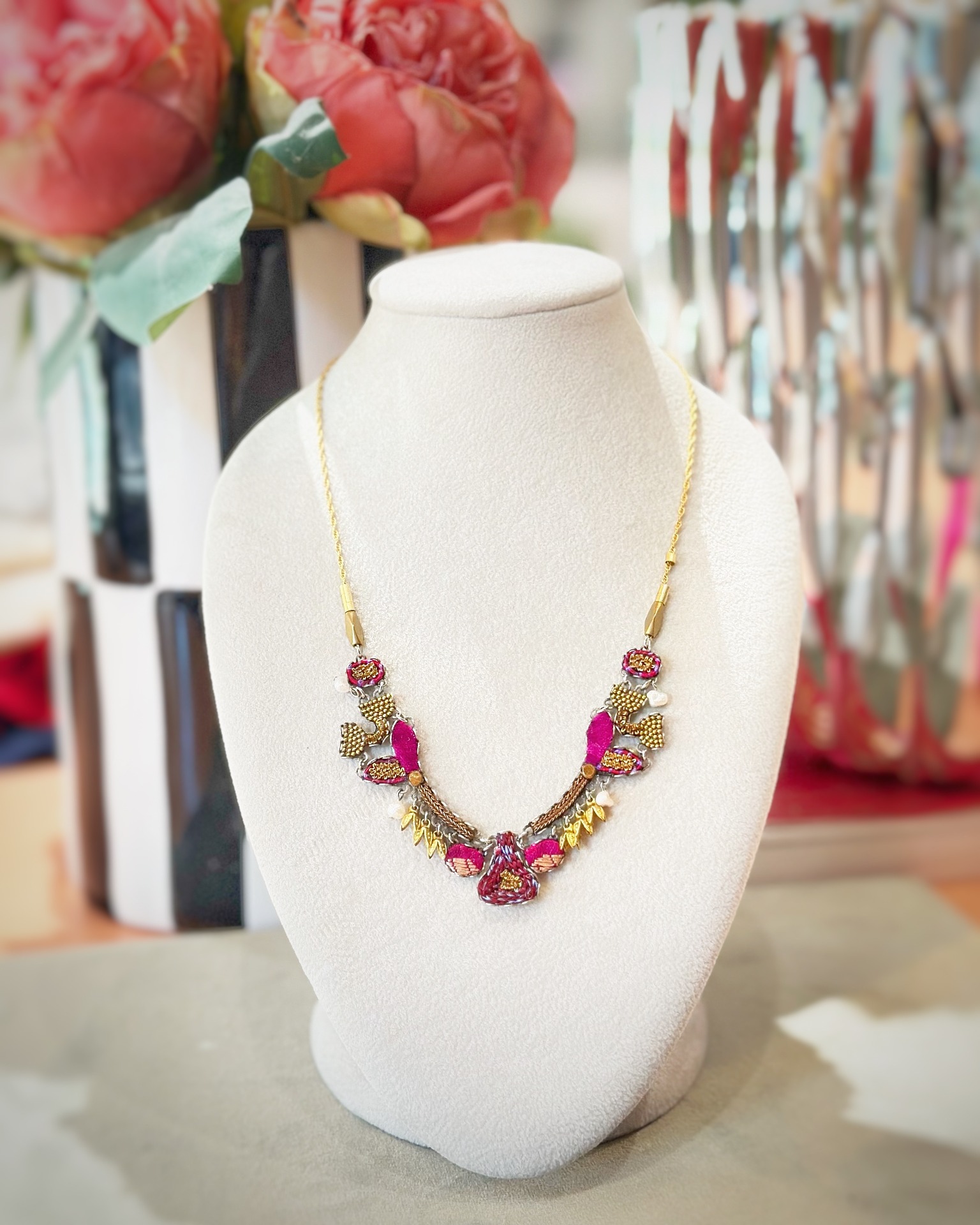 Collana artistica in ottone dorato con tessuti e perle. Lunghezza 37/47 cm regolabile