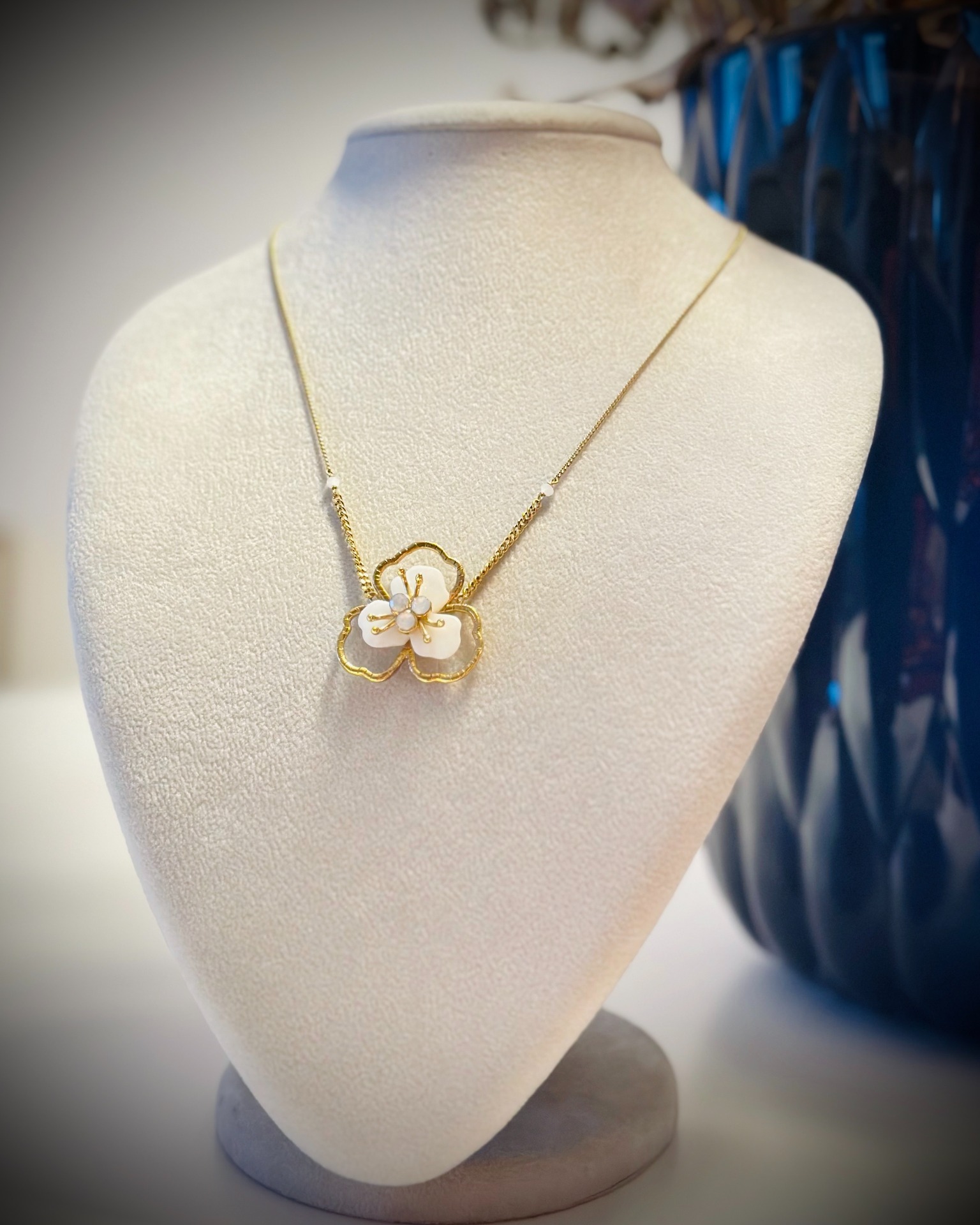 Collana in ottone dorato con fiore in madreperla e Swarovski. Lunghezza regolabile 43 cm.