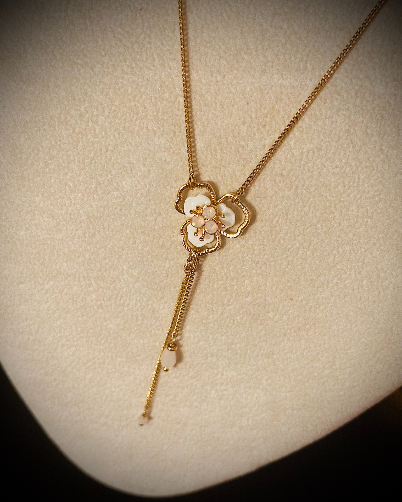 Collana in ottone dorato con fiore in madreperla e Swarovski. Lunghezza regolabile 43 cm.