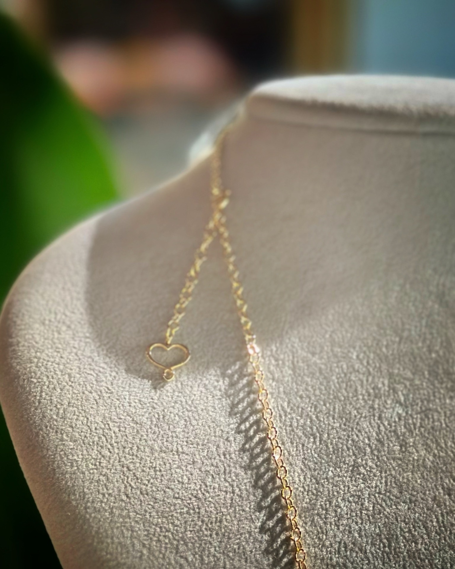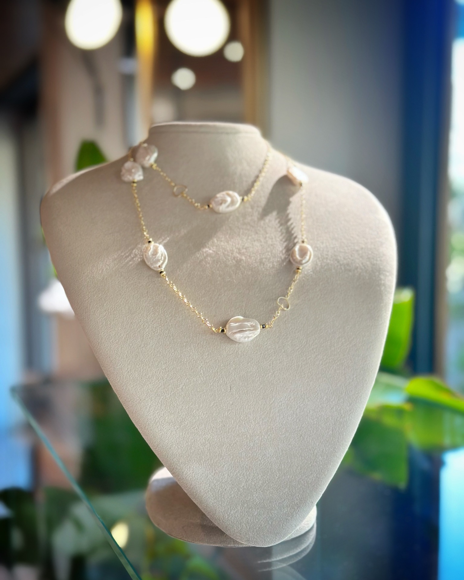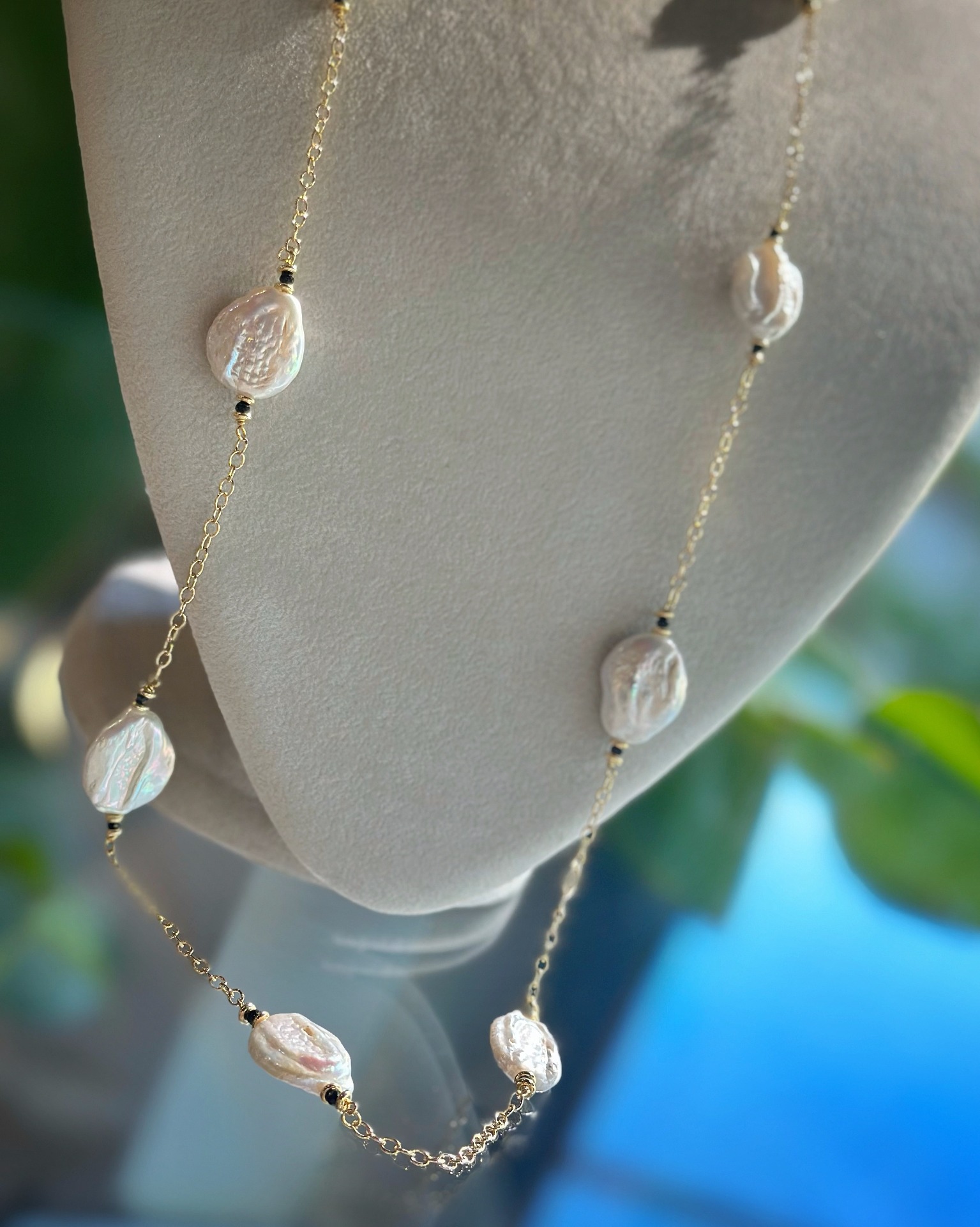 realizzata in argento 925 con galvanica oro giallo con Perle scaramazze naturali irregolari alternate a catena e cuori maman. Ogni perla presenta due pietre laterali di spinello nero sfaccettato.