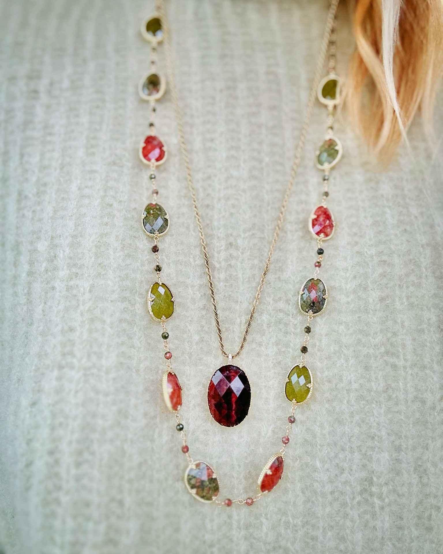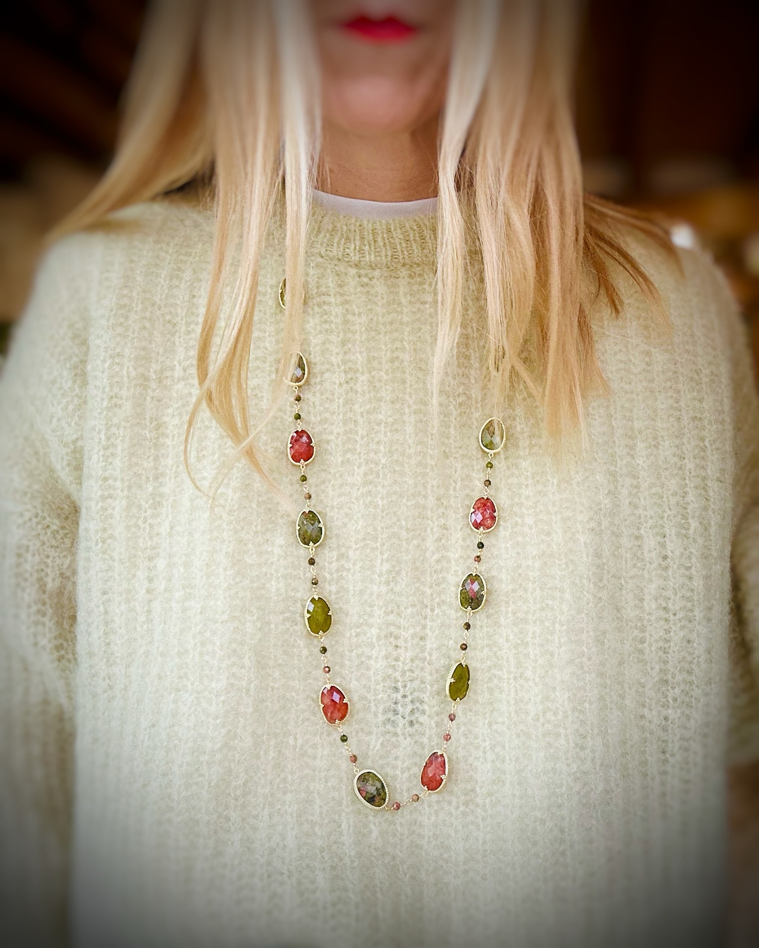 Collana in acciaio placcato gold con pietre naturali, diaspro e agata, lunghezza regolabile 90 cm.