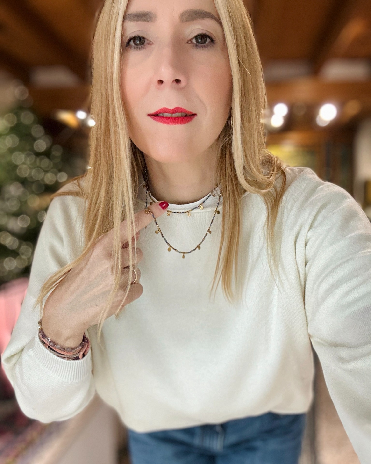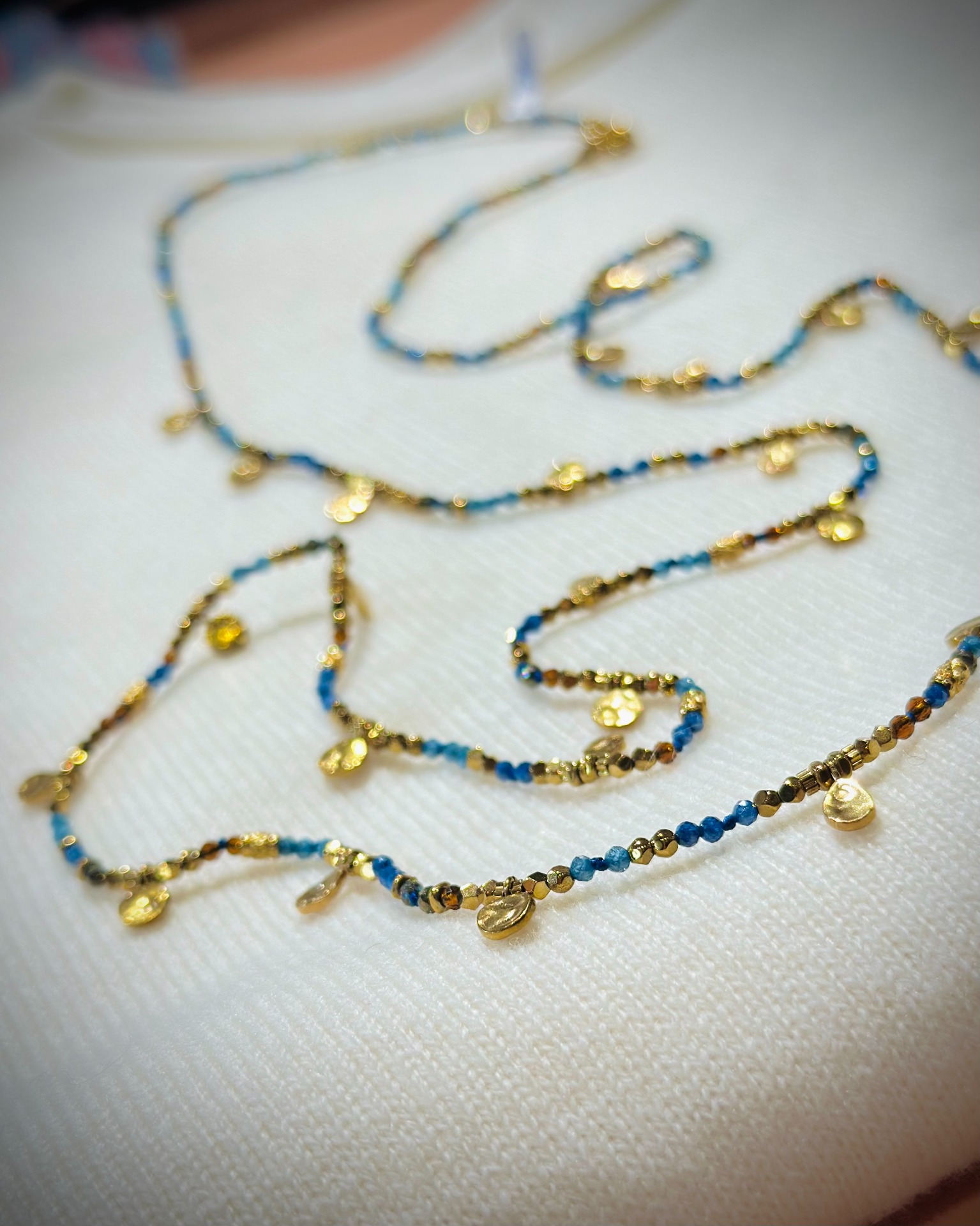 Collana lunga con pietre naturali e dettagli in acciaio placcato gold.