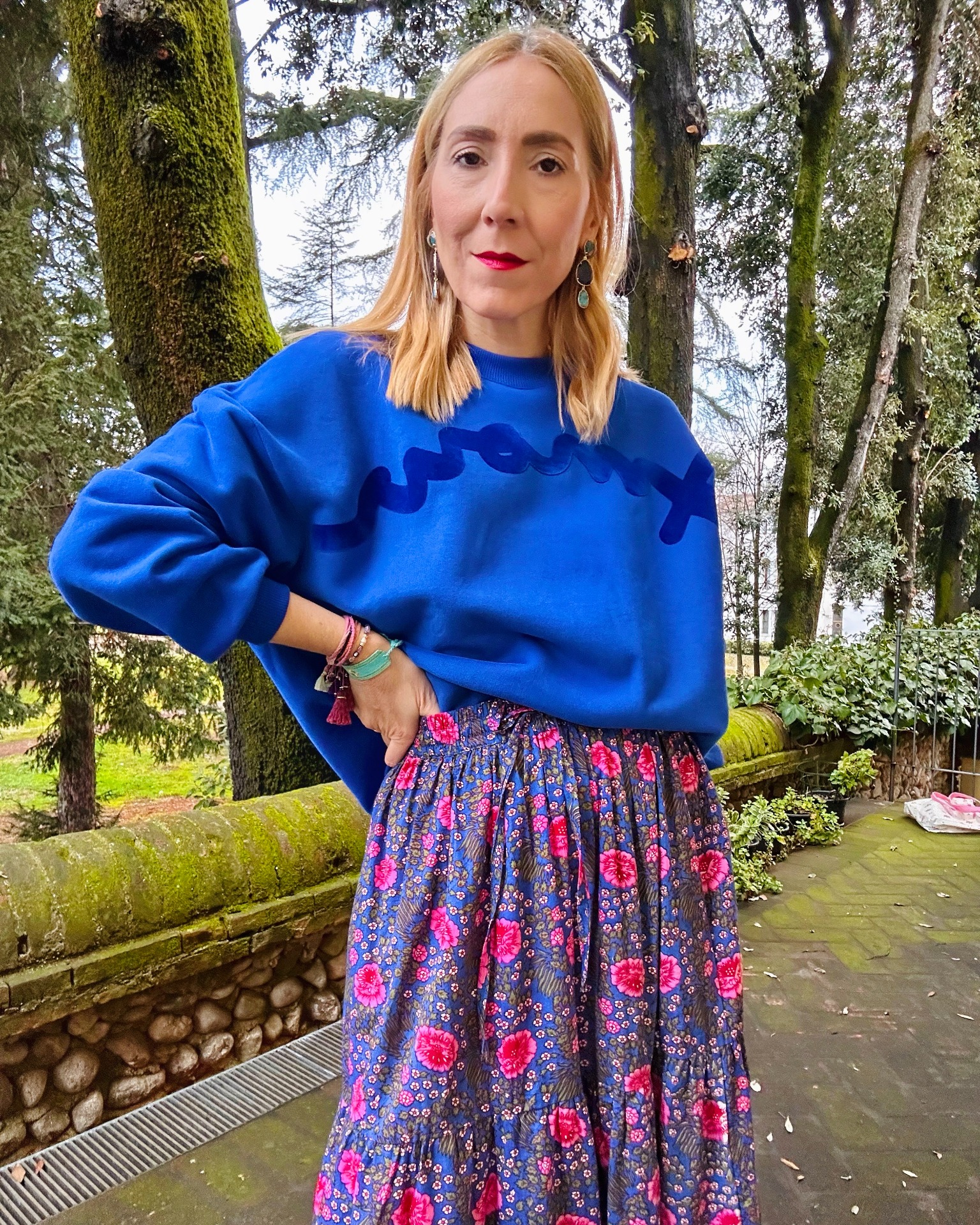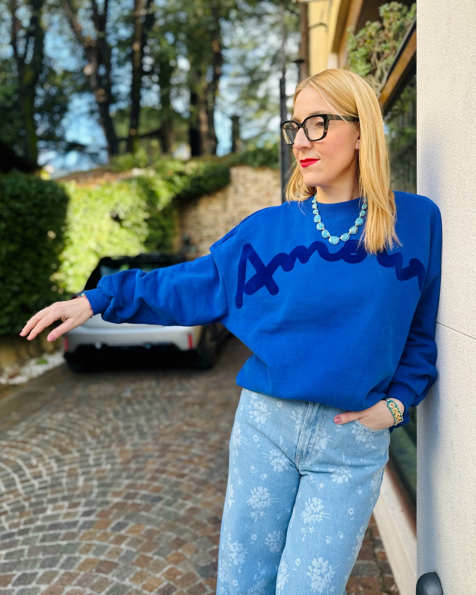 Felpa in cotone blu indigo, taglio oversize, stampa amour in rilievo.