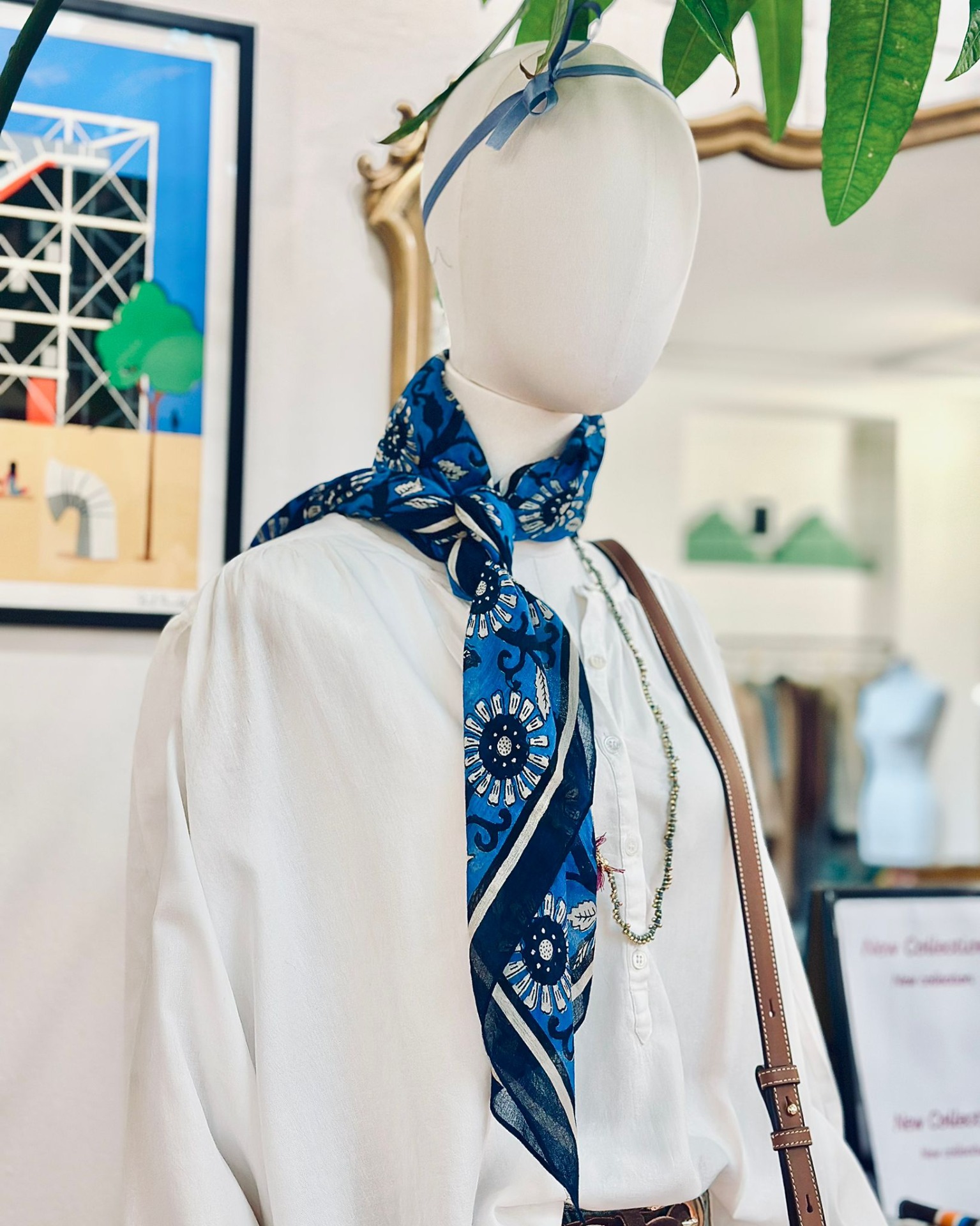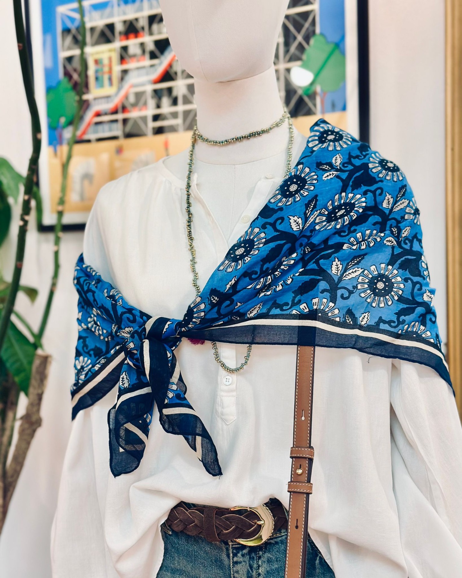 Foulard in cotone stampato a mano, colori blu/ecrù/nero. Misura 100x100 cm