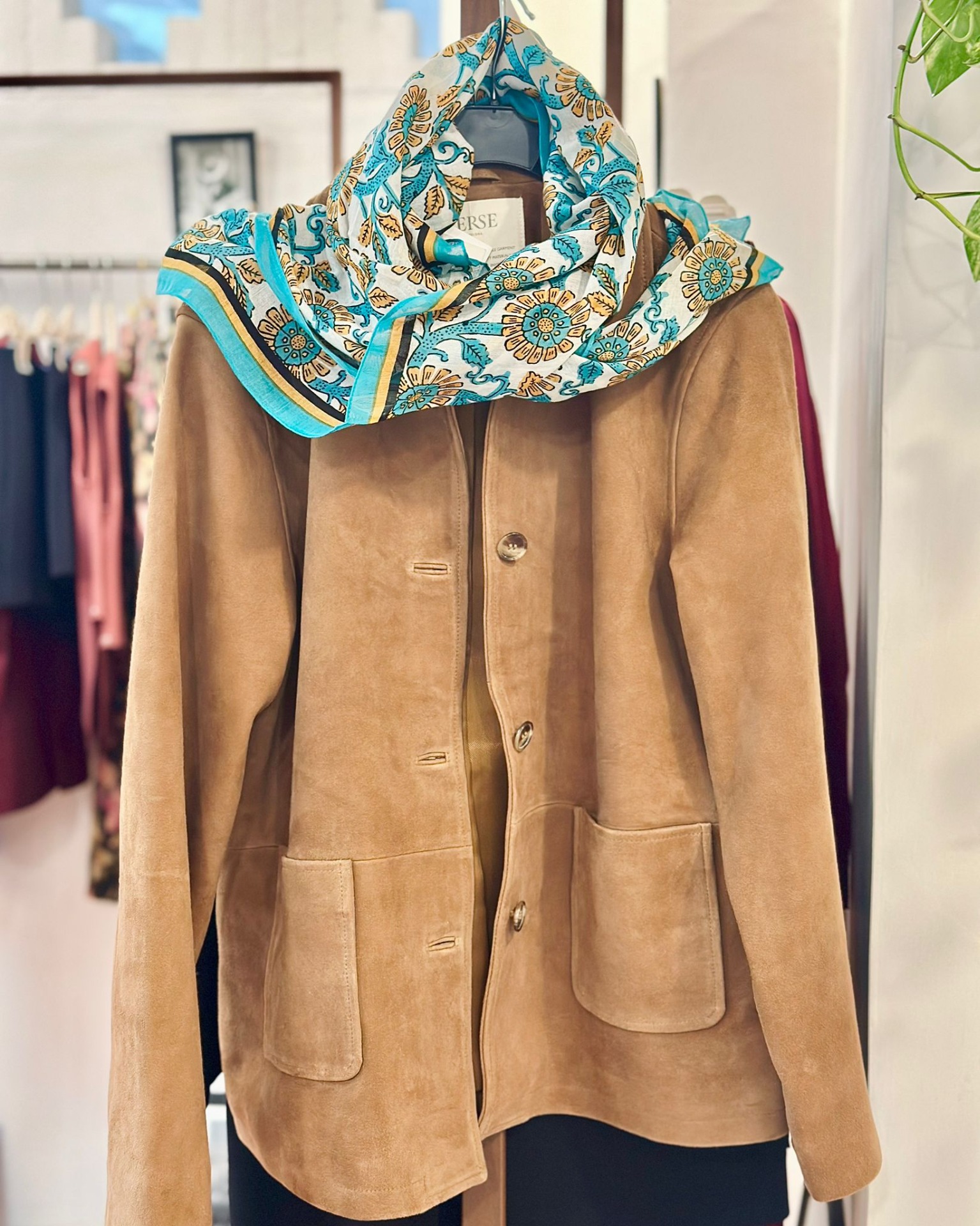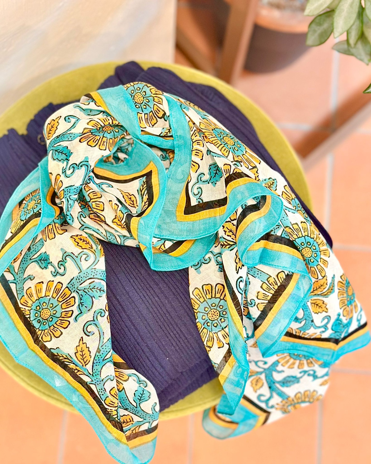 Foulard in cotone stampato a mano, colori turchese/bianco/sole. Misura 100x100 cm