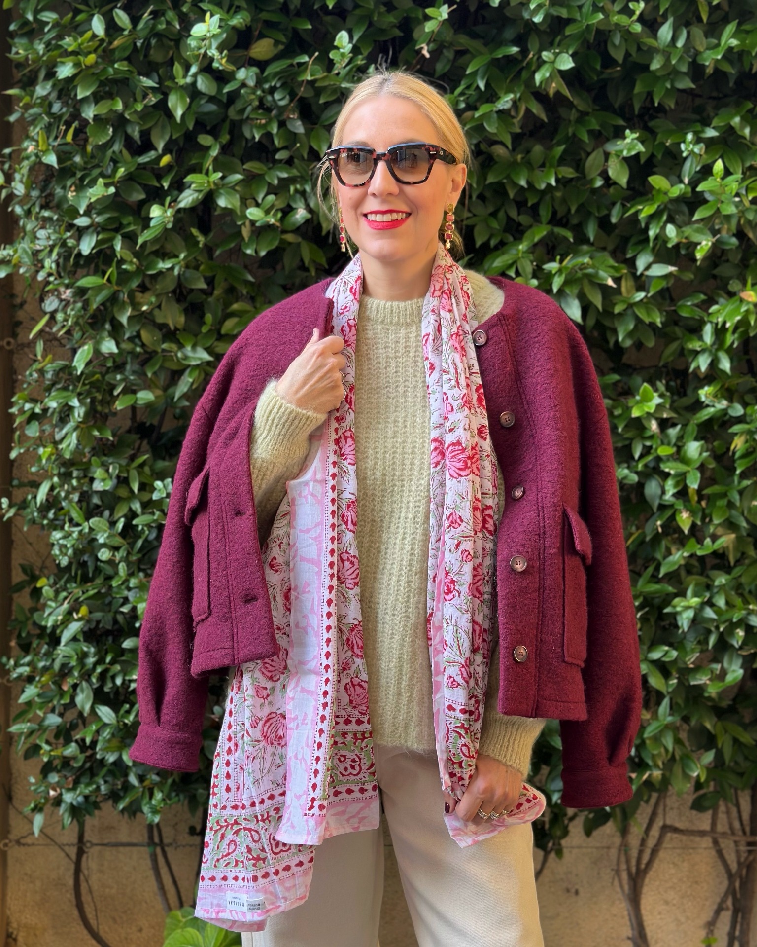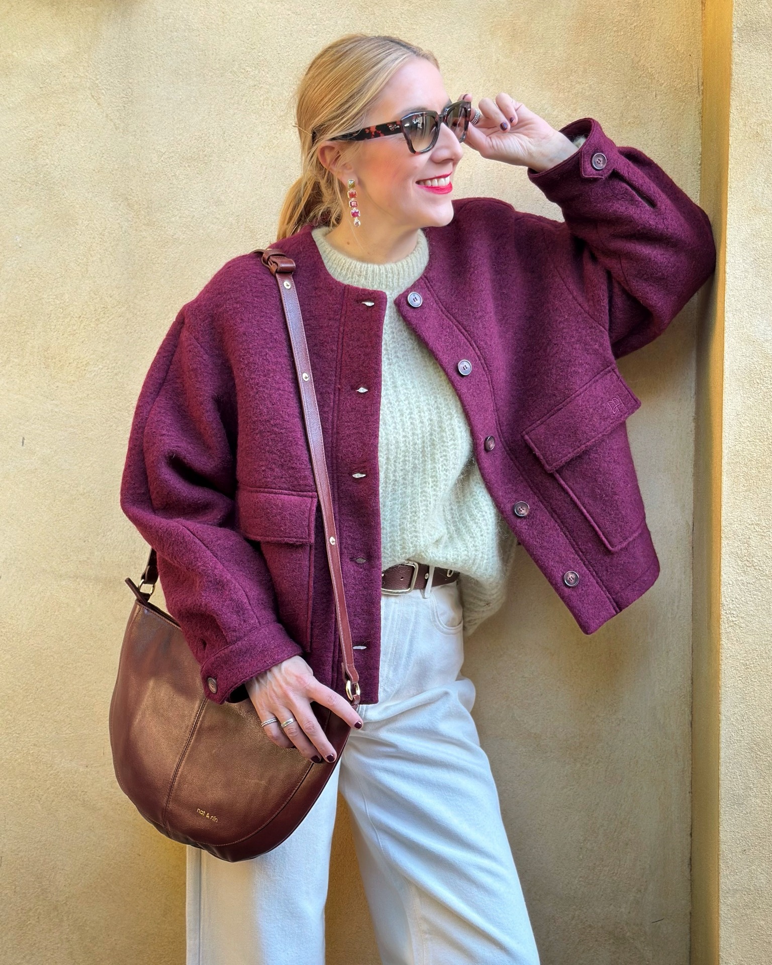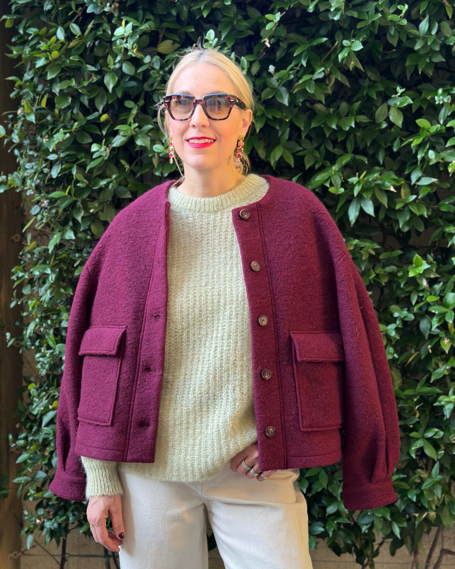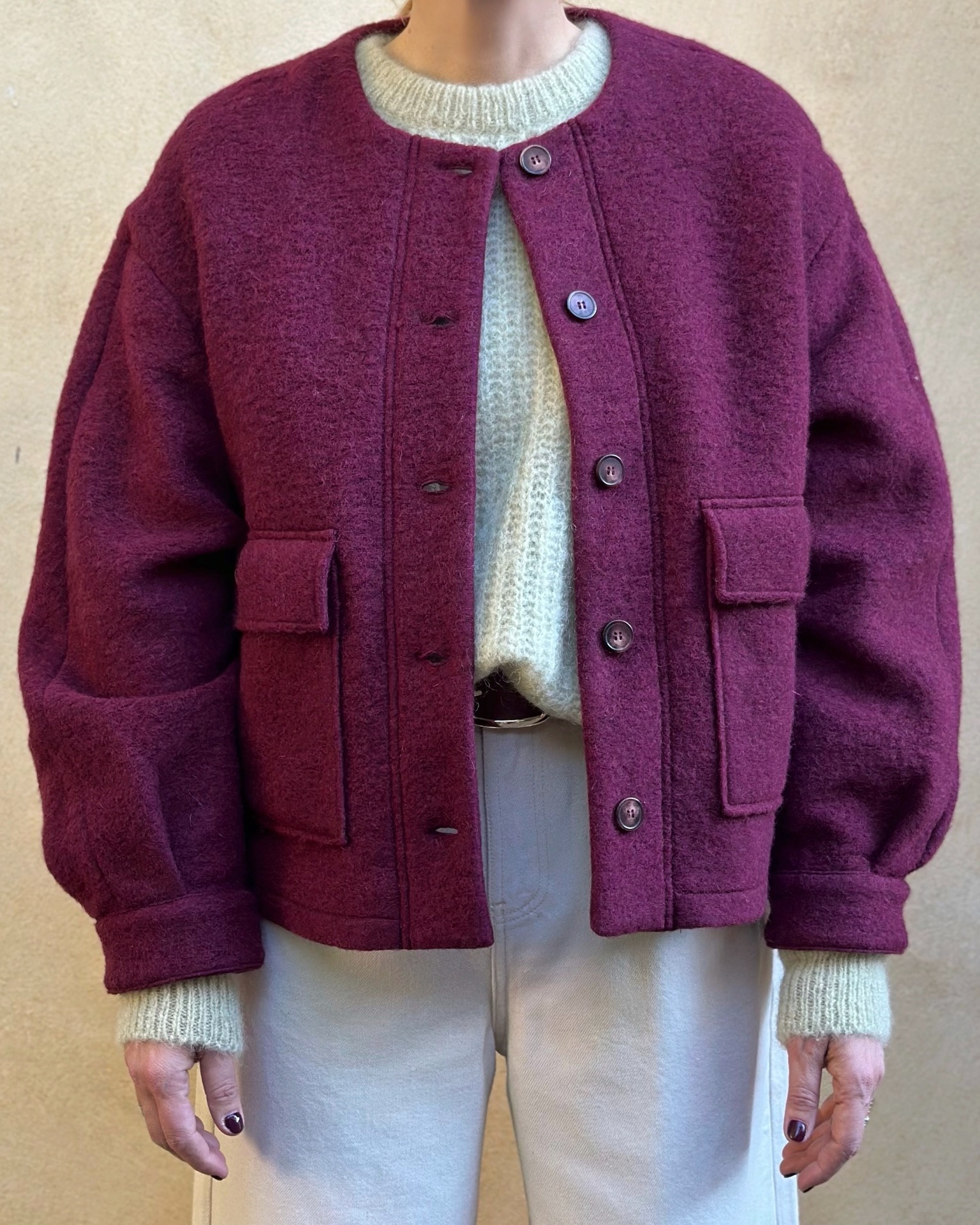 Giacca bomber girocollo in lana cotta, silhouette minimalista.