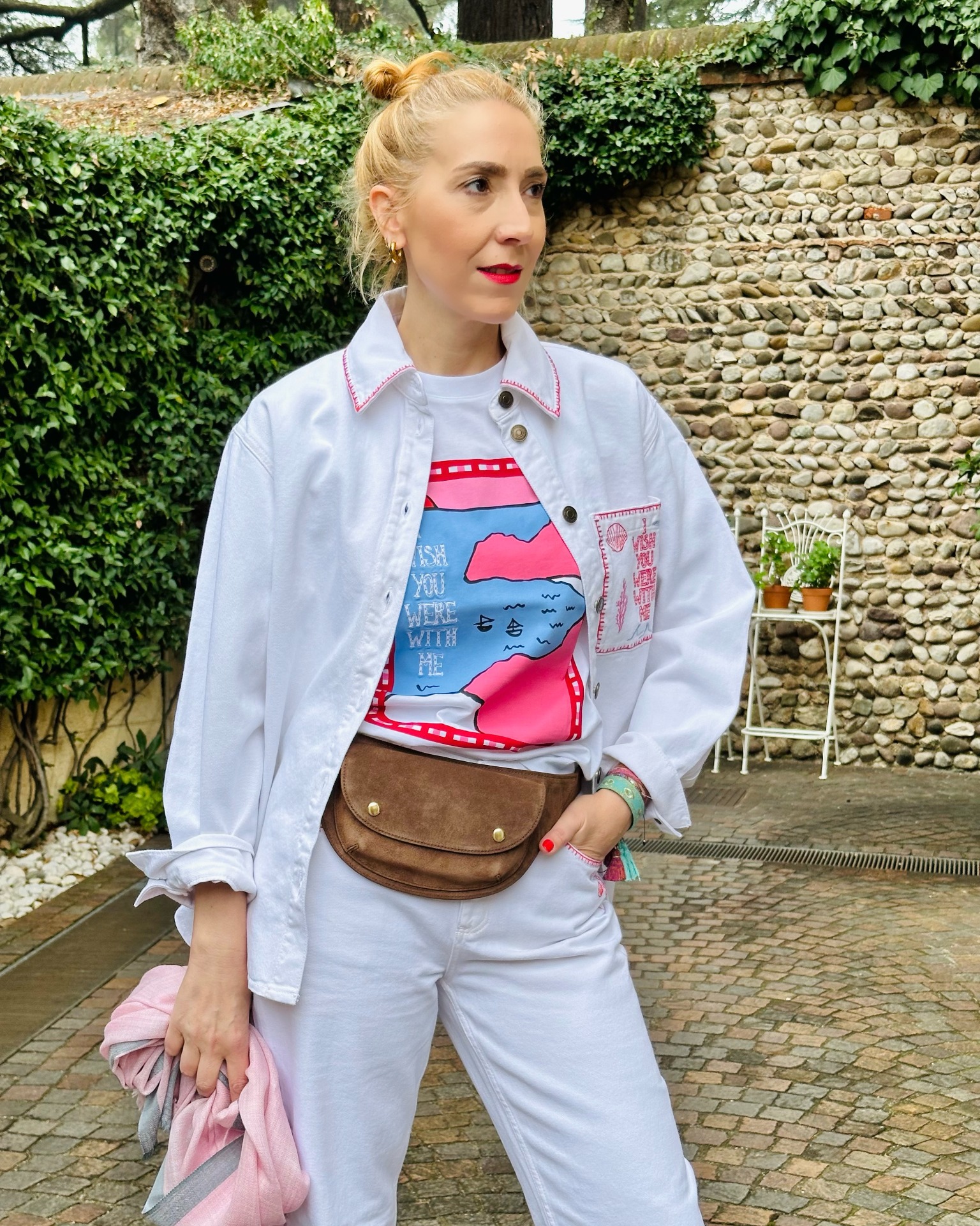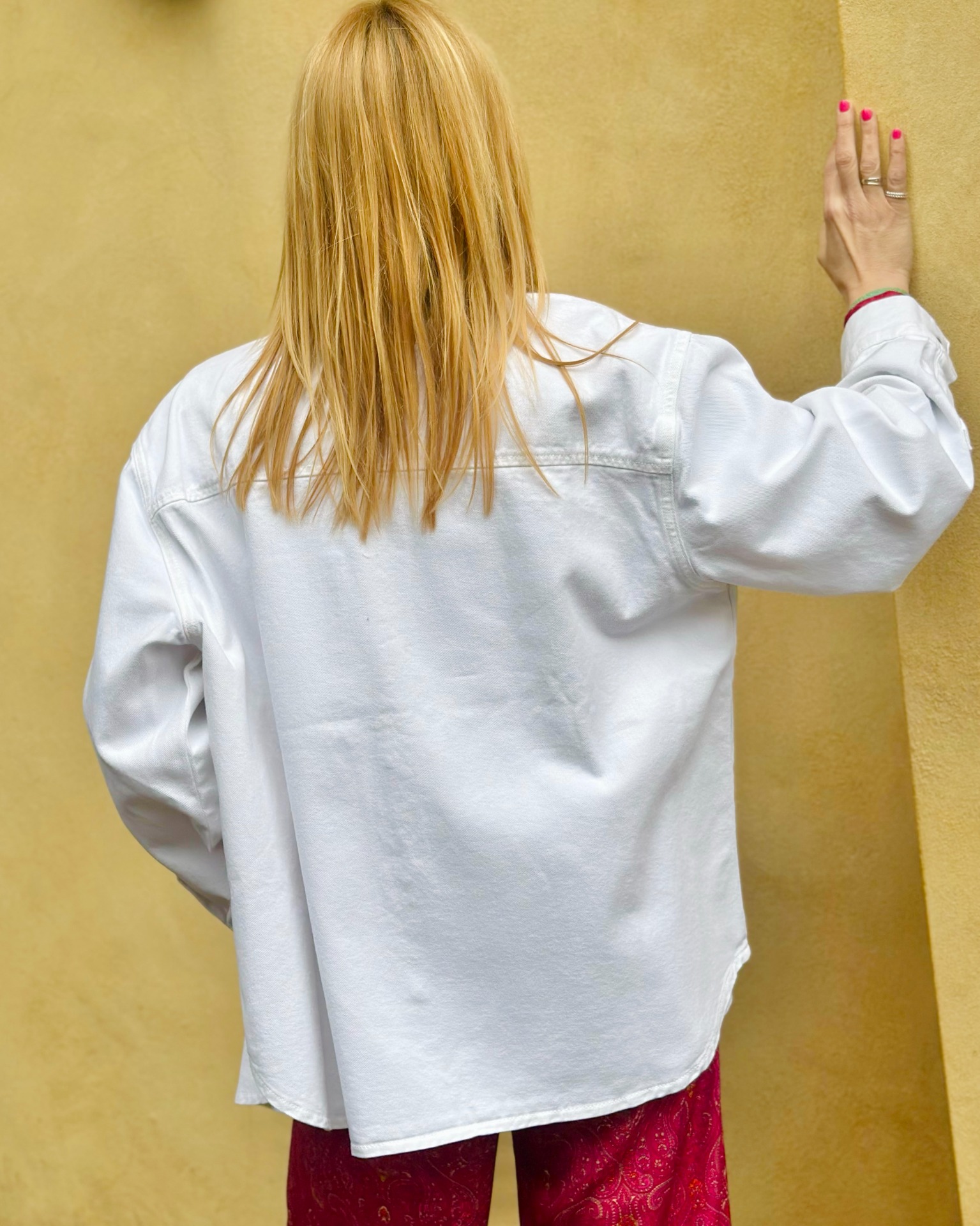 Giacca/Camicia in canvas bianco con ricami a contrasto sul colletto e sulla tasca frontale.