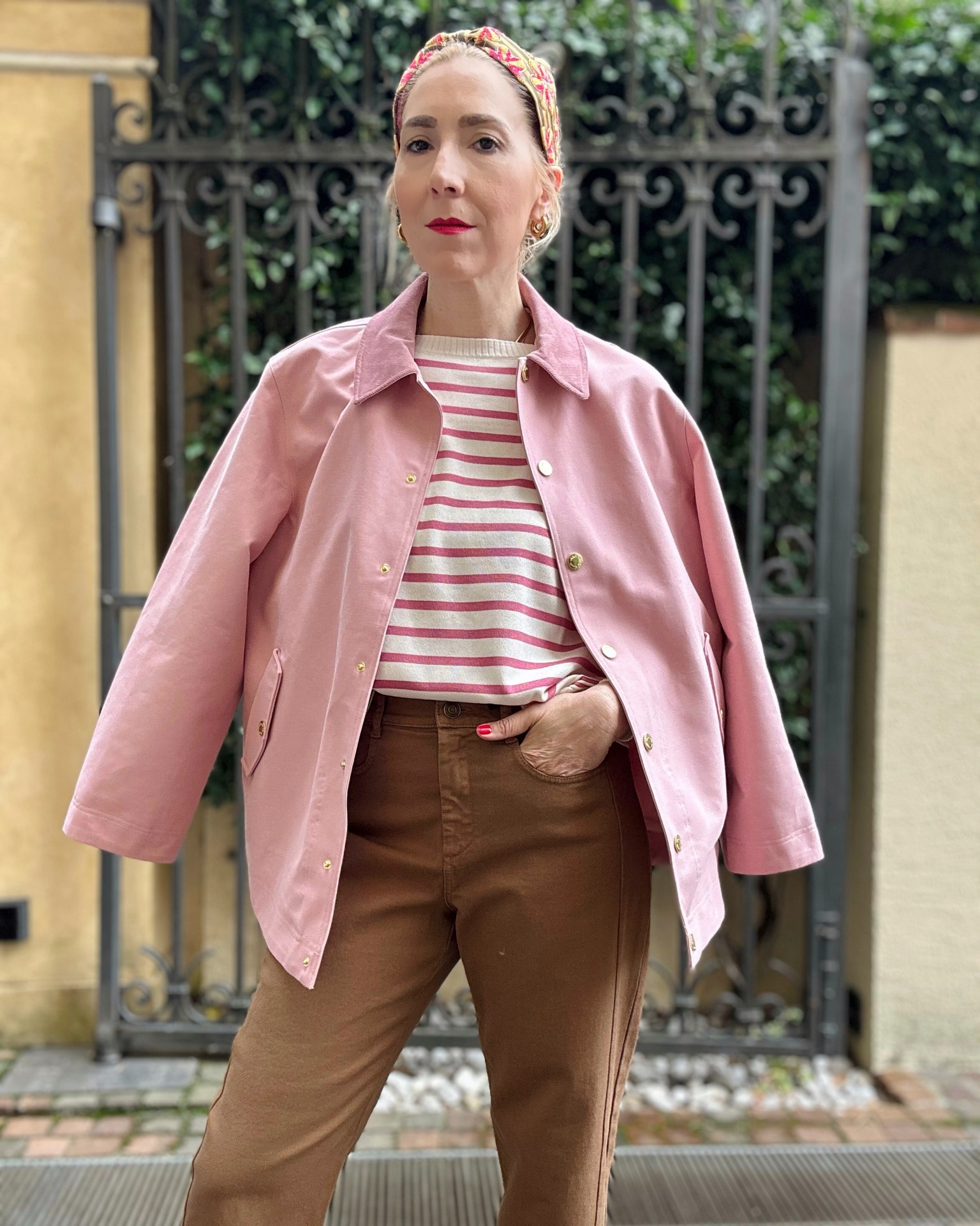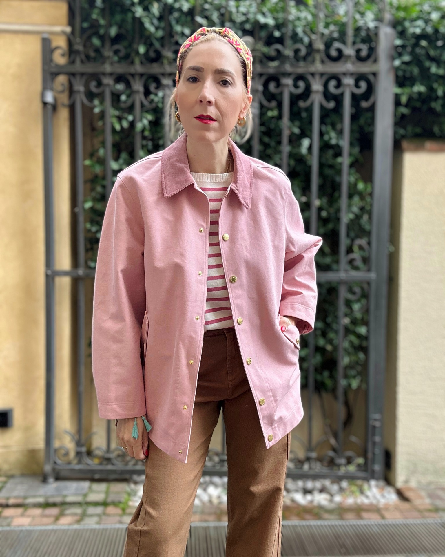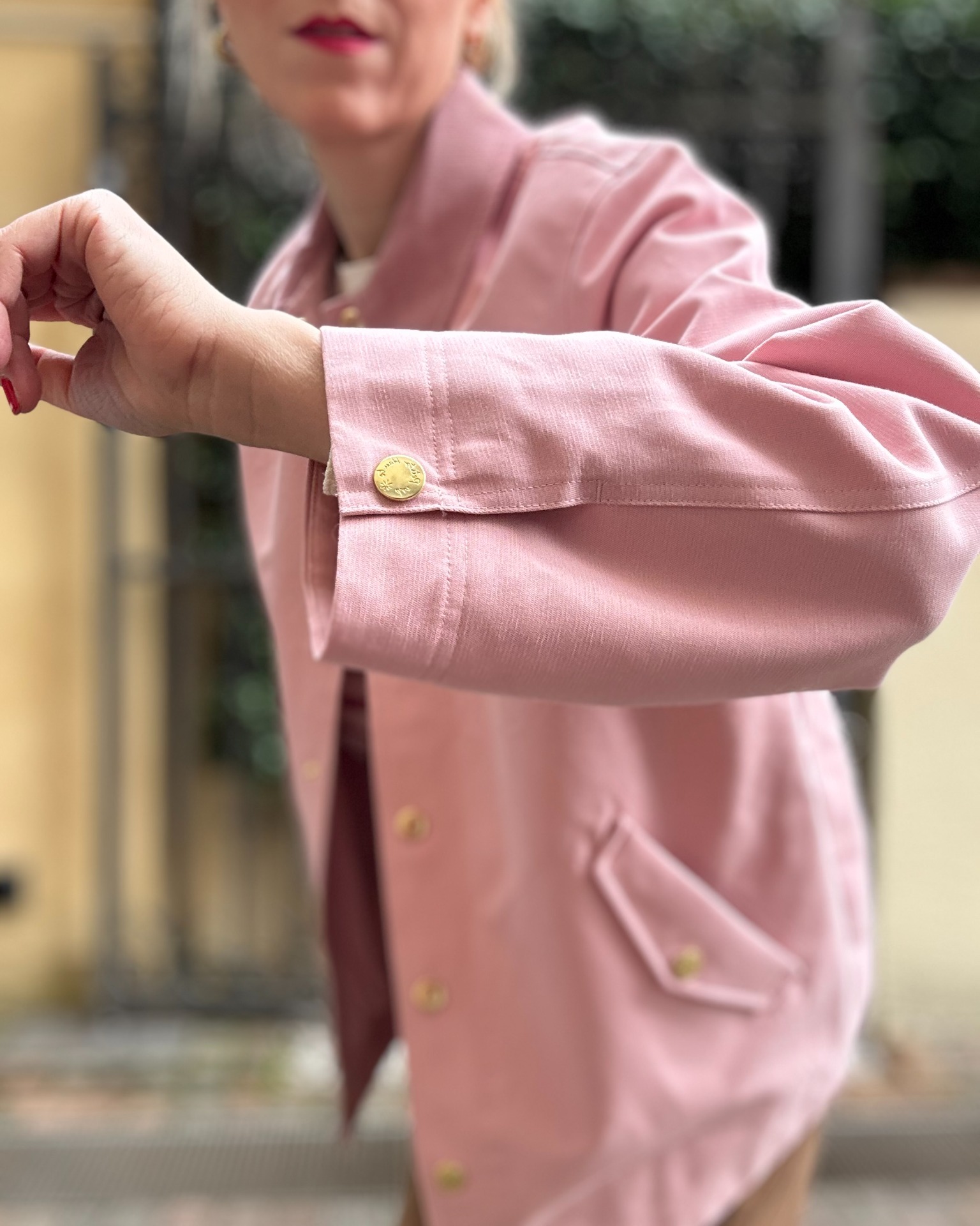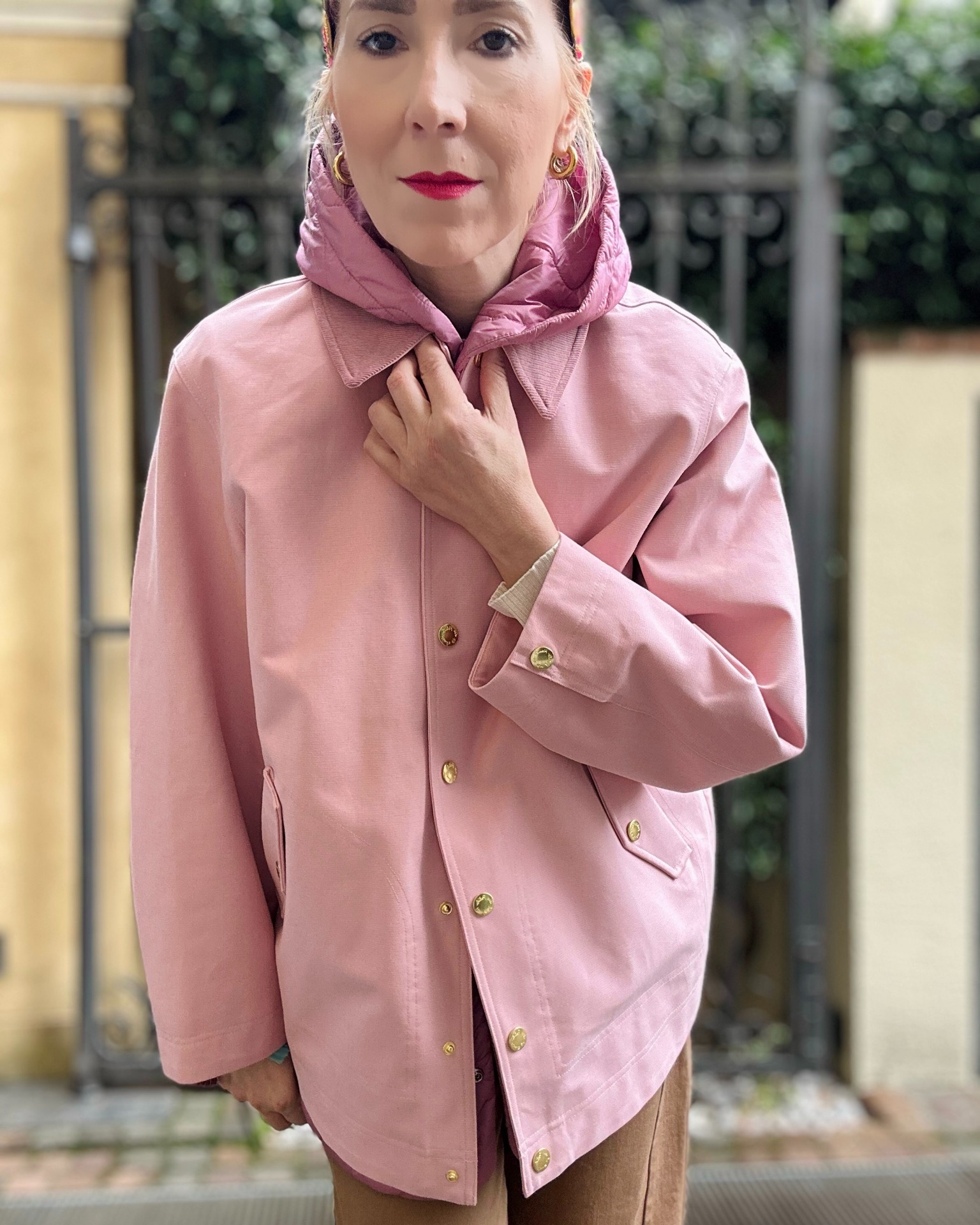 Giacca rosa in 100% cotone idrorepellente, foderata con colletto in gradazione più scura.