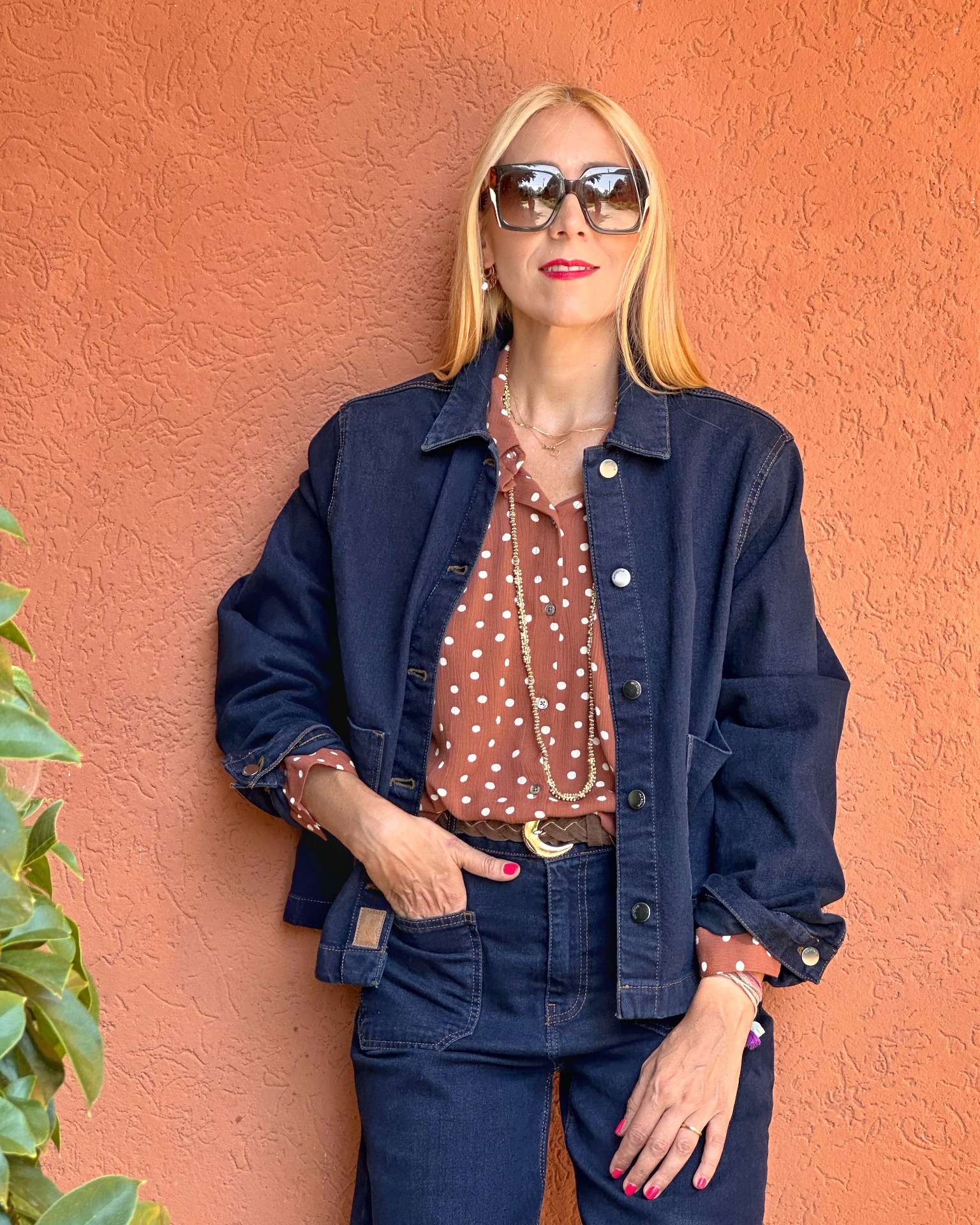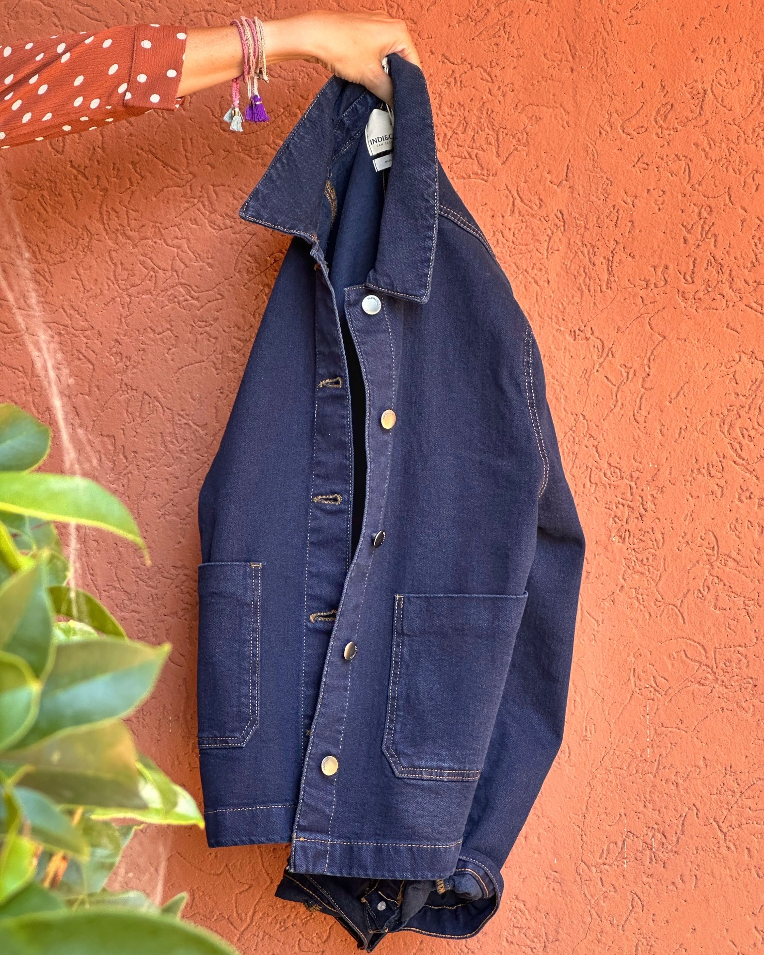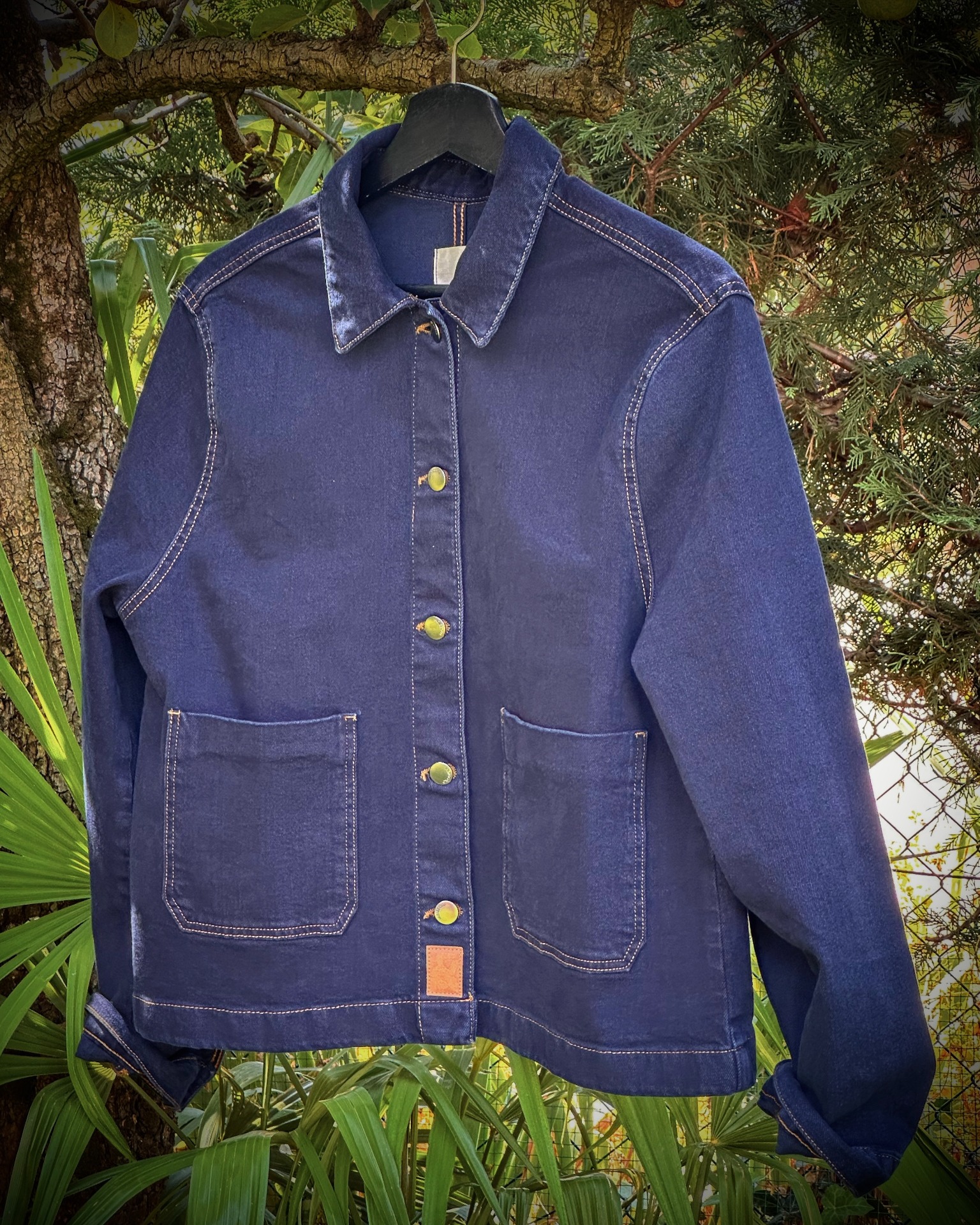 Giacca in denim blu scuro, bottoni gold, tasche davanti. Materiale 99% cotone e 1% elastan.