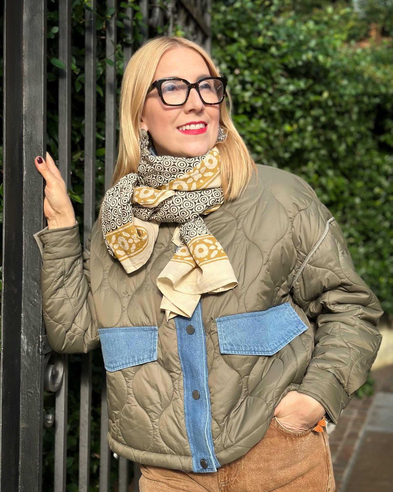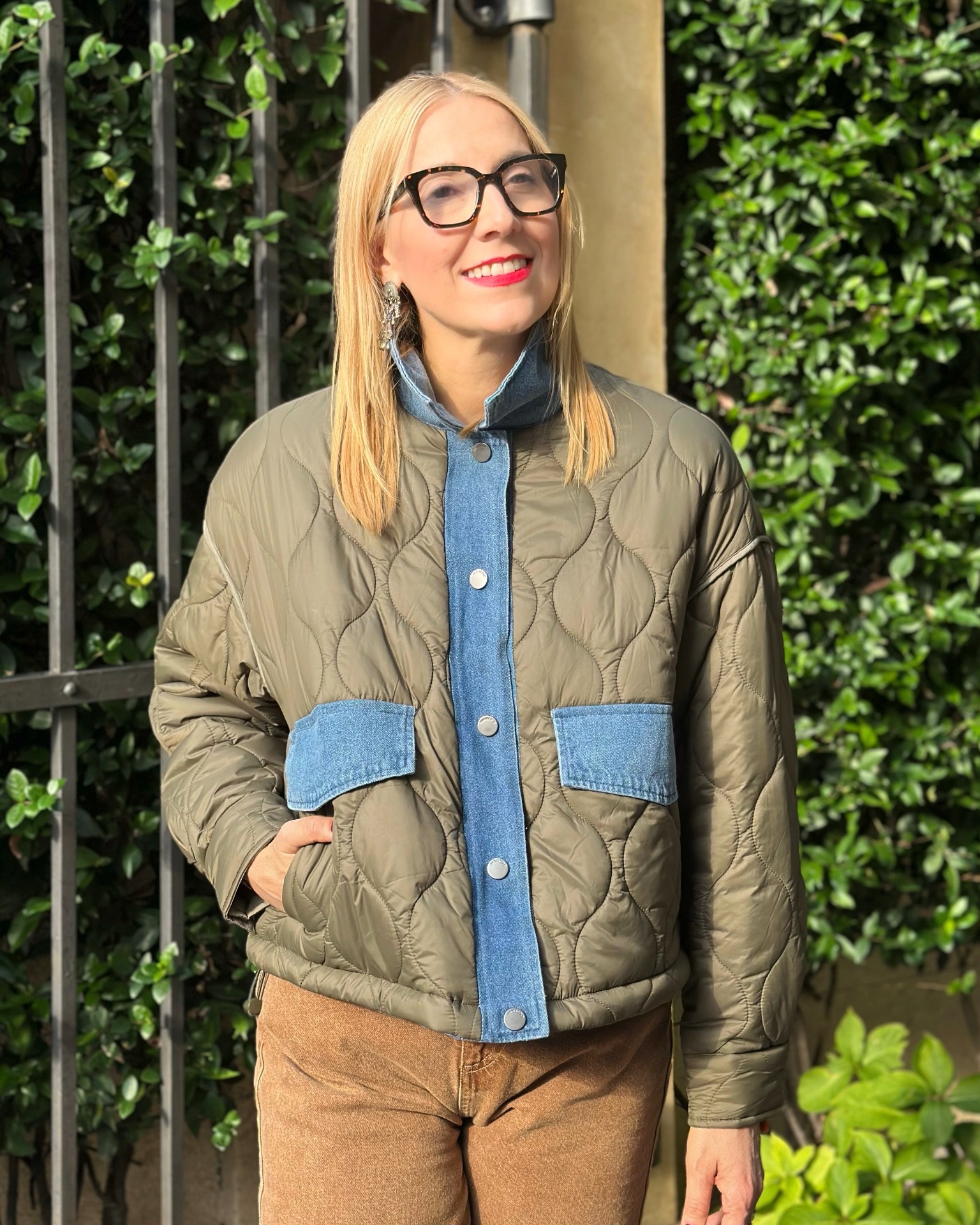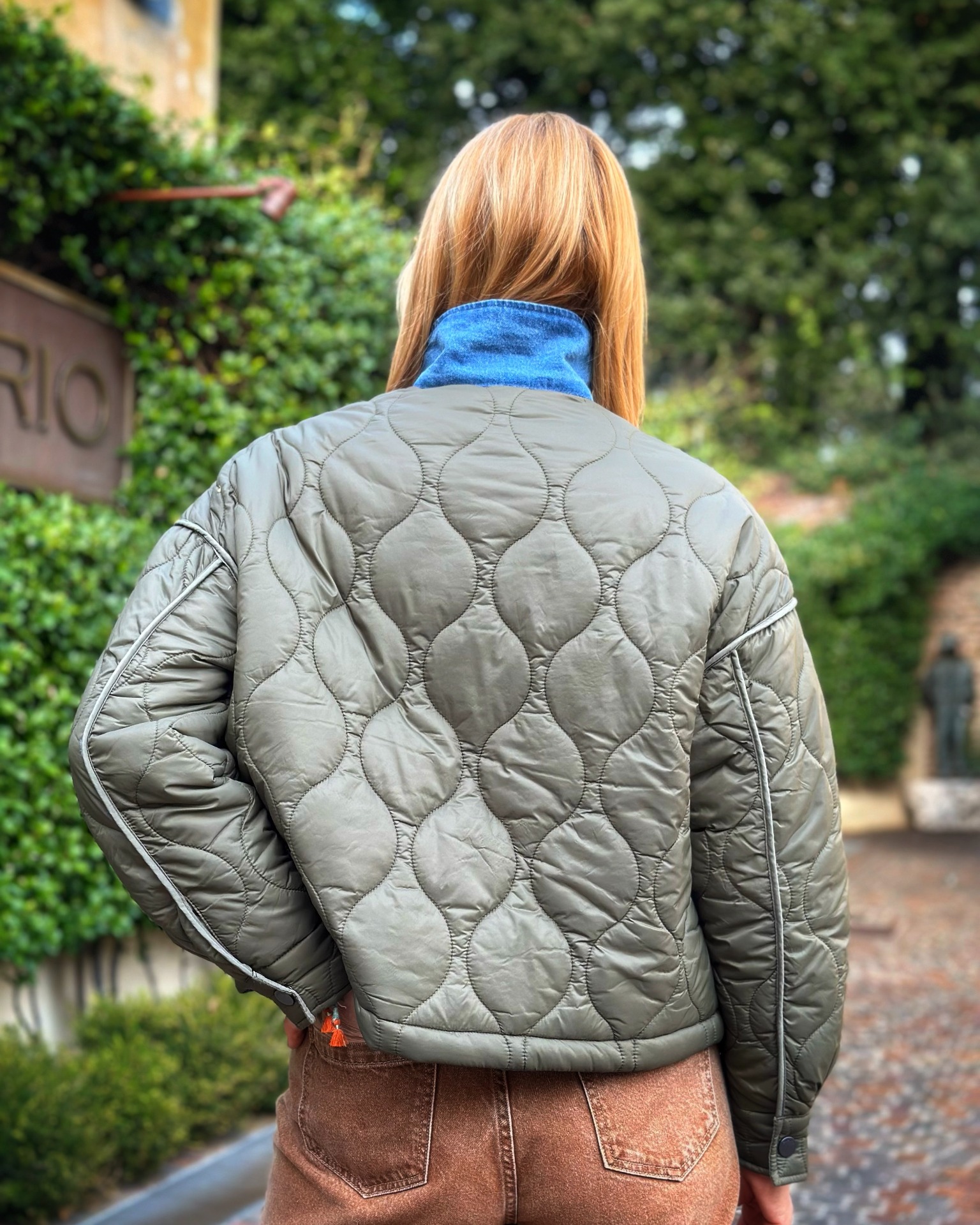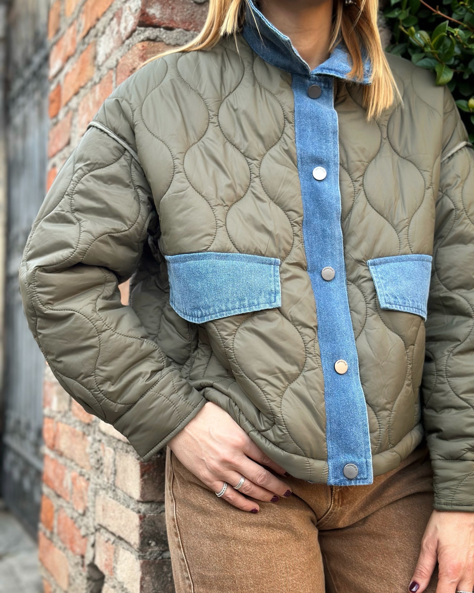 Giacca trapuntata kaki con dettagli in denim a contrasto.