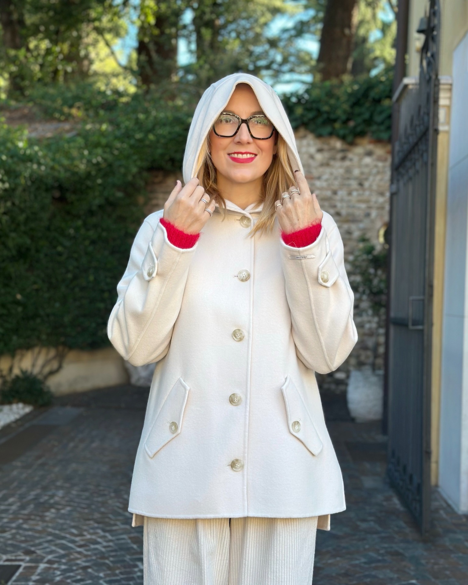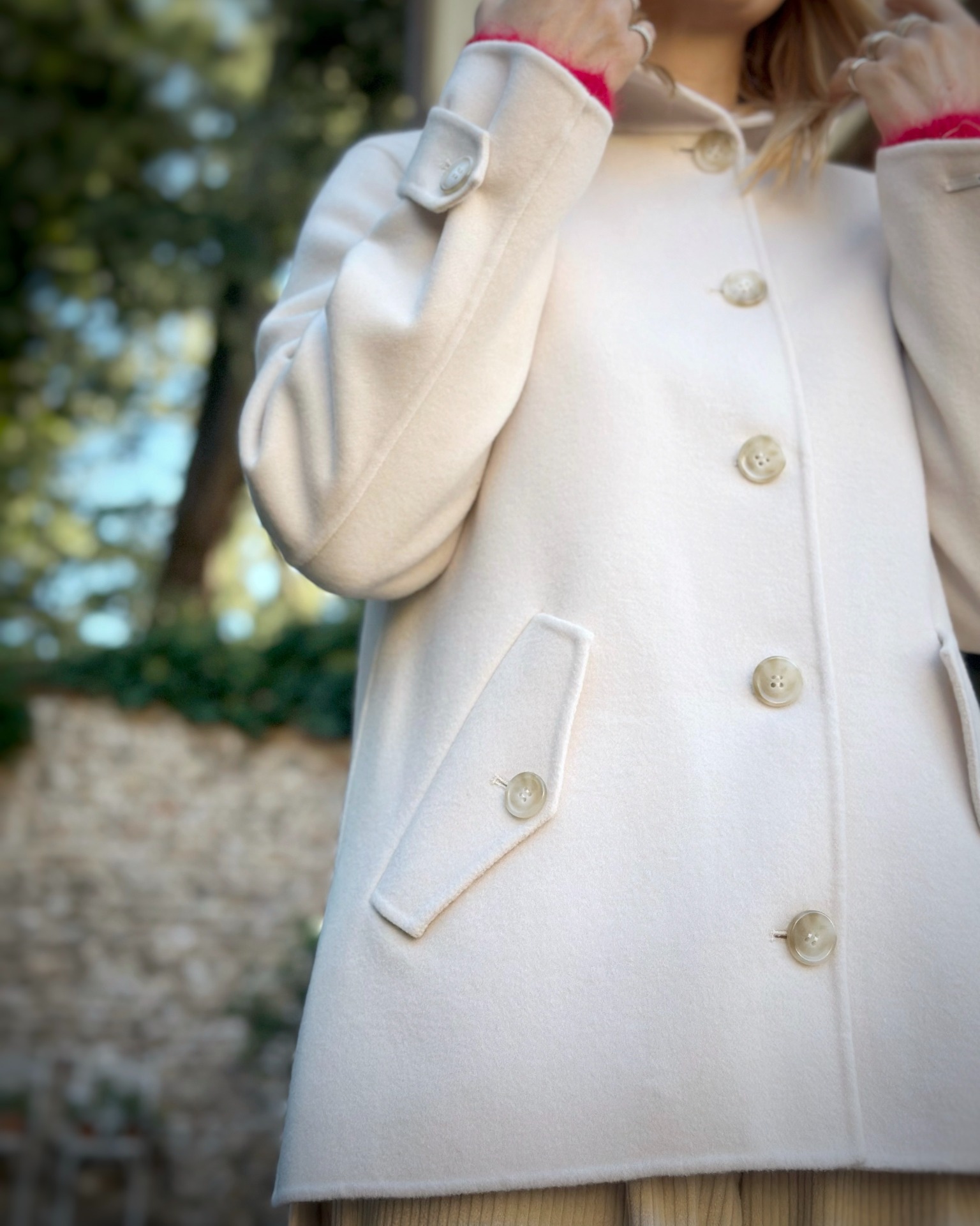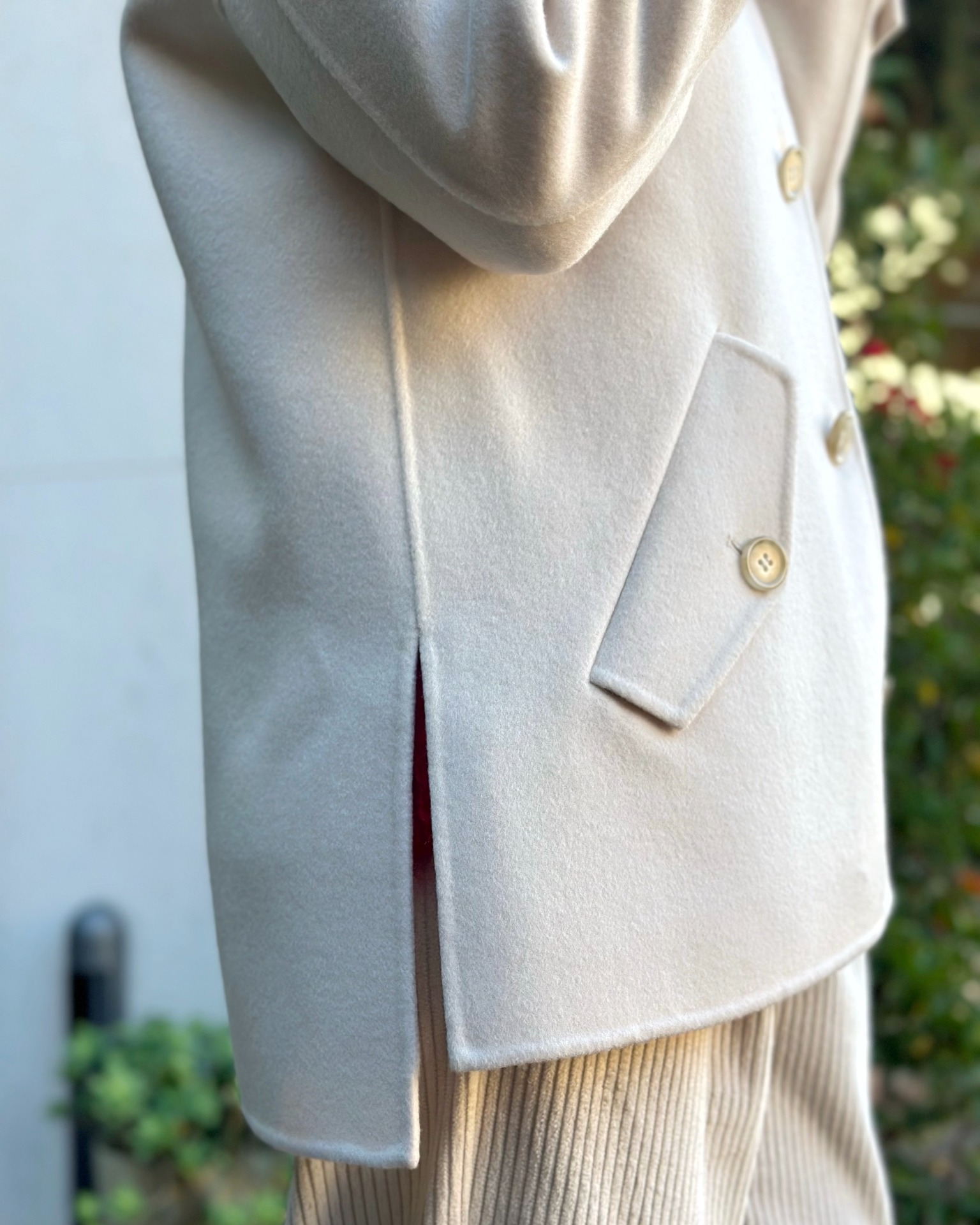 Giaccone corto sfoderato in lana, cappuccio e chiusura con bottoni in tinta.