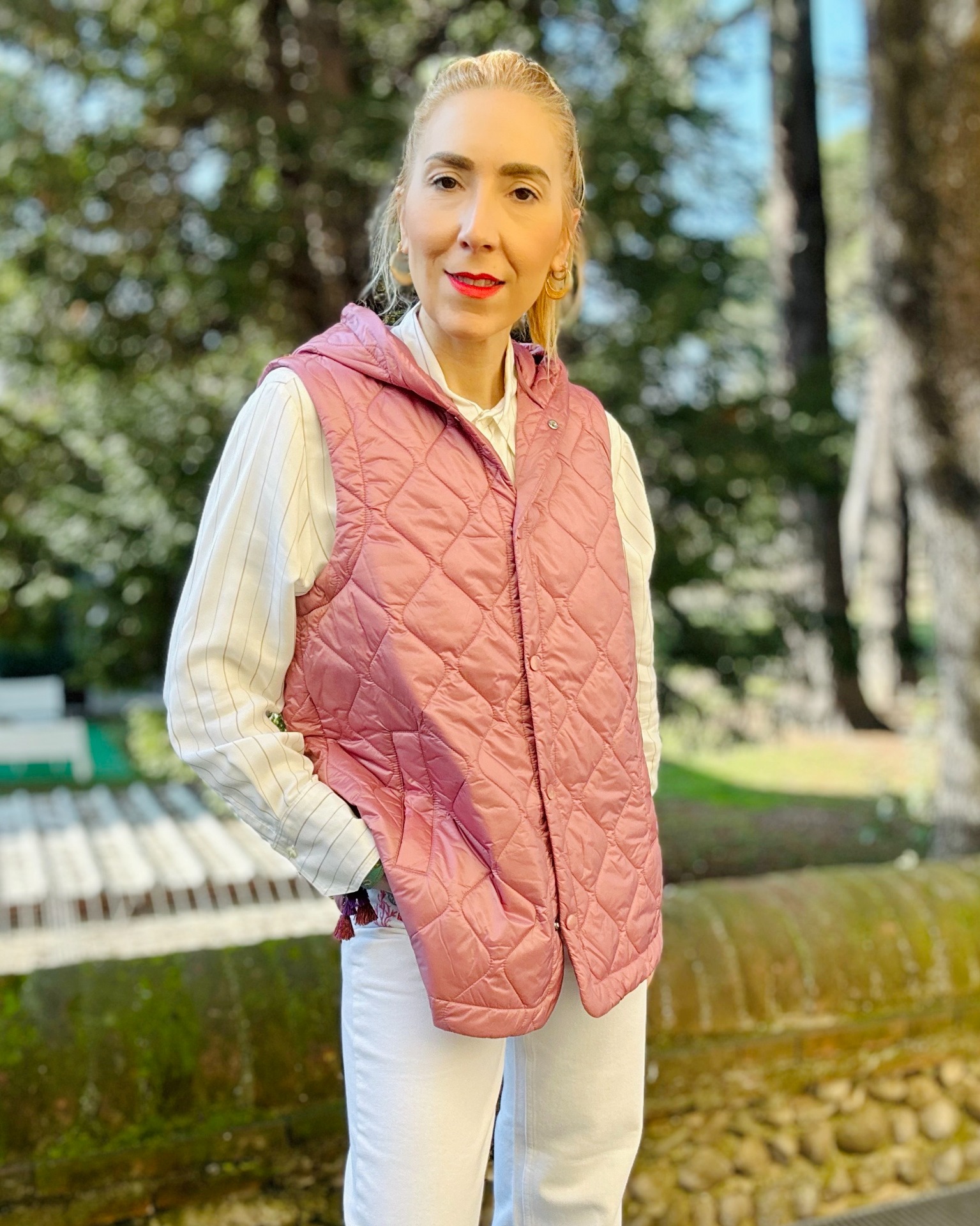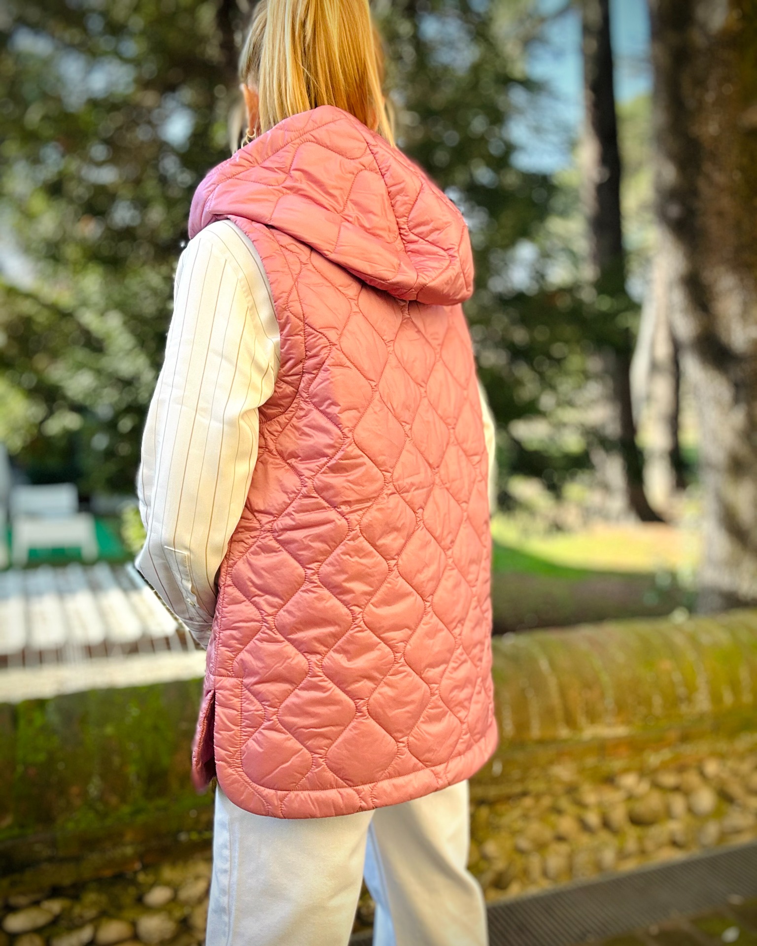 Gilet imbottito leggero dusty pink, nylon antigoccia con cappuccio.
