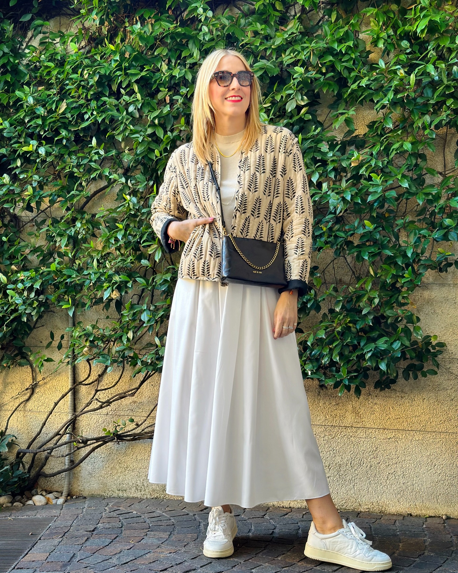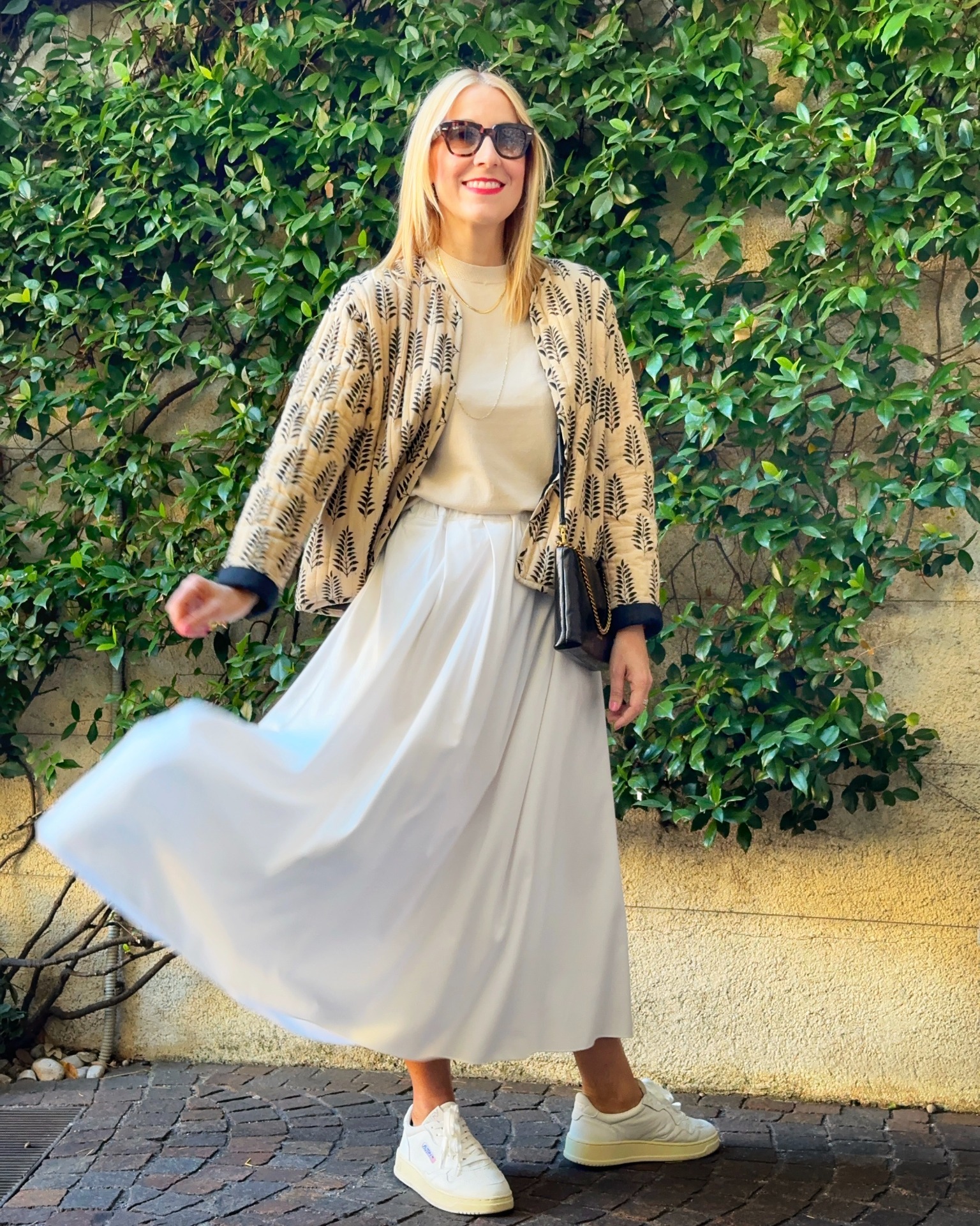Gonna color latte, morbida e corposa in viscosa 100%, elastico in vita e tasche laterali.