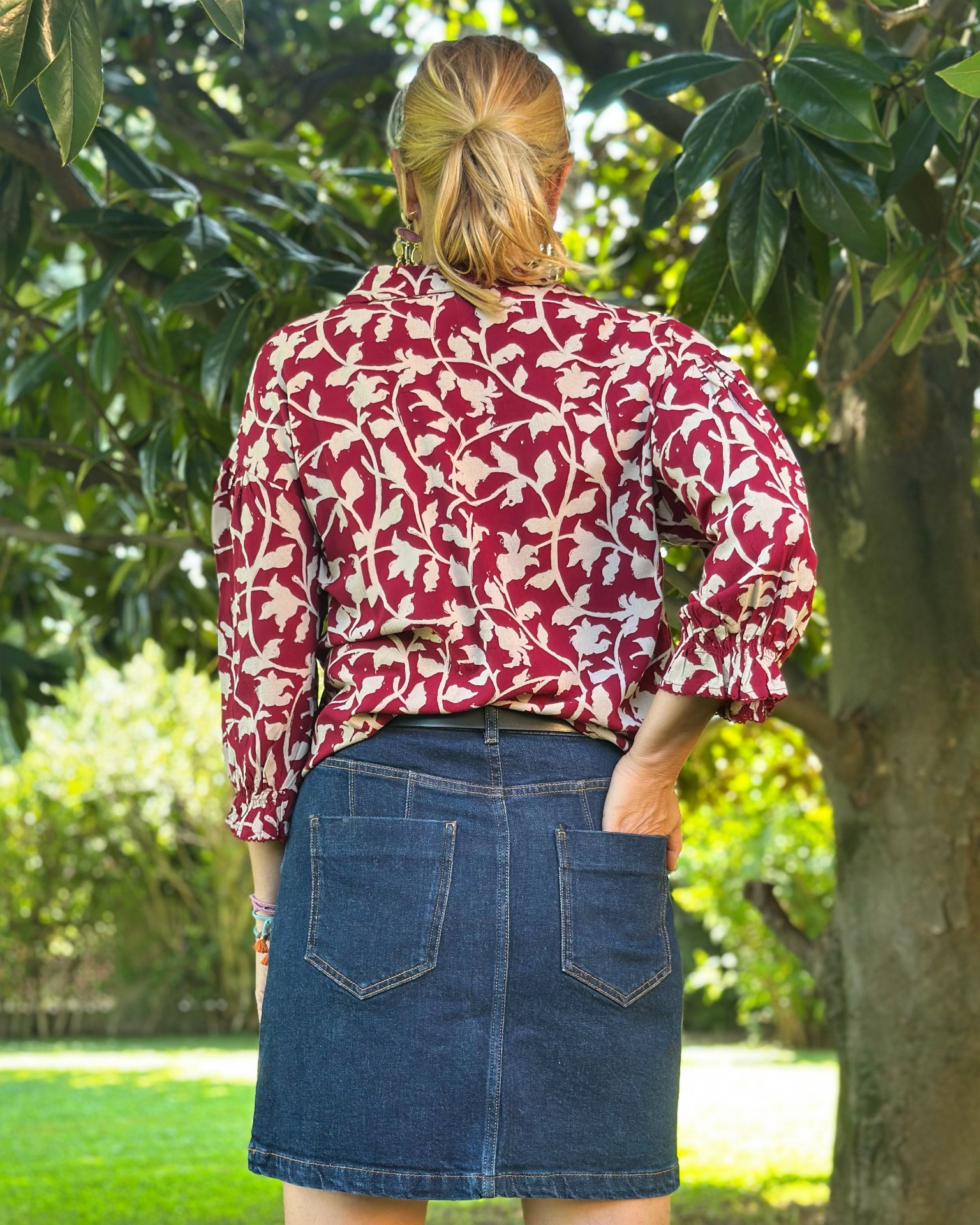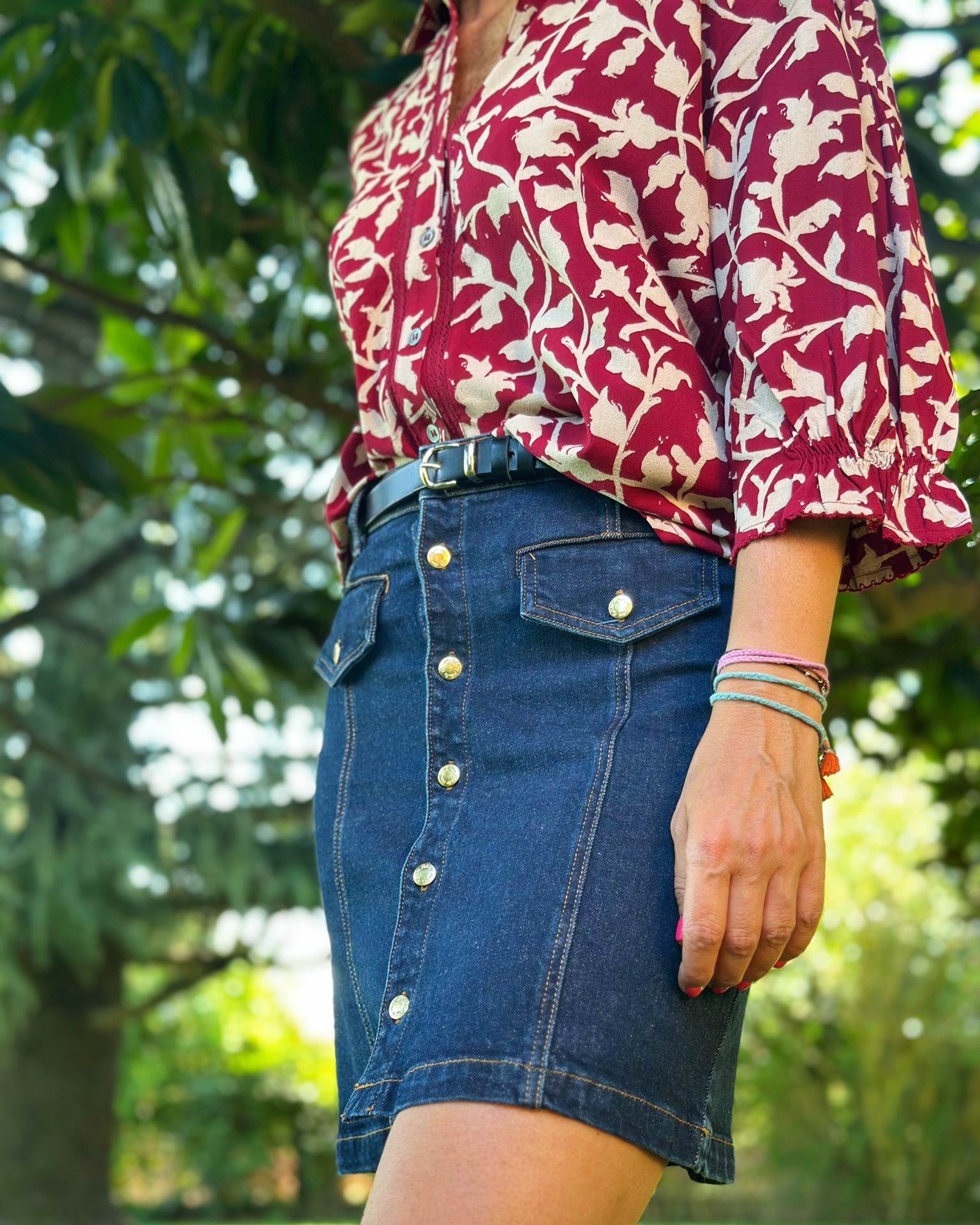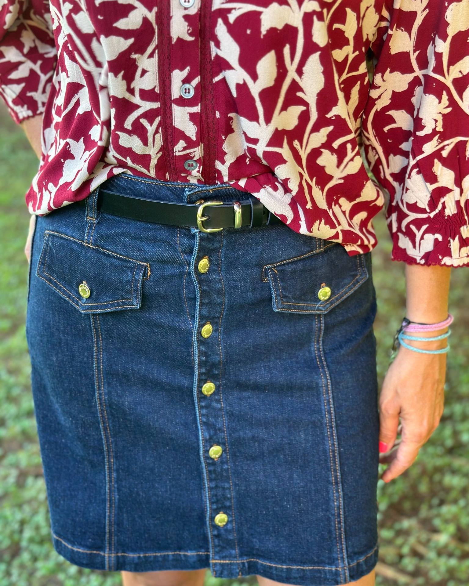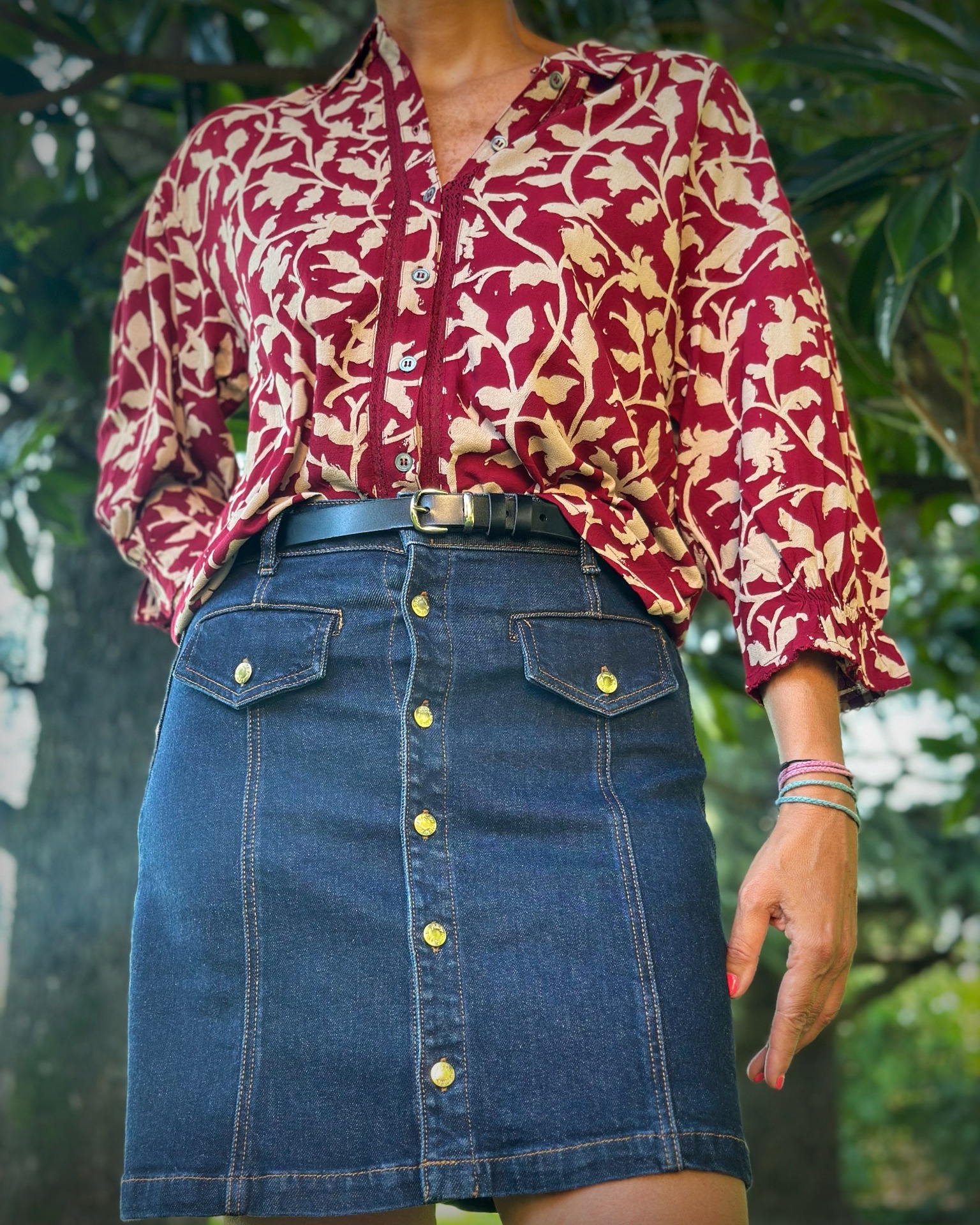 Gonna in denim 100% cotone, taschine sul davanti e bottoni gold.