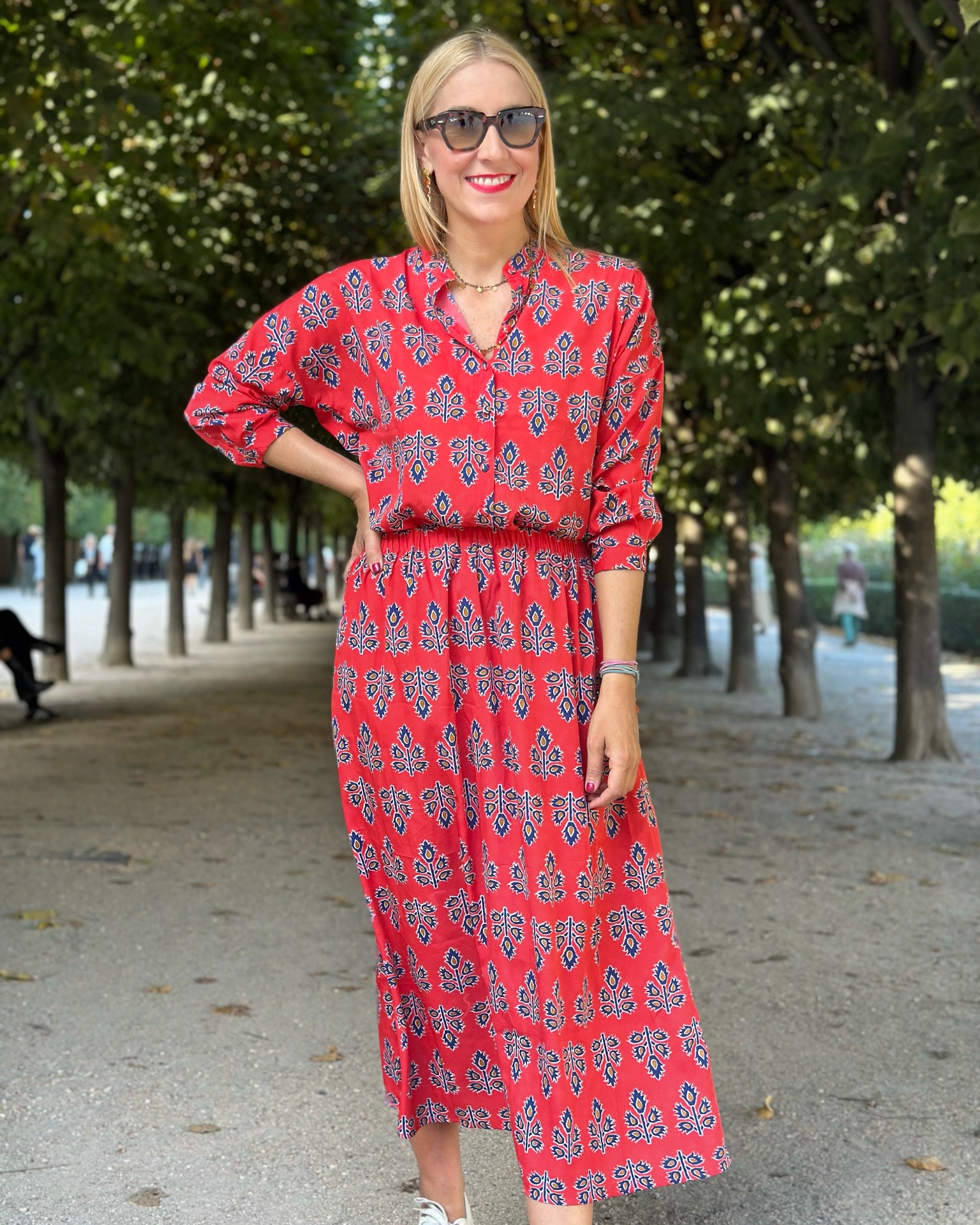 Gonna in viscosa 100%, comodo elastico in vita. Colore corallo/blu/senape