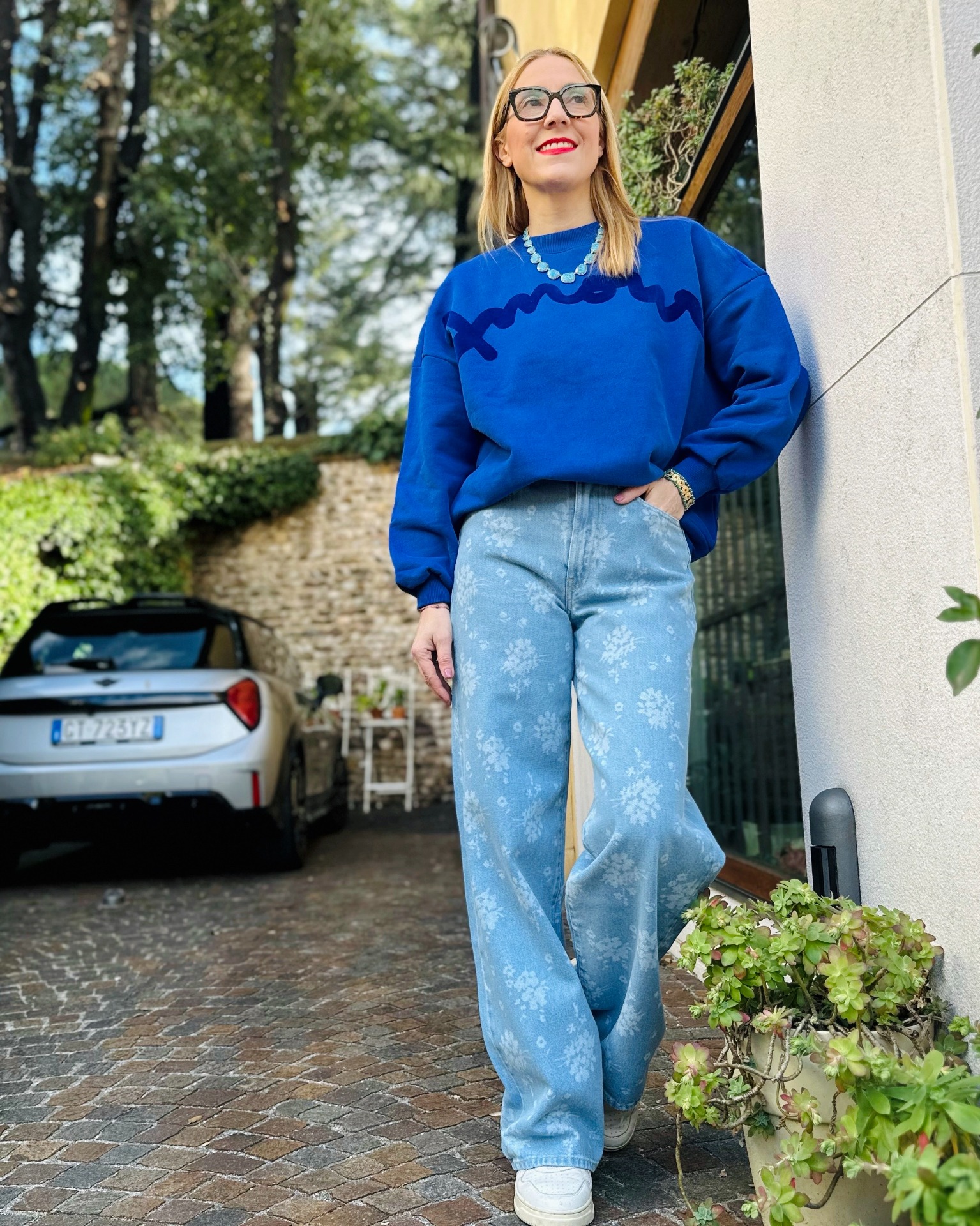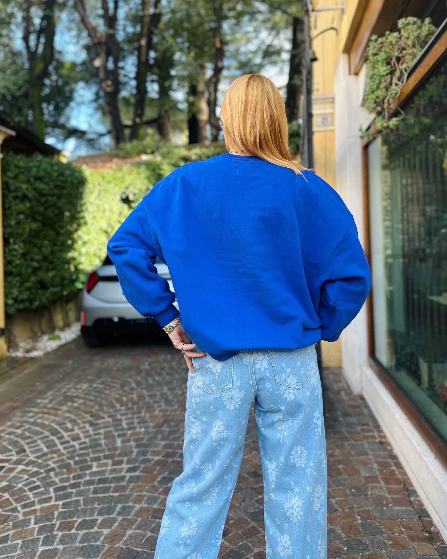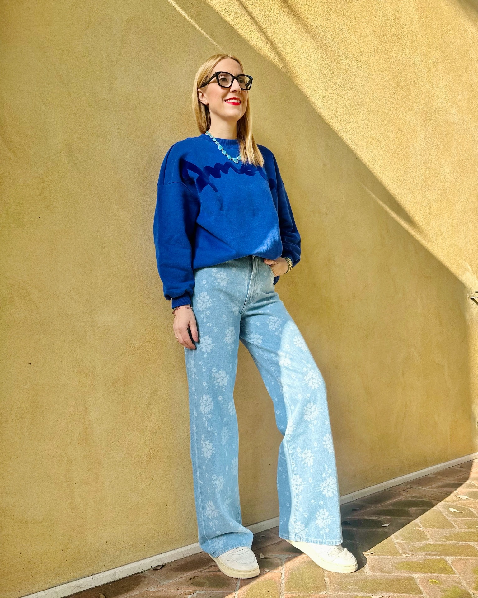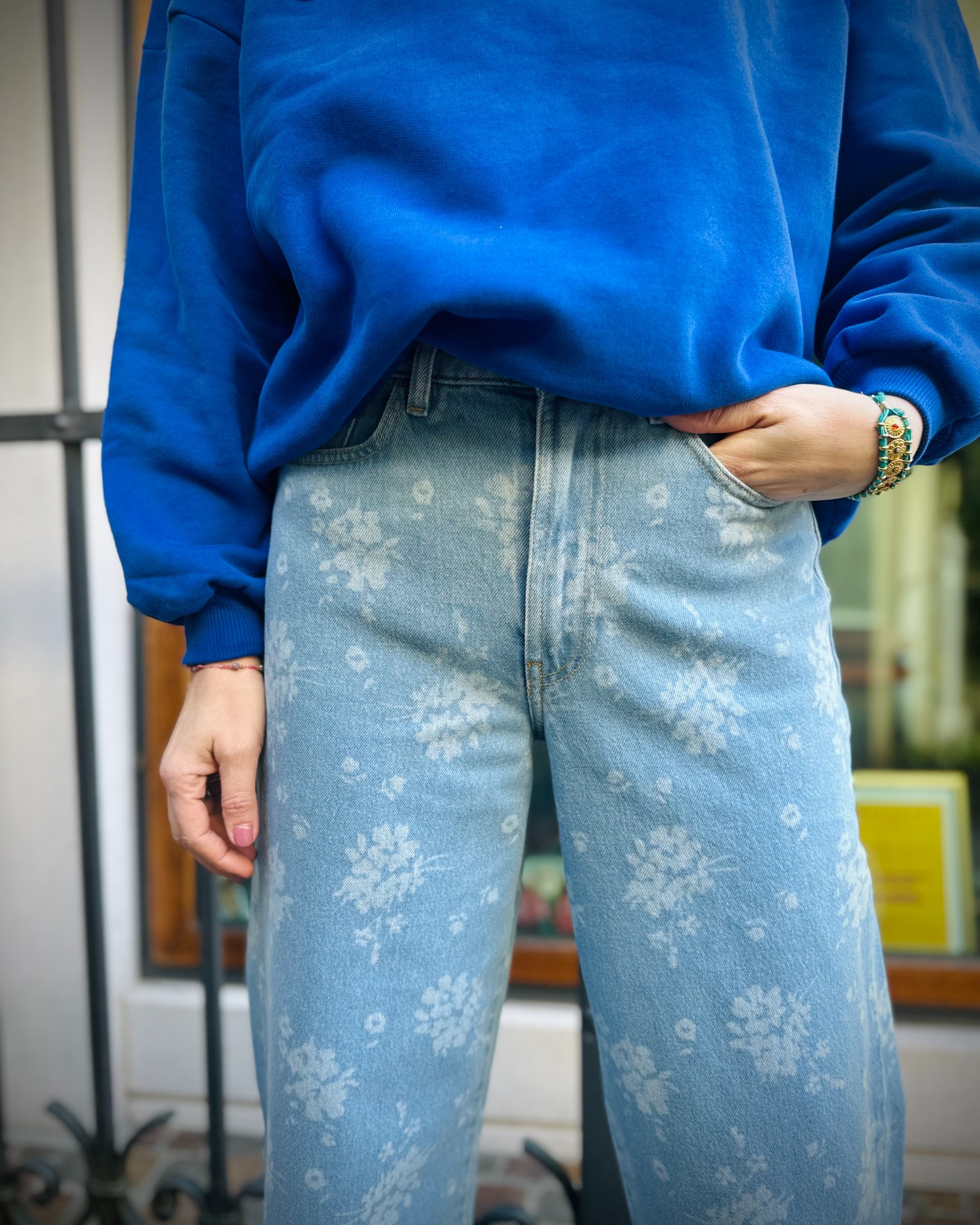 Jeans a vita alta e gamba larga svasata, silhouette moderna, motivo floreale in stile ombre realizzato al laser.