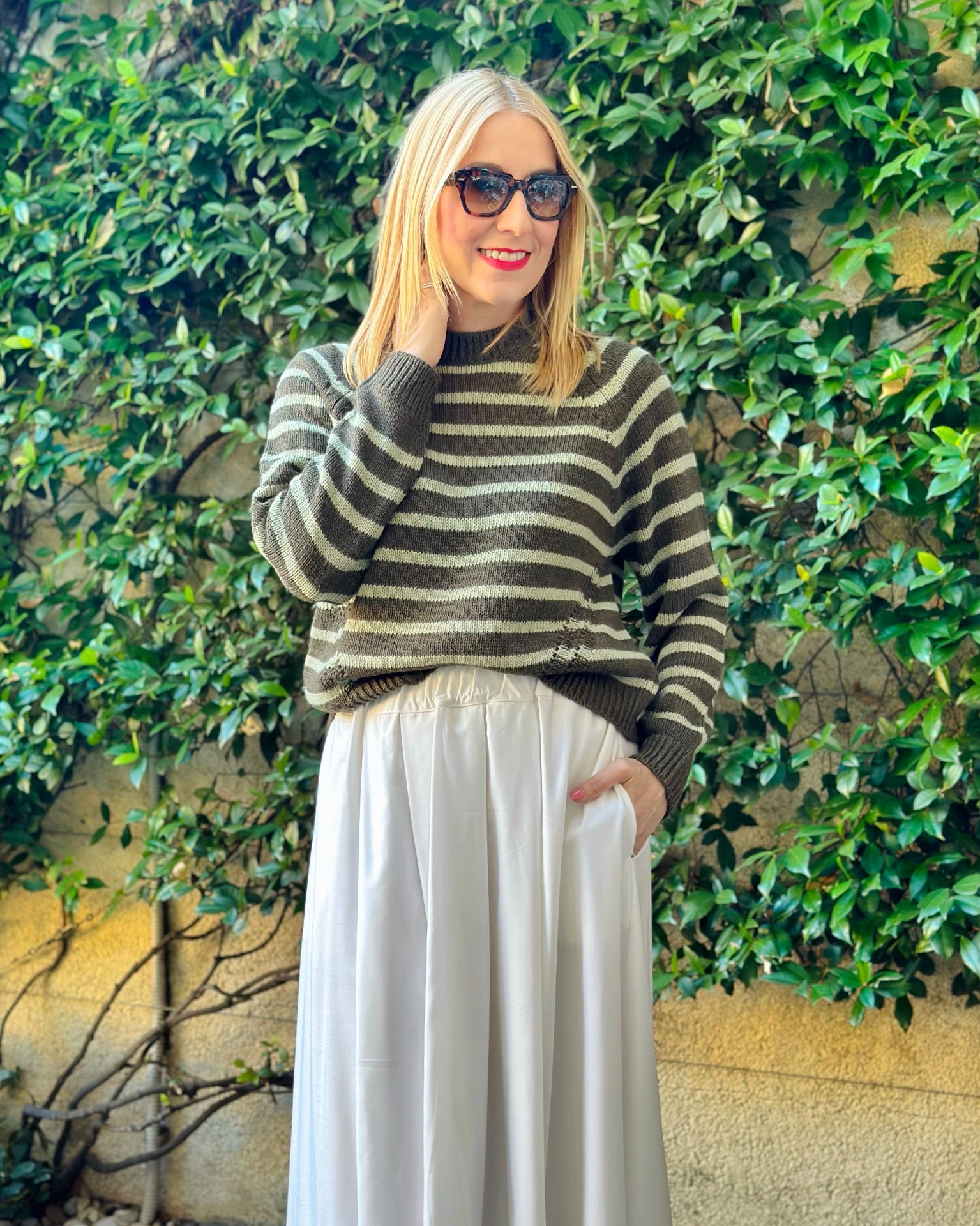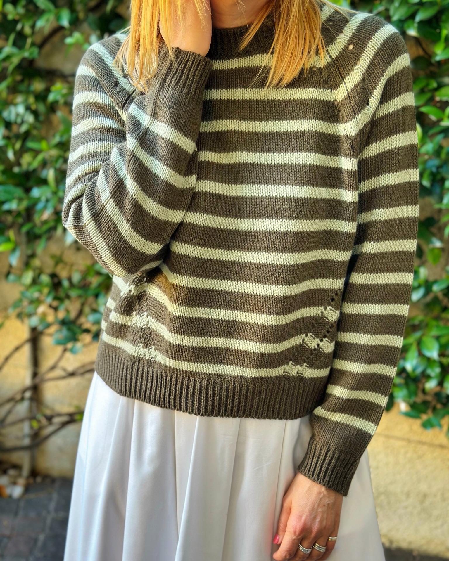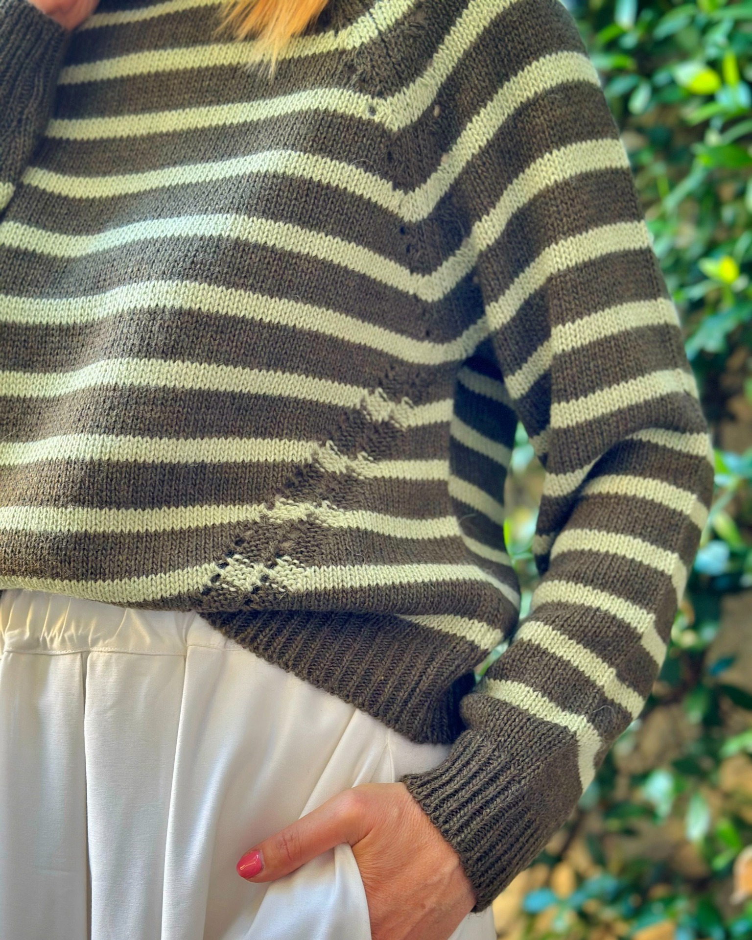 Maglia lavorata a righe verdi in misto lana, dettagli bidirezionali in vita e vestibilità morbida. Composizione: 10% lana, 10% viscosa, 5% alpaca, 75% polyacrilic.