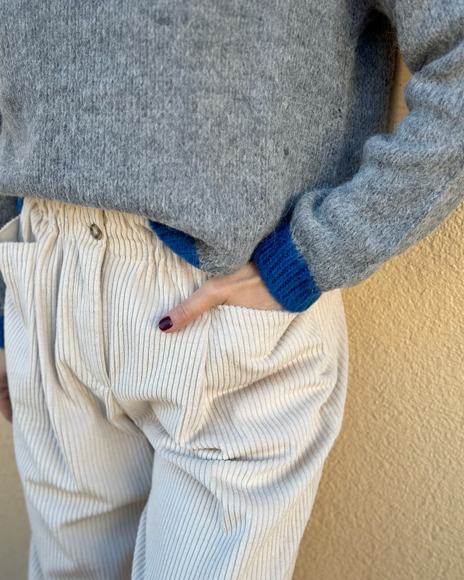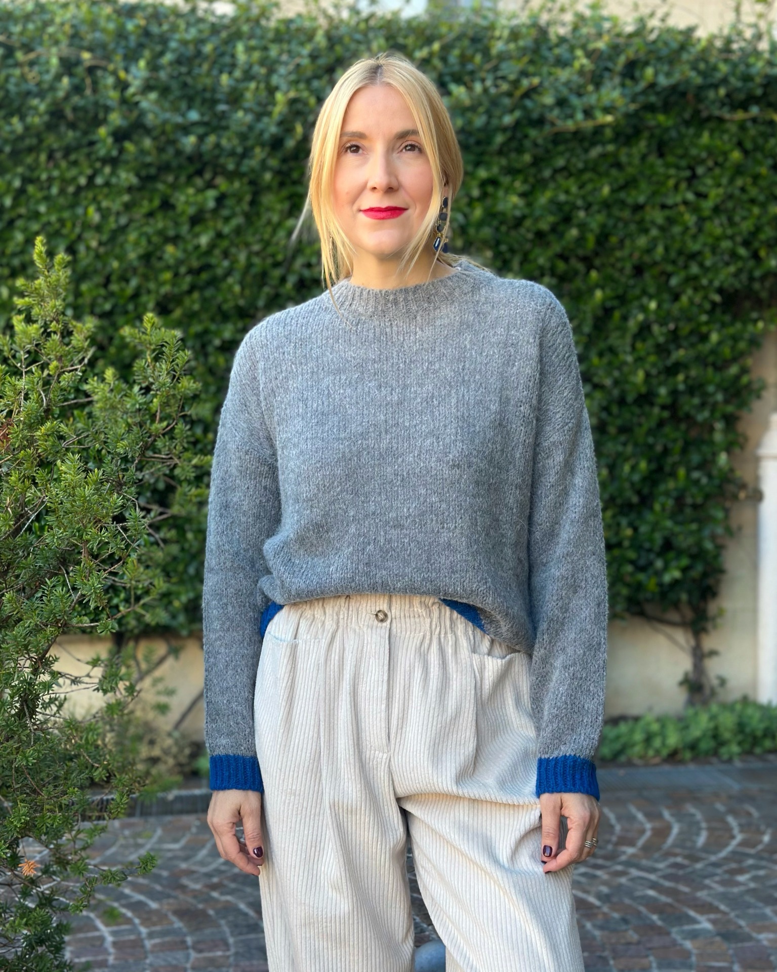 Maglia girocollo in misto lana, colore grigio, dettagli a contrasto bluette.